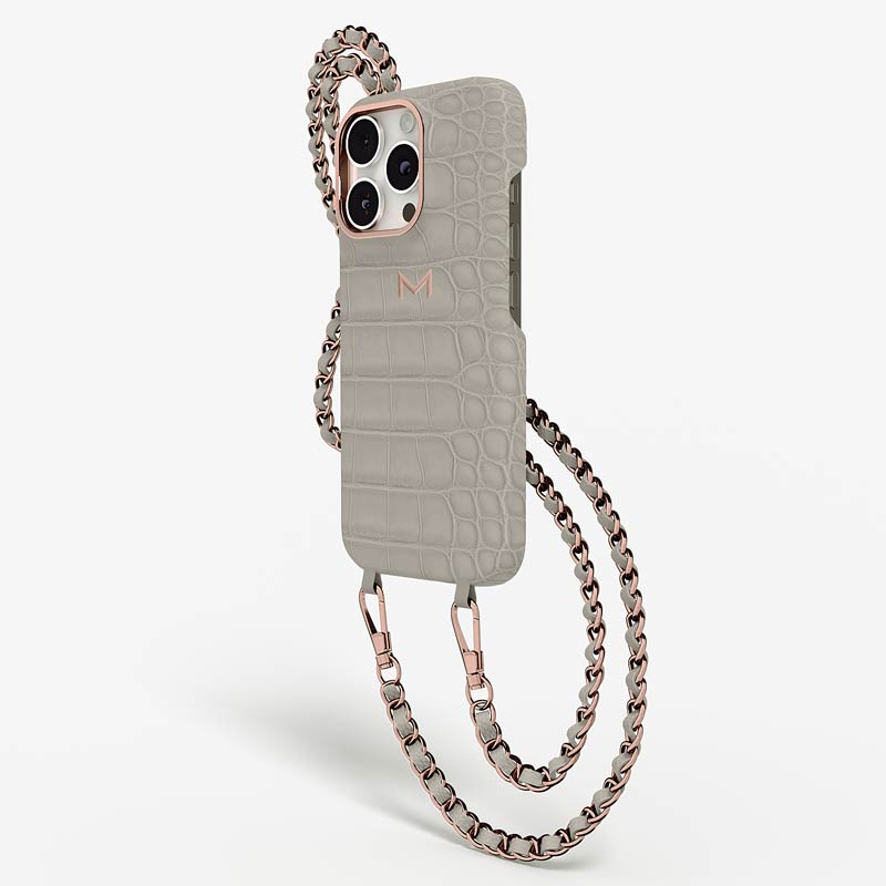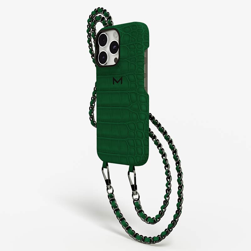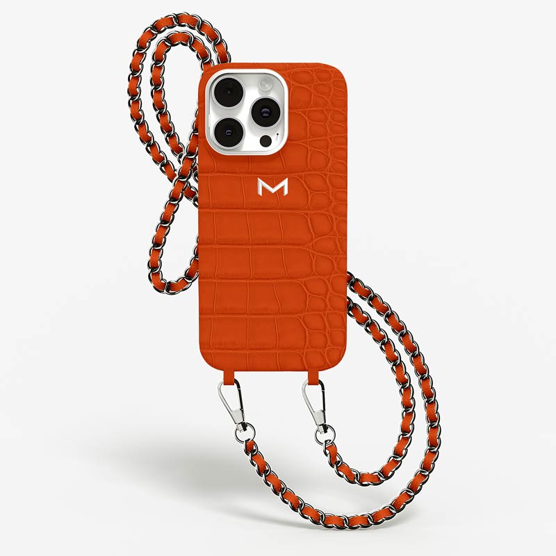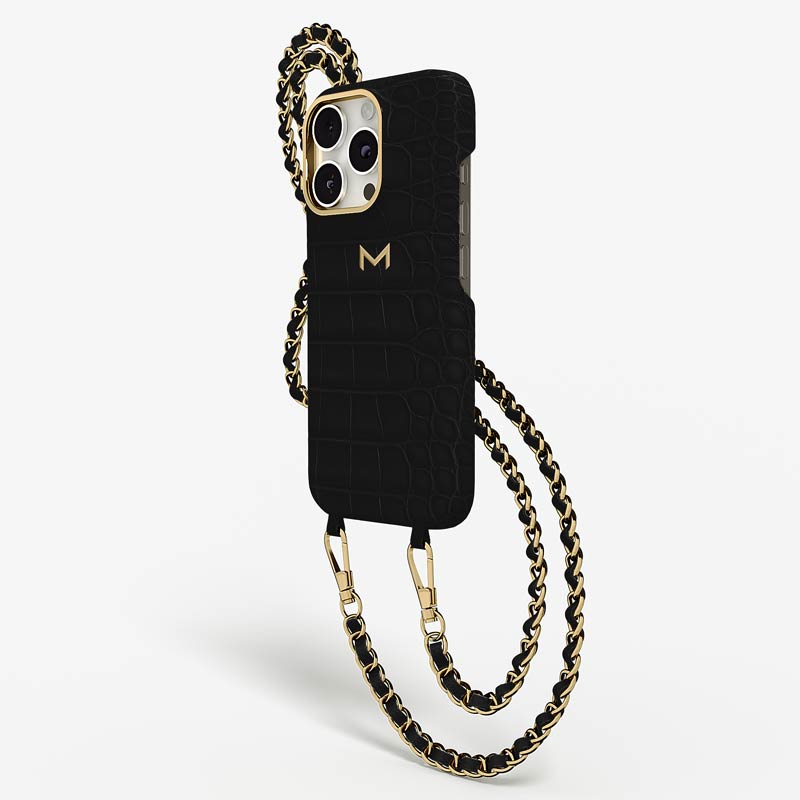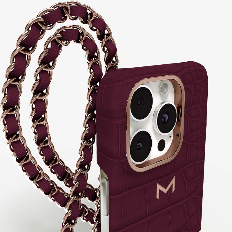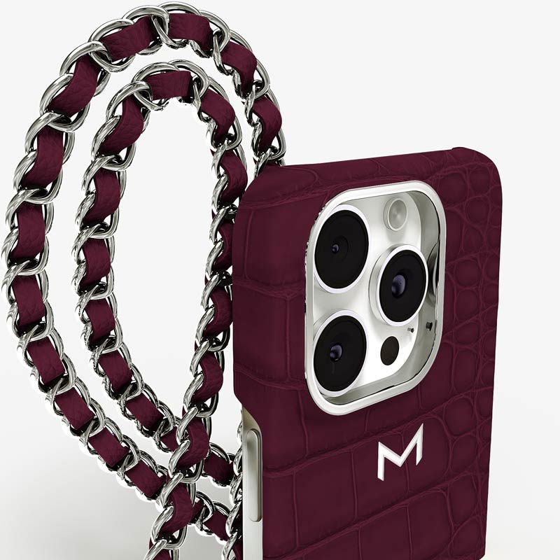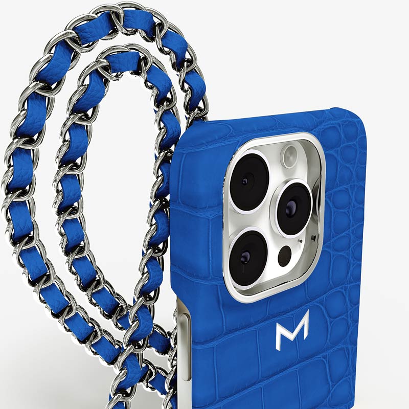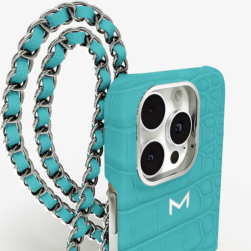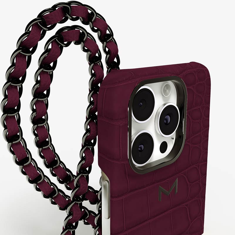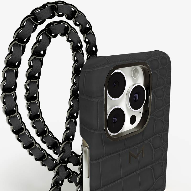 Exclusively made to order and entirely handcrafted, this iPhone 15 Pro case is sheathed in hand-selected, top-grade alligator leather — chosen for its rarity, texture, and unmistakable presence. Inside, a soft Alcantara lining cradles your device, preserving its flawless condition. The hand-polished 316L stainless steel logo and leather-interlaced metal chain reflect a commitment to detail and craftsmanship rarely seen.