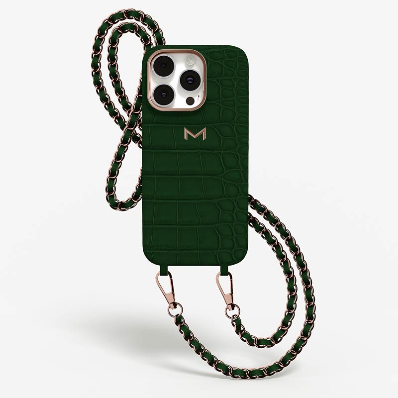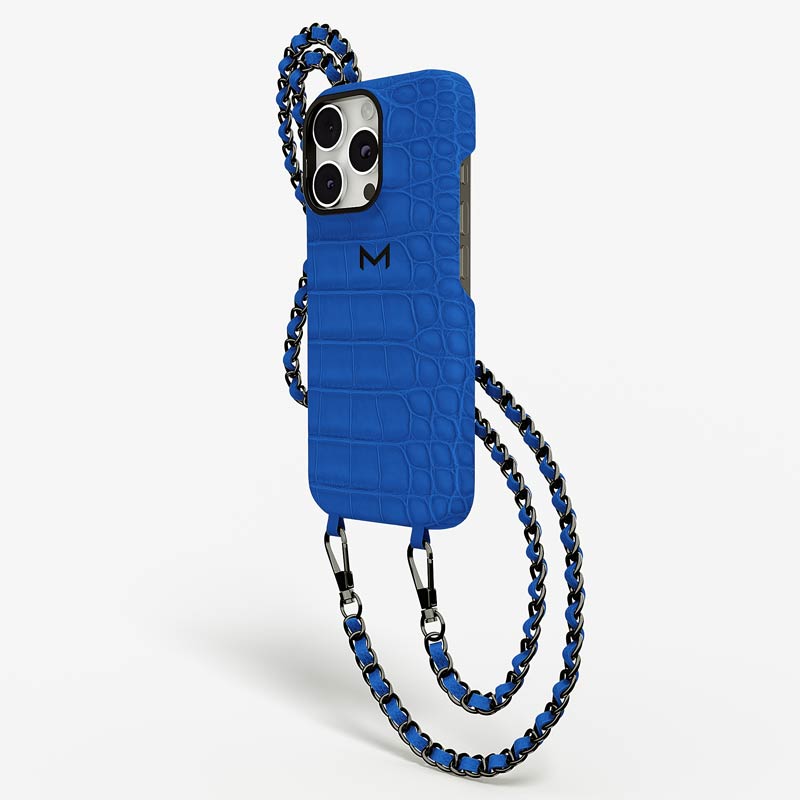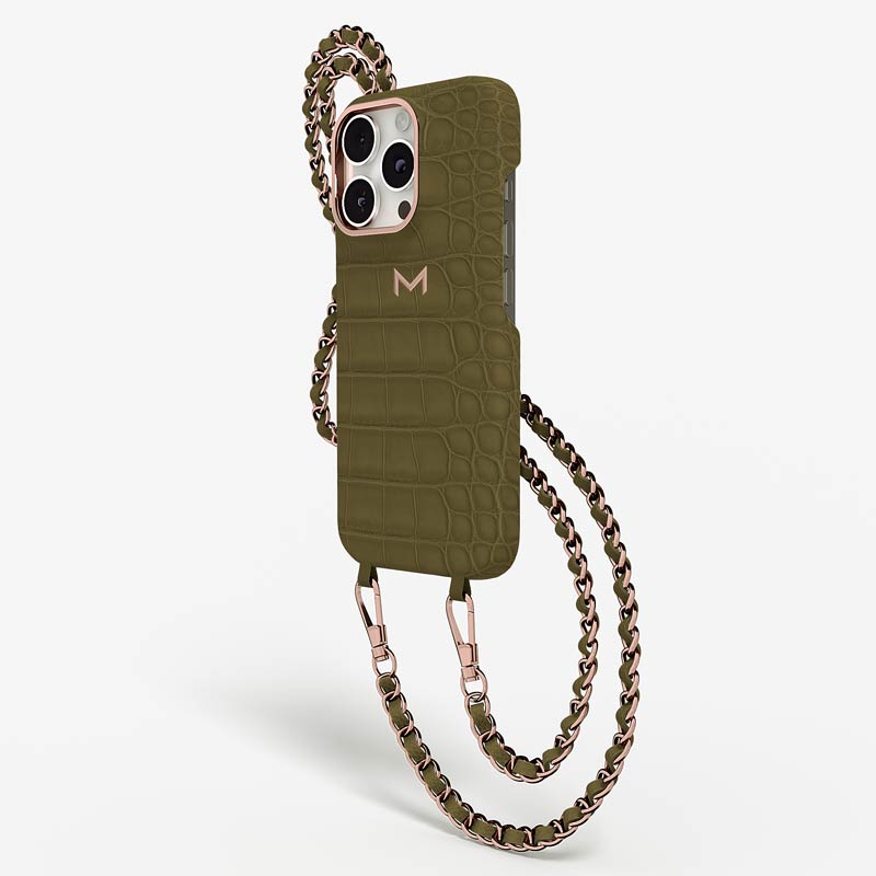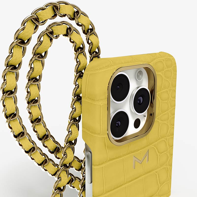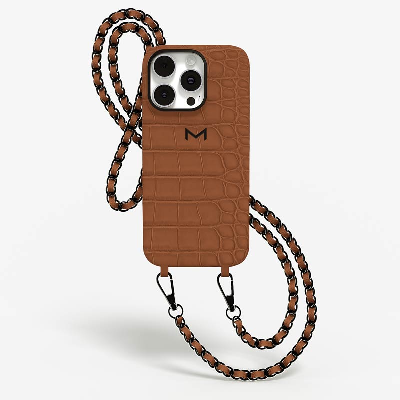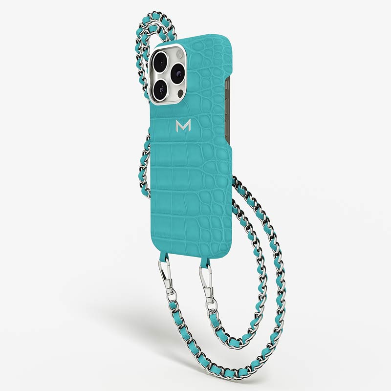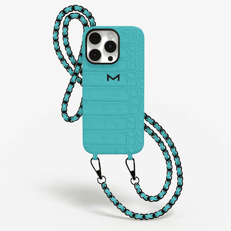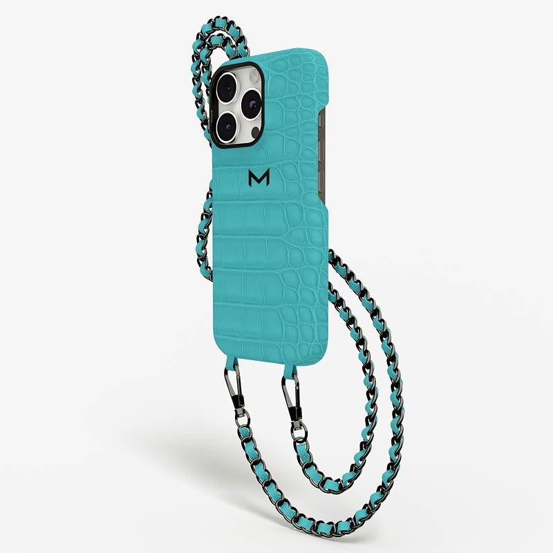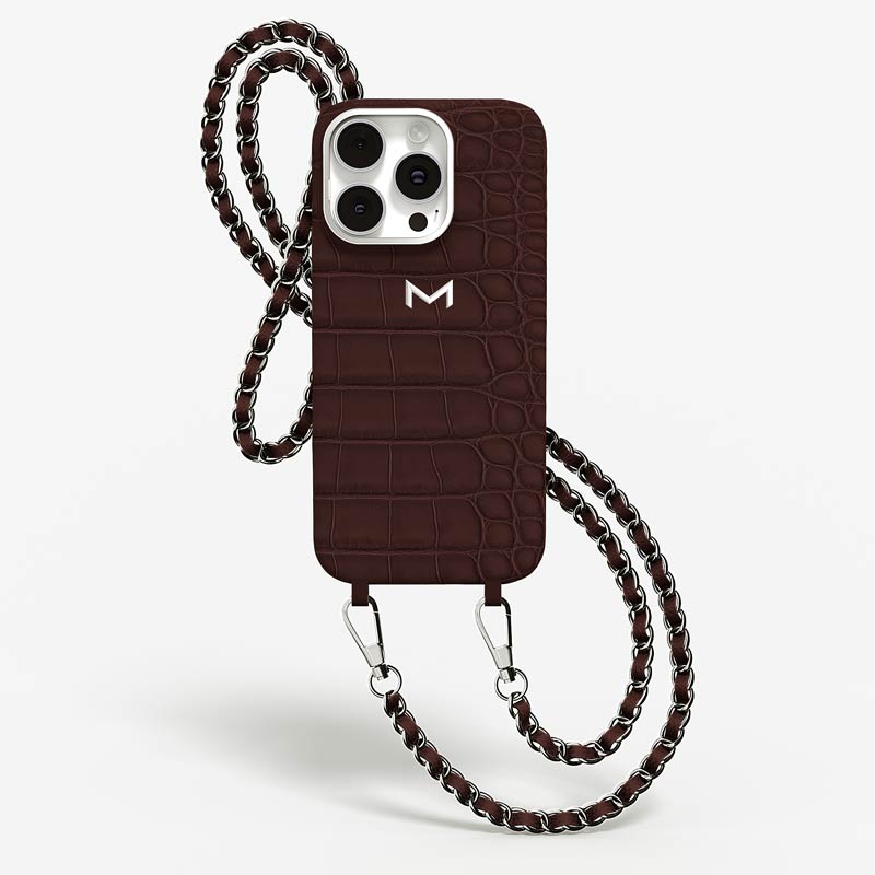 Exclusively made to order and entirely handcrafted, this iPhone 15 Pro case is sheathed in hand-selected, top-grade alligator leather — chosen for its rarity, texture, and unmistakable presence. Inside, a soft Alcantara lining cradles your device, preserving its flawless condition. The hand-polished 316L stainless steel logo and leather-interlaced metal chain reflect a commitment to detail and craftsmanship rarely seen.