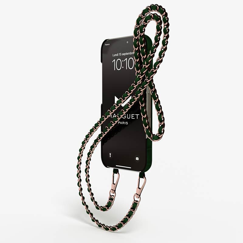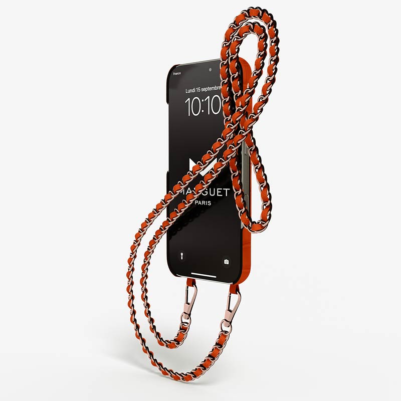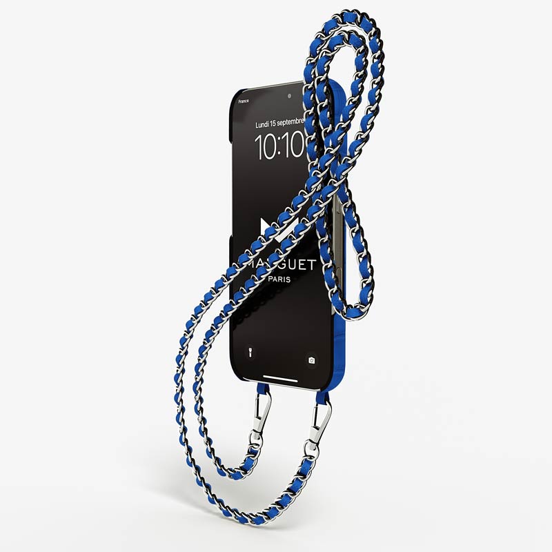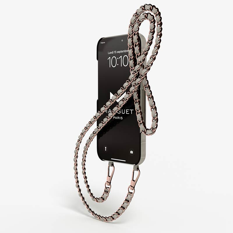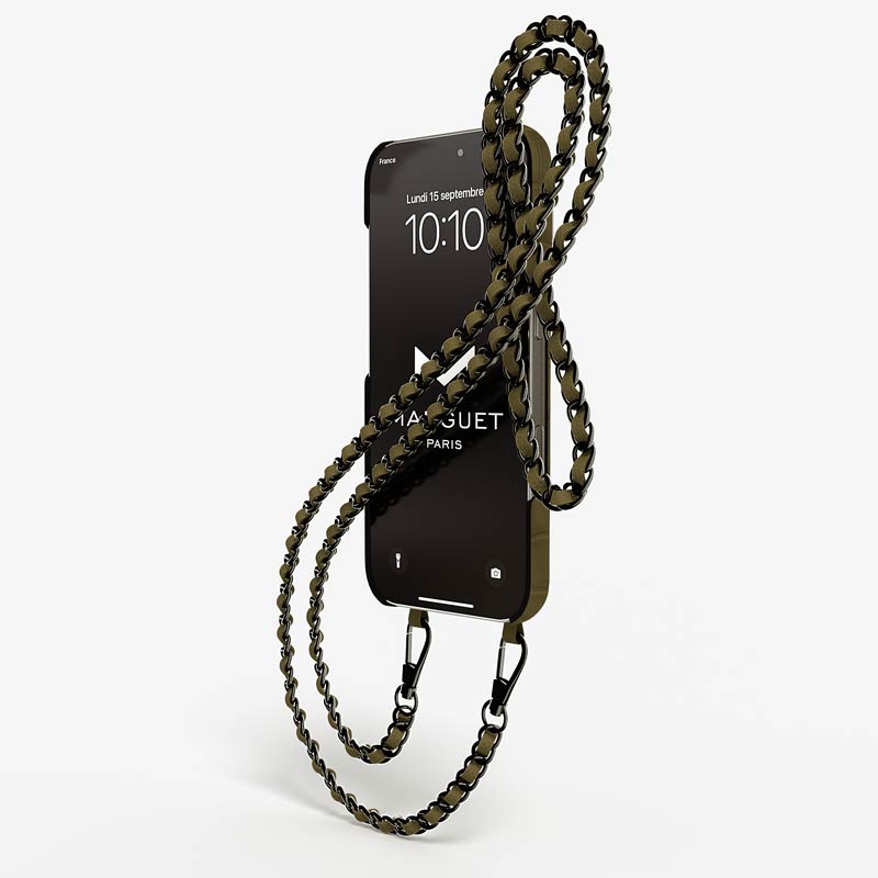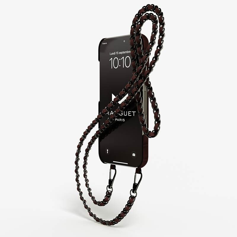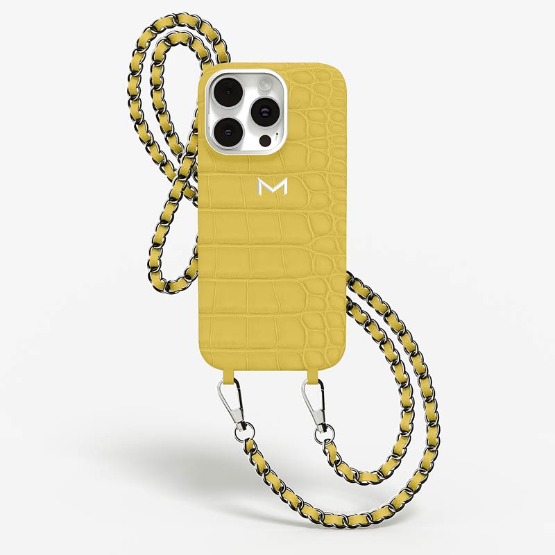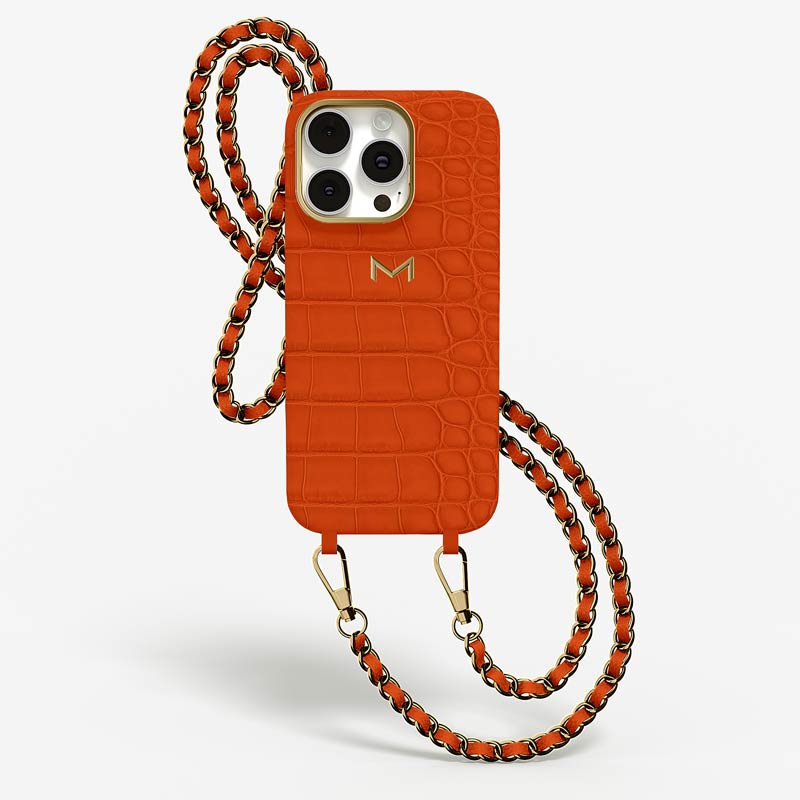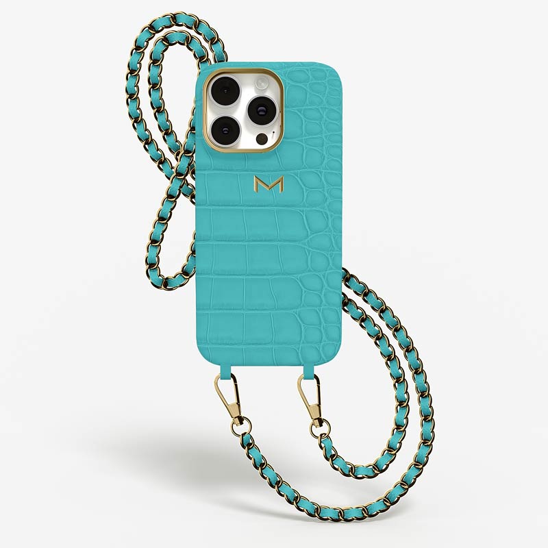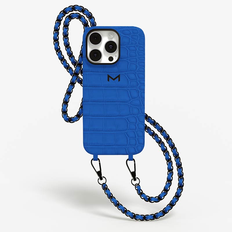 Exclusively made to order and entirely handcrafted, this iPhone 15 Pro case is sheathed in hand-selected, top-grade alligator leather — chosen for its rarity, texture, and unmistakable presence. Inside, a soft Alcantara lining cradles your device, preserving its flawless condition. The hand-polished 316L stainless steel logo and leather-interlaced metal chain reflect a commitment to detail and craftsmanship rarely seen.