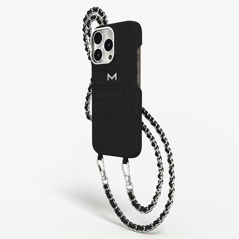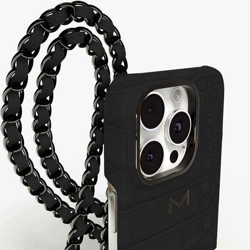 Exclusively made to order and entirely handcrafted, this iPhone 15 Pro case is sheathed in hand-selected, top-grade alligator leather — chosen for its rarity, texture, and unmistakable presence. Inside, a soft Alcantara lining cradles your device, preserving its flawless condition. The hand-polished 316L stainless steel logo and leather-interlaced metal chain reflect a commitment to detail and craftsmanship rarely seen.