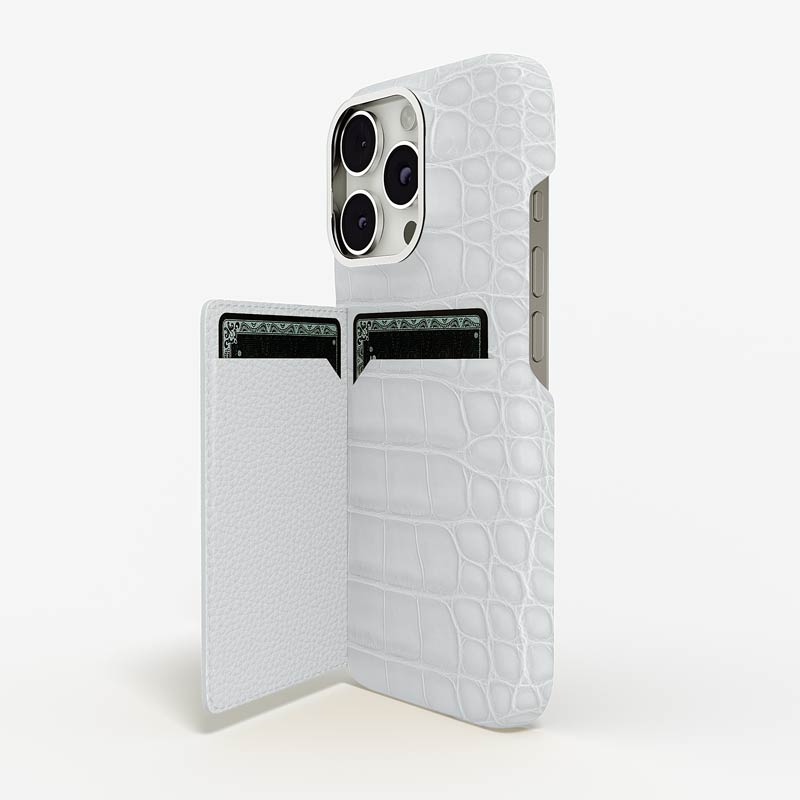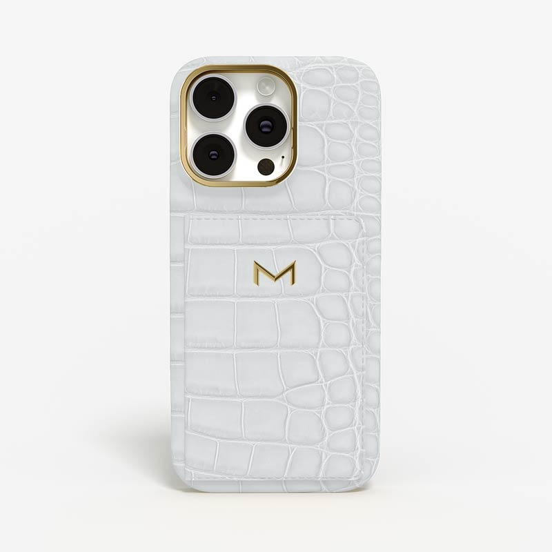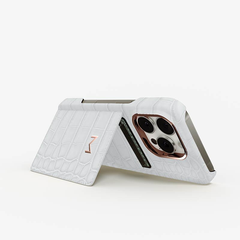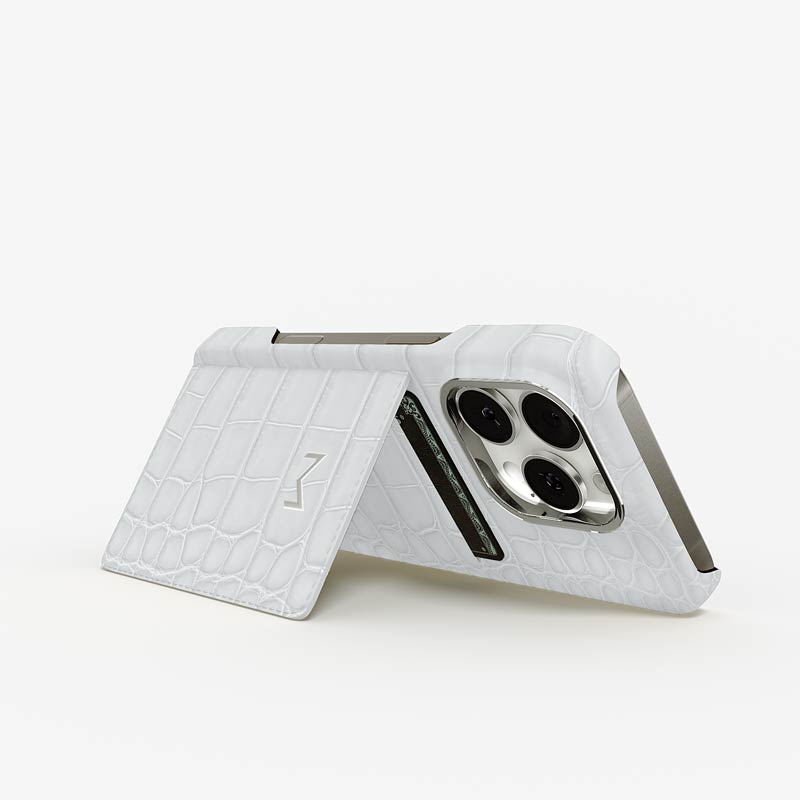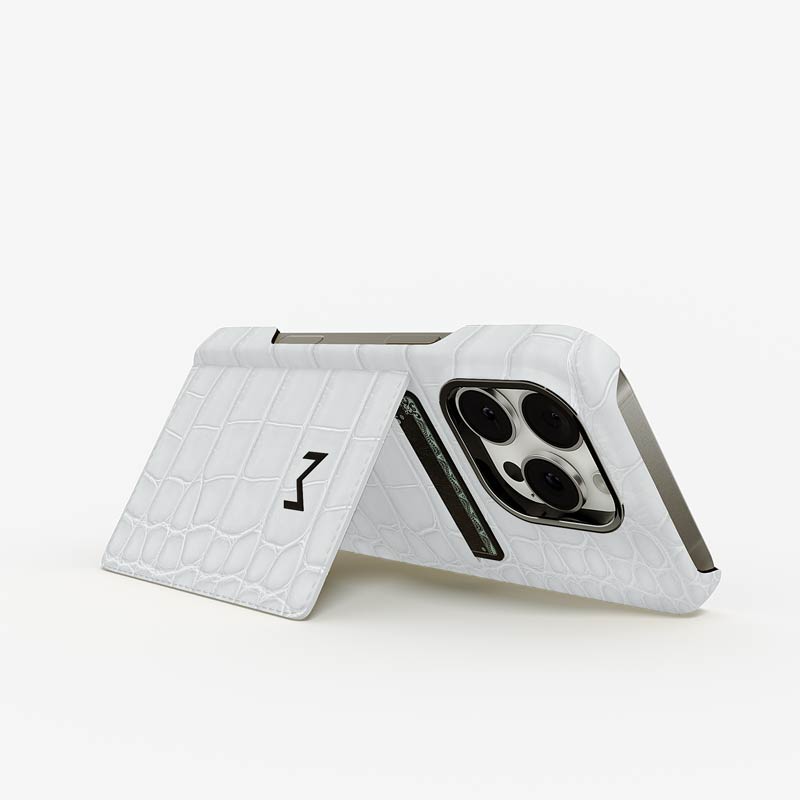 Exclusively made to order and entirely handcrafted, this iPhone 15 Pro case is sheathed in hand-selected, top-grade alligator leather — chosen for its rarity, texture, and unmistakable presence. Inside, a soft Alcantara lining cradles your device, preserving its flawless condition. The hand-polished 316L stainless steel logo and camera ring reflect a commitment to detail and craftsmanship rarely seen.