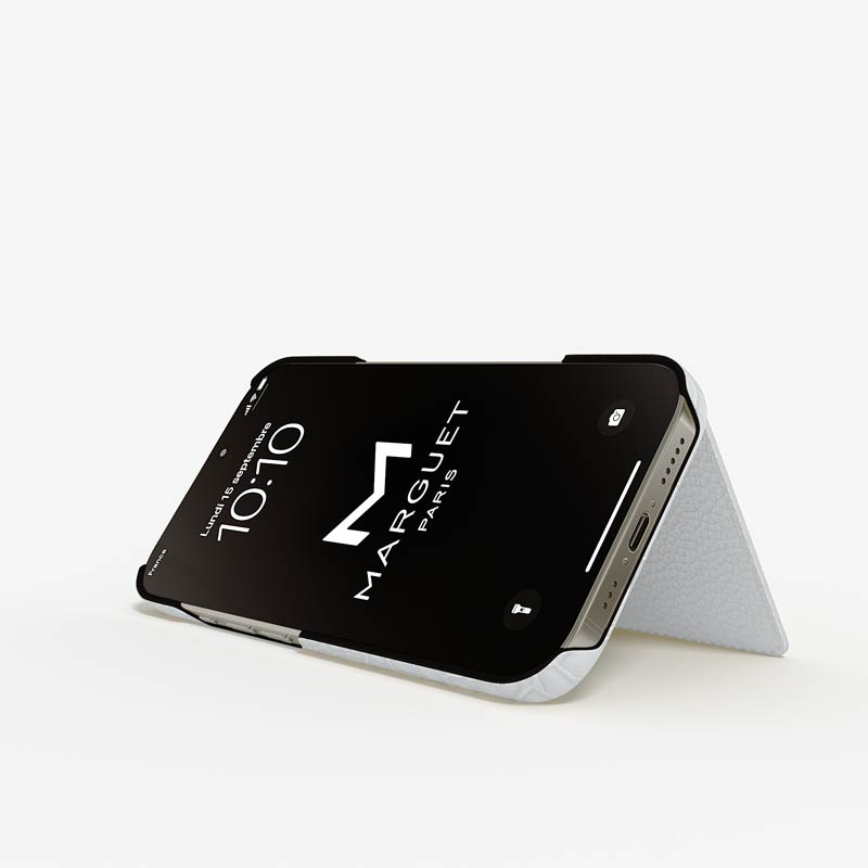 An elegant wallet design offers refined practicality, with one card slot on the case and one inside the flap. The flap also serves as a discreet stand for comfortable horizontal viewing.
