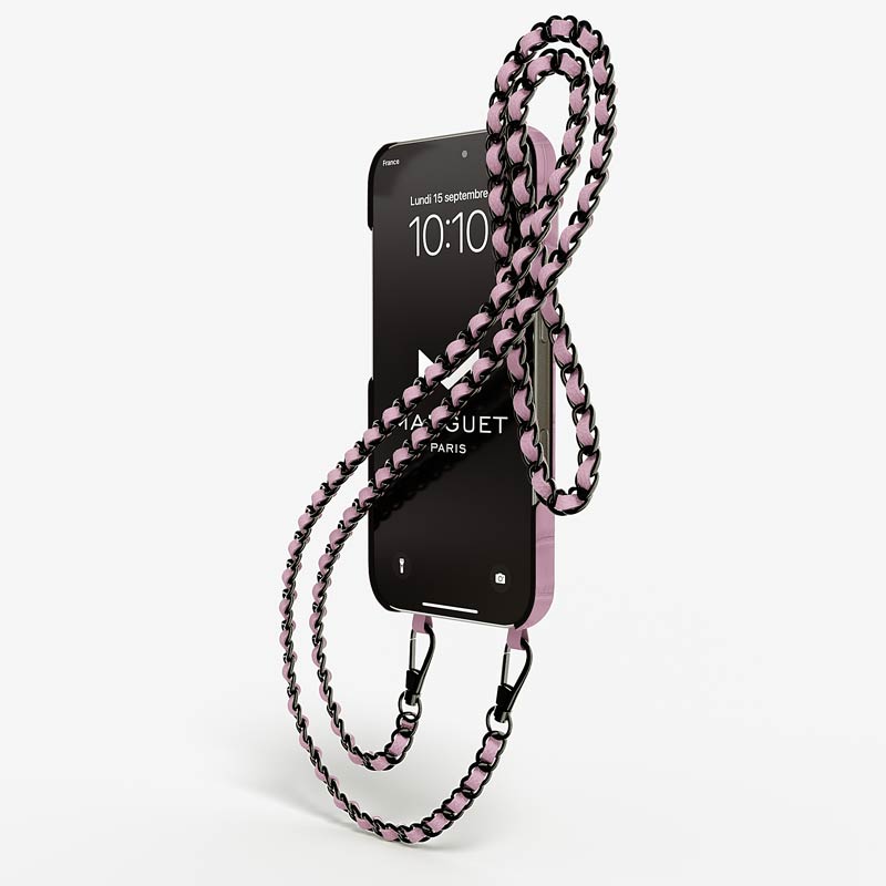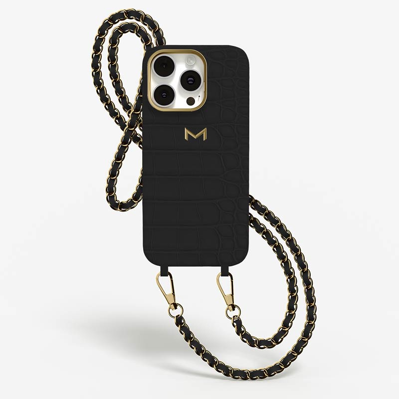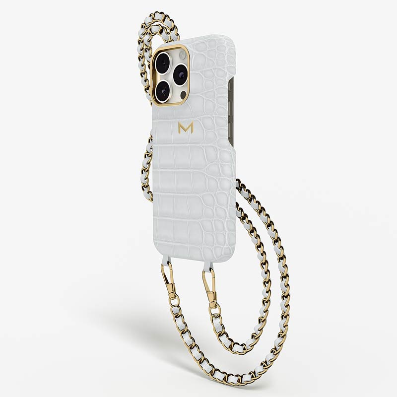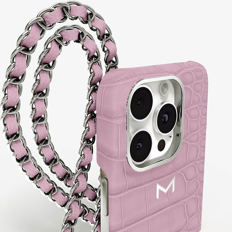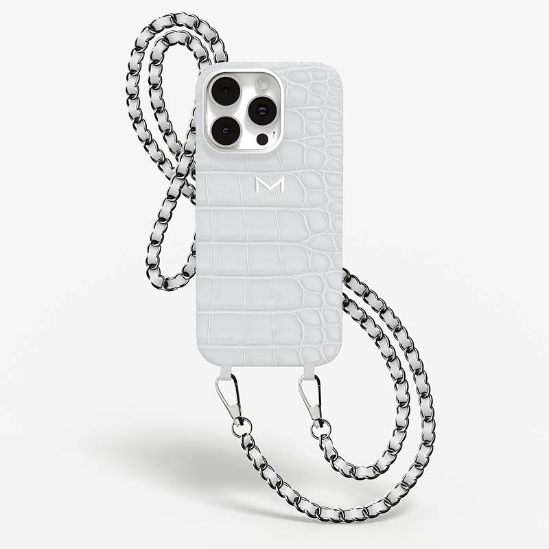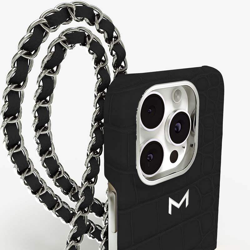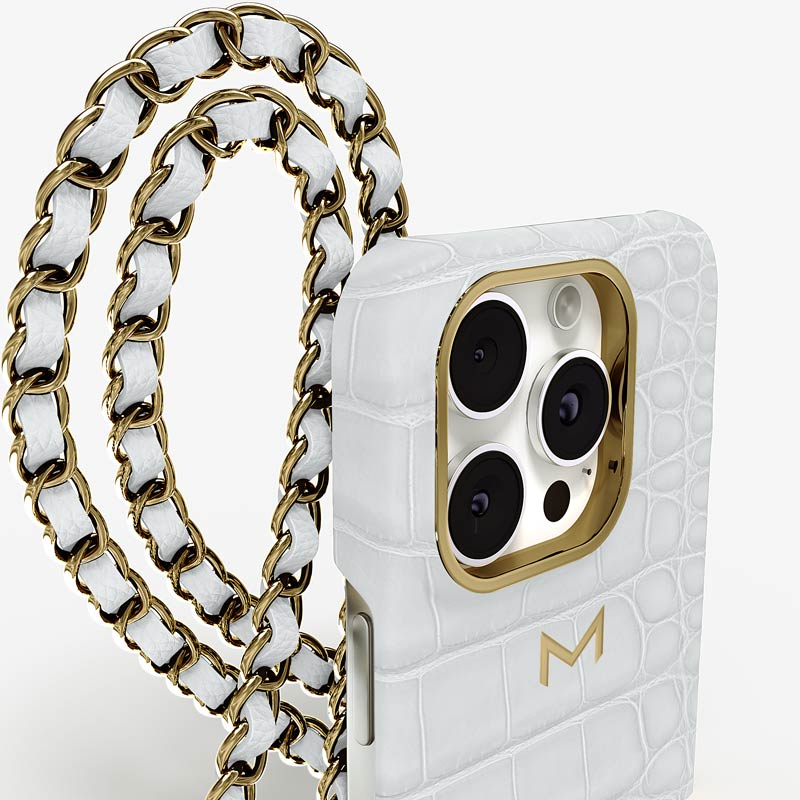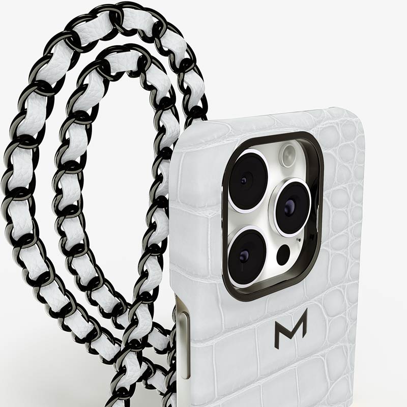 Exclusively made to order and entirely handcrafted, this iPhone 16 Pro case is sheathed in hand-selected, top-grade alligator leather — chosen for its rarity, texture, and unmistakable presence. Inside, a soft Alcantara lining cradles your device, preserving its flawless condition. The hand-polished 316L stainless steel logo and leather-interlaced metal chain reflect a commitment to detail and craftsmanship rarely seen.