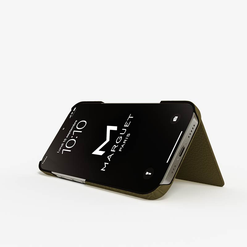 An elegant wallet design offers refined practicality, with one card slot on the case and one inside the flap. The flap also serves as a discreet stand for comfortable horizontal viewing.