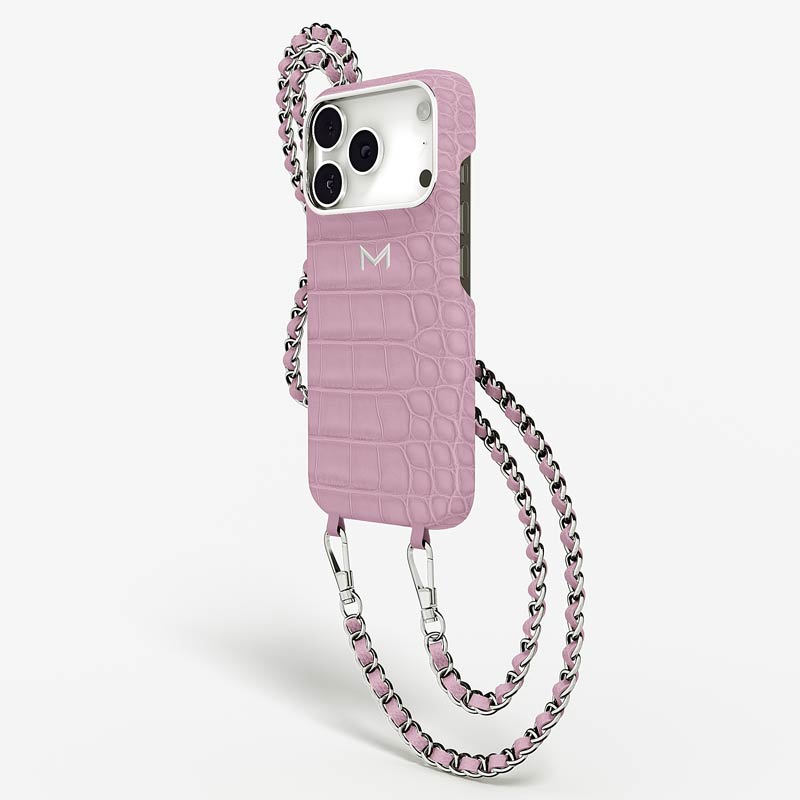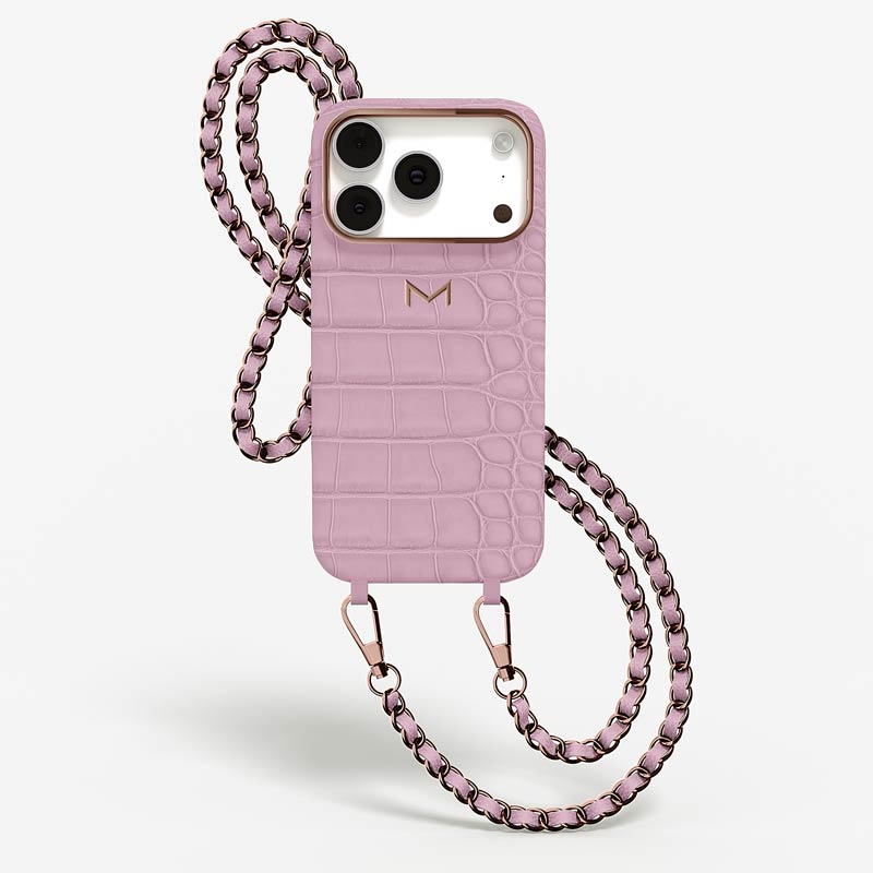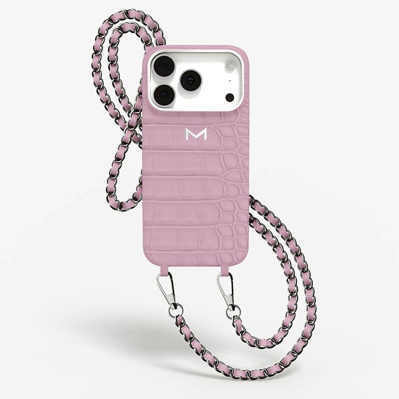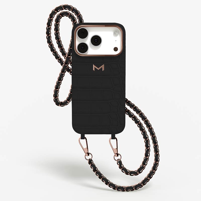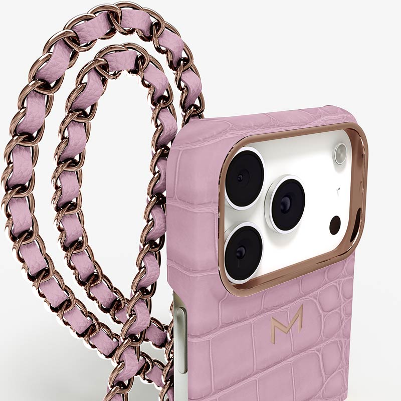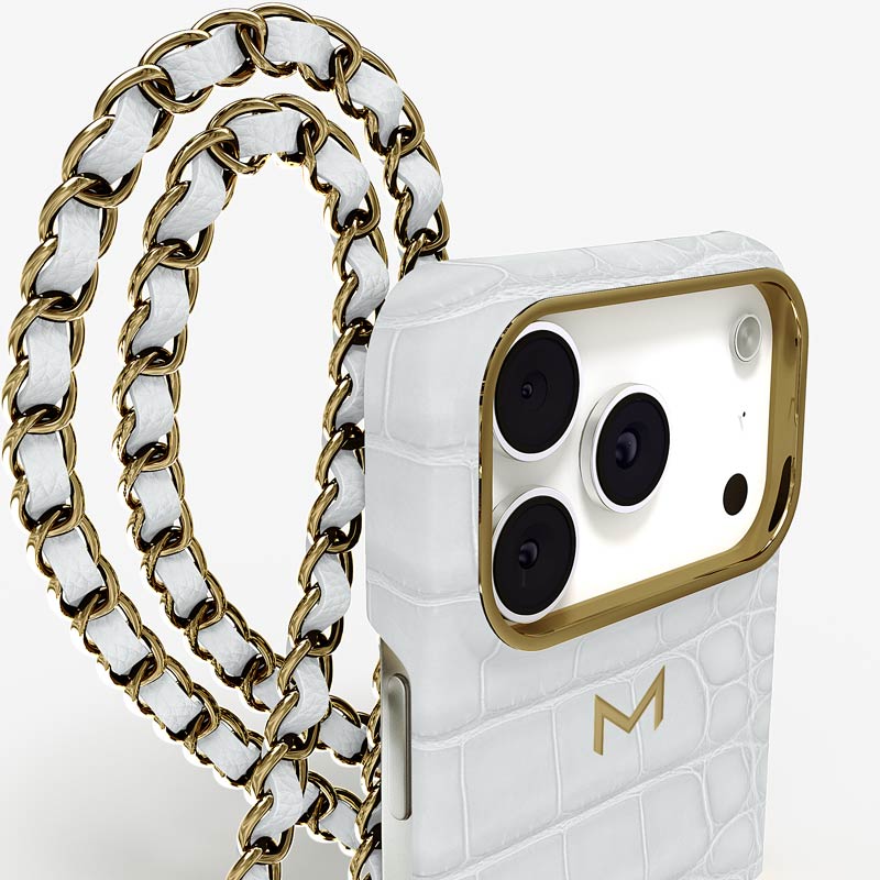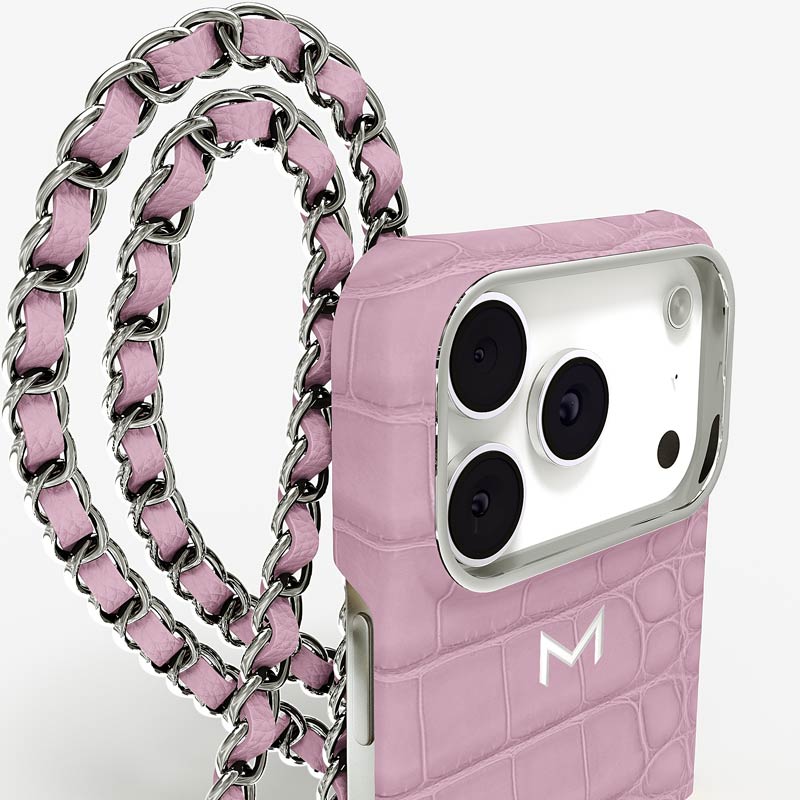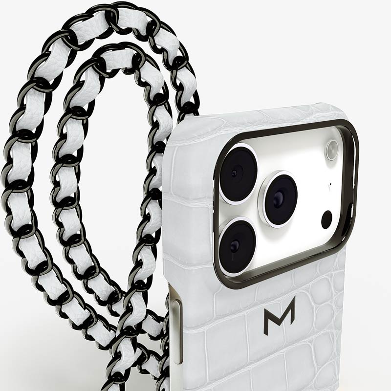 Exclusively made to order and entirely handcrafted, this iPhone 17 Pro case is sheathed in hand-selected, top-grade alligator leather — chosen for its rarity, texture, and unmistakable presence. Inside, a soft Alcantara lining cradles your device, preserving its flawless condition. The hand-polished 316L stainless steel logo and leather-interlaced metal chain reflect a commitment to detail and craftsmanship rarely seen.