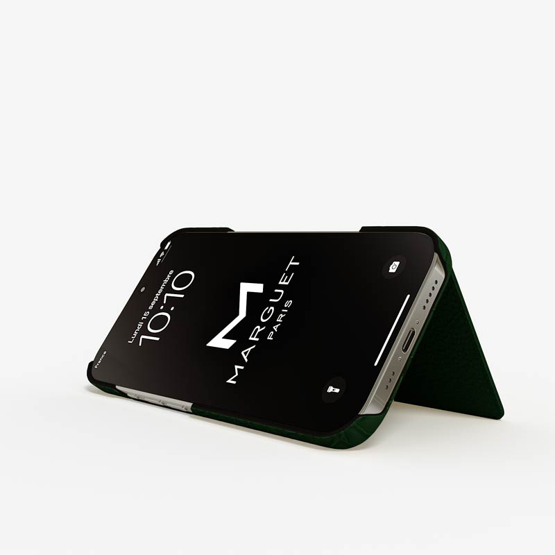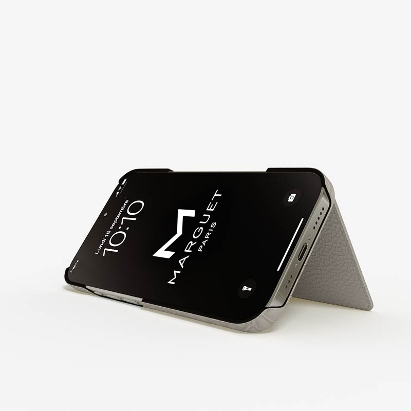 An elegant wallet design offers refined practicality, with one card slot on the case and one inside the flap. The flap also serves as a discreet stand for comfortable horizontal viewing.