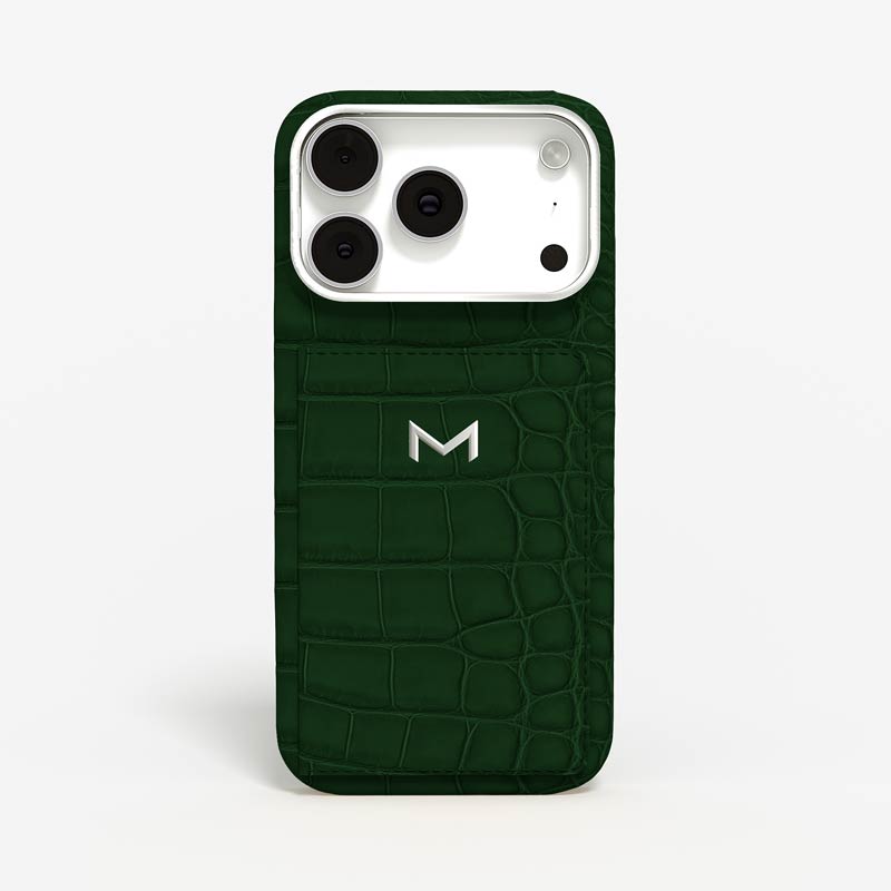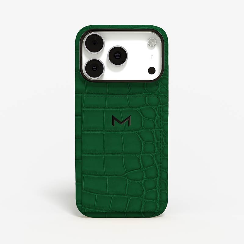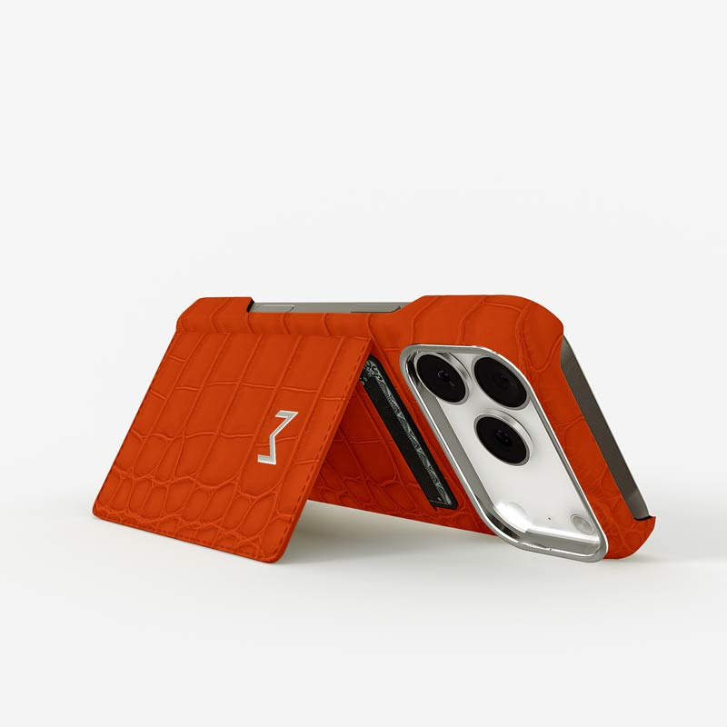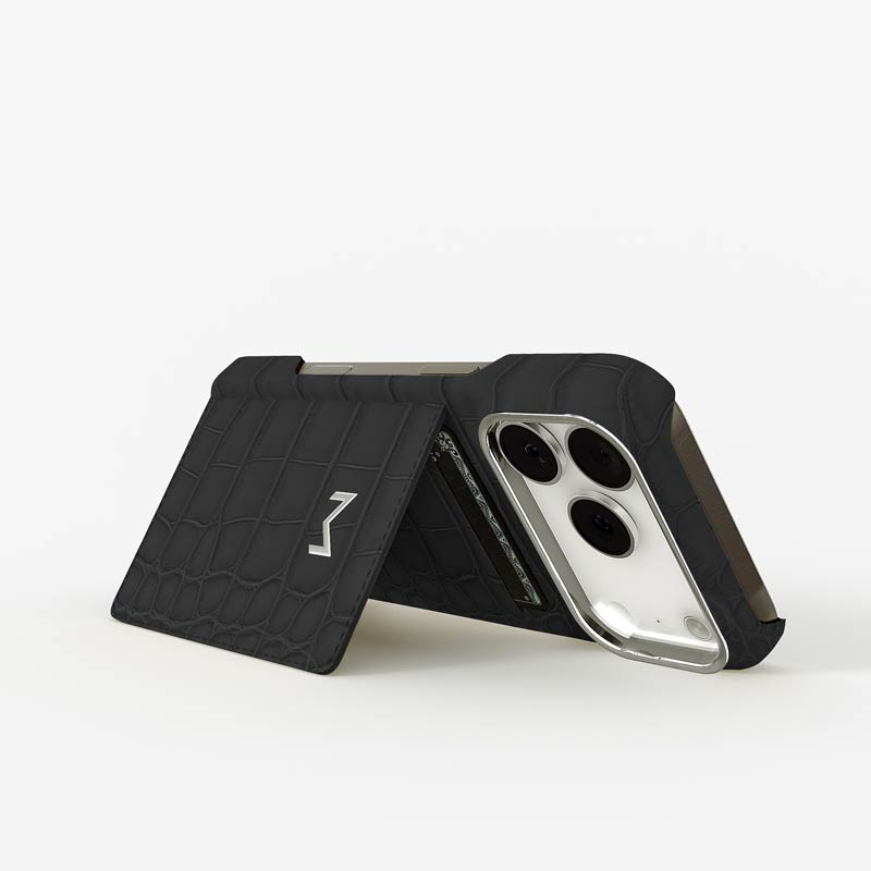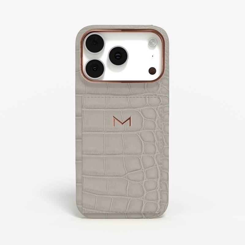 Exclusively made to order and entirely handcrafted, this iPhone 17 Pro Max case is sheathed in hand-selected, top-grade alligator leather — chosen for its rarity, texture, and unmistakable presence. Inside, a soft Alcantara lining cradles your device, preserving its flawless condition. The hand-polished 316L stainless steel logo and camera ring reflect a commitment to detail and craftsmanship rarely seen.