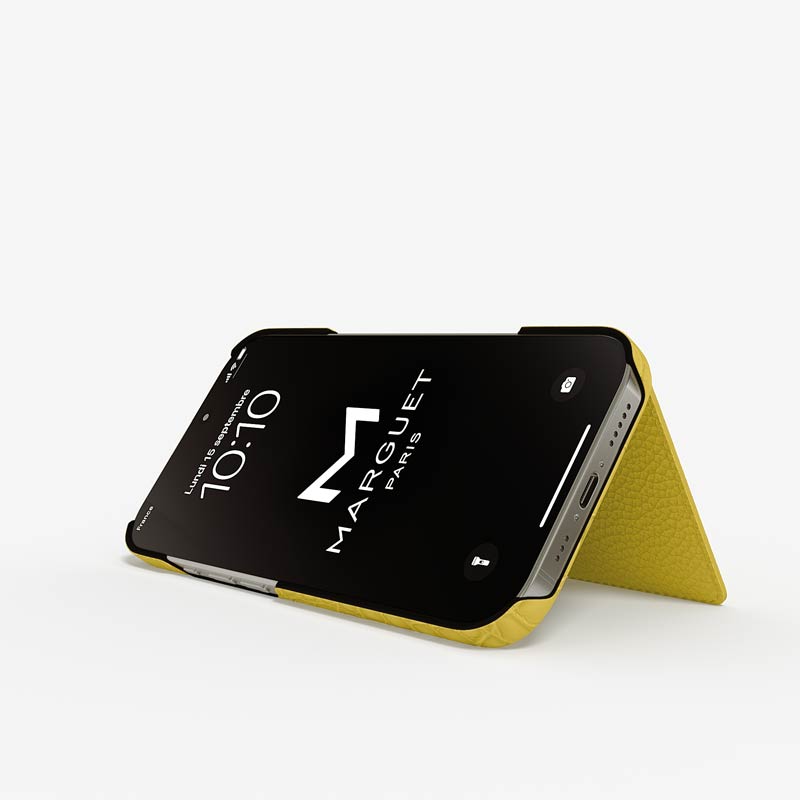 An elegant wallet design offers refined practicality, with two card slots on the case and one inside the flap. The flap also serves as a discreet stand for comfortable horizontal viewing.