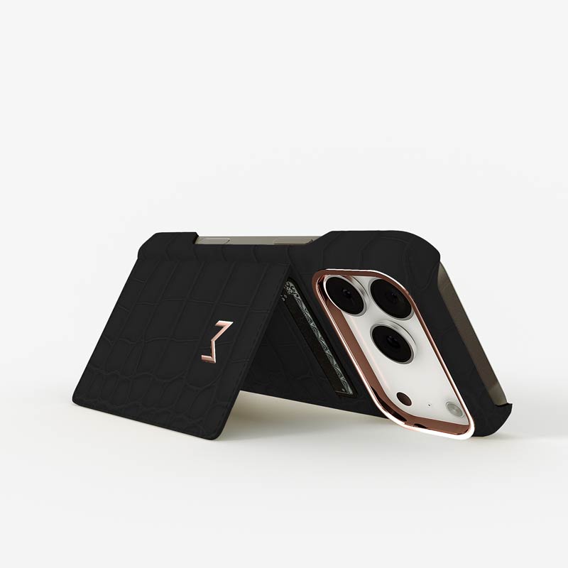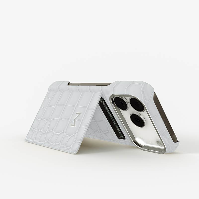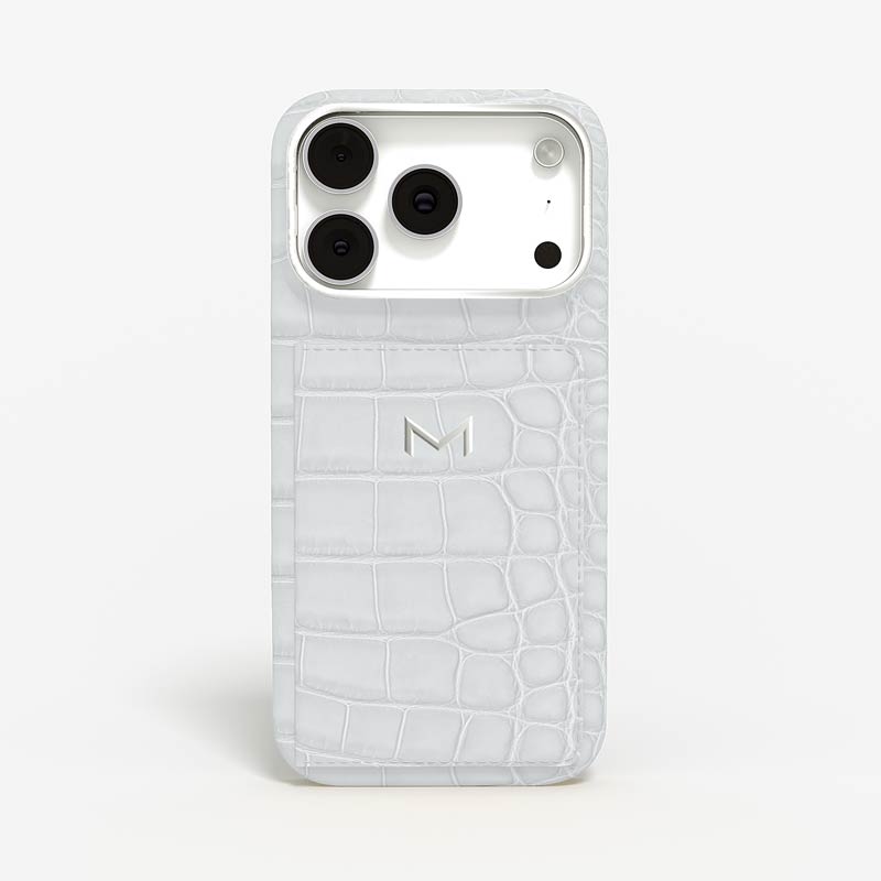 Exclusively made to order and entirely handcrafted, this iPhone 17 Pro Max case is sheathed in hand-selected, top-grade alligator leather — chosen for its rarity, texture, and unmistakable presence. Inside, a soft Alcantara lining cradles your device, preserving its flawless condition. The hand-polished 316L stainless steel logo and camera ring reflect a commitment to detail and craftsmanship rarely seen.