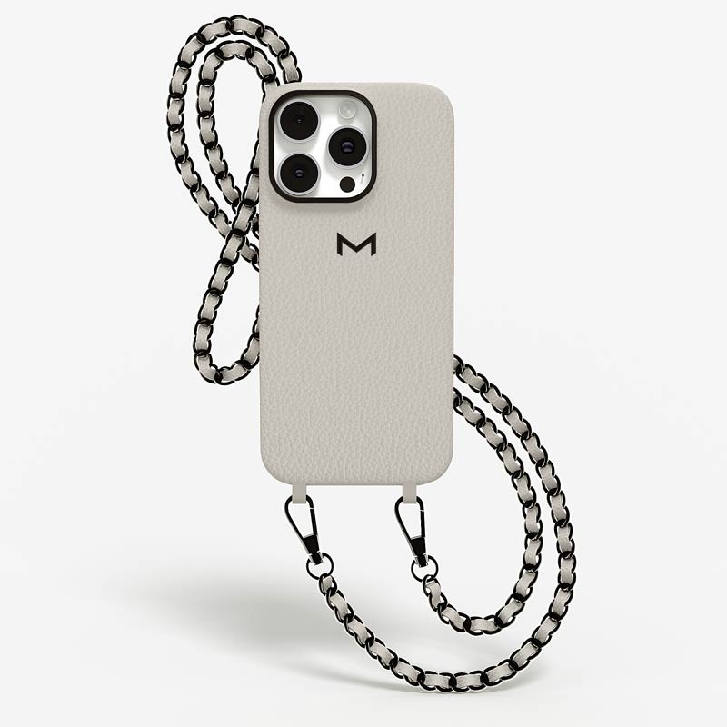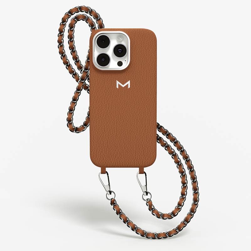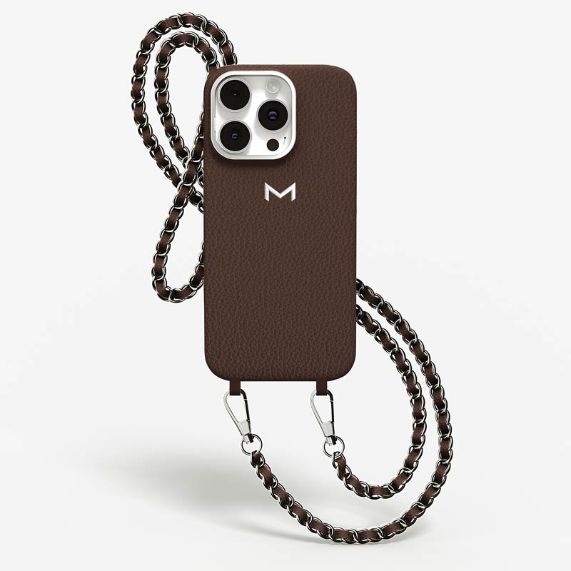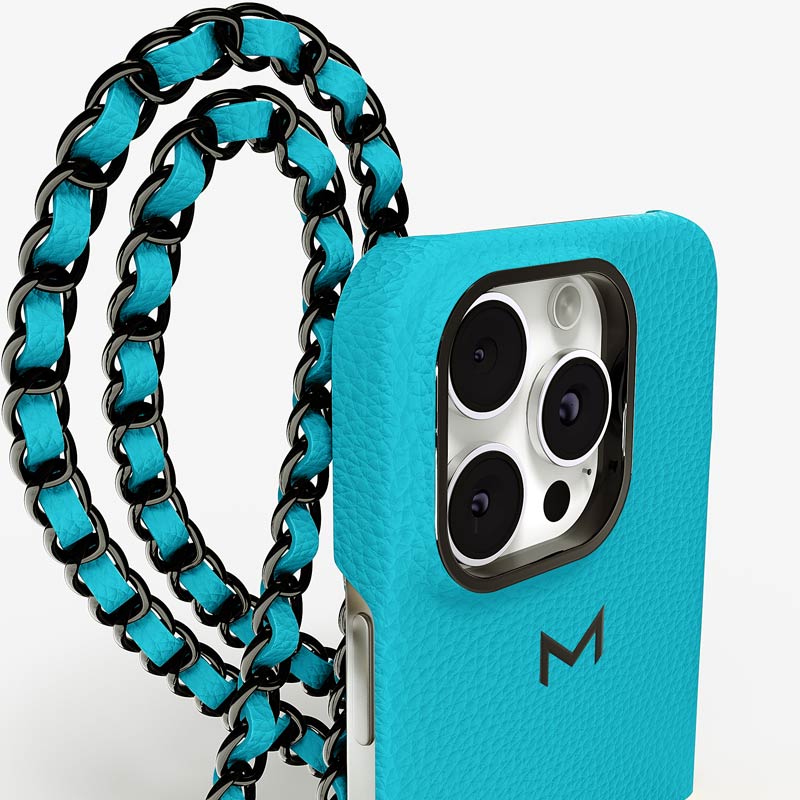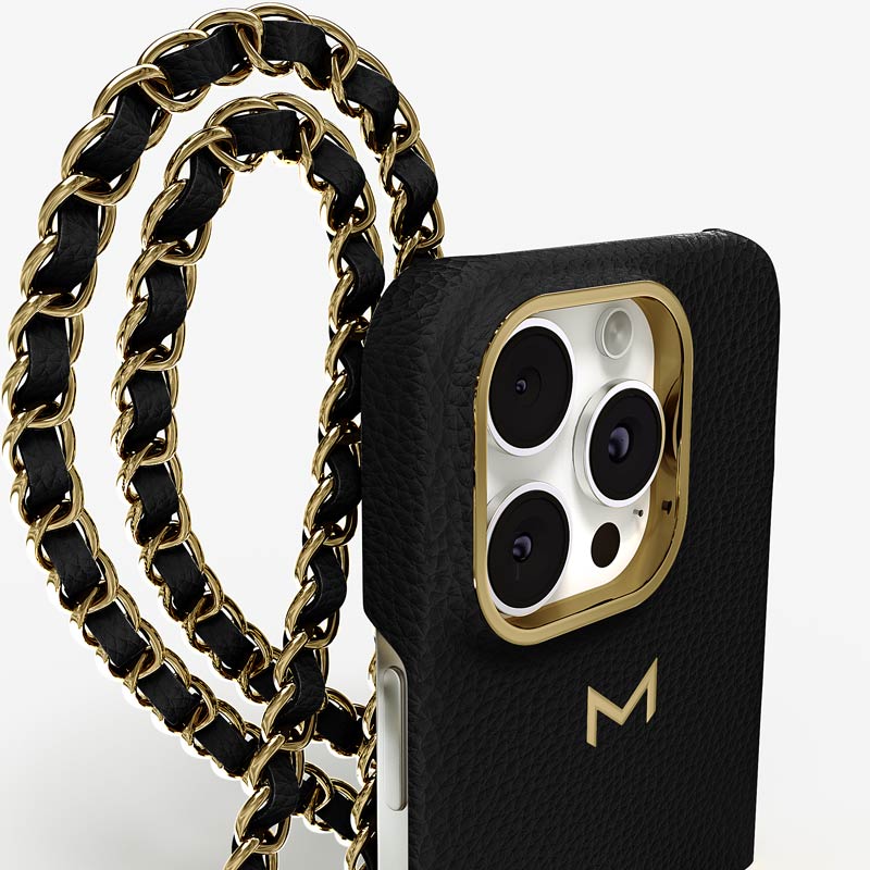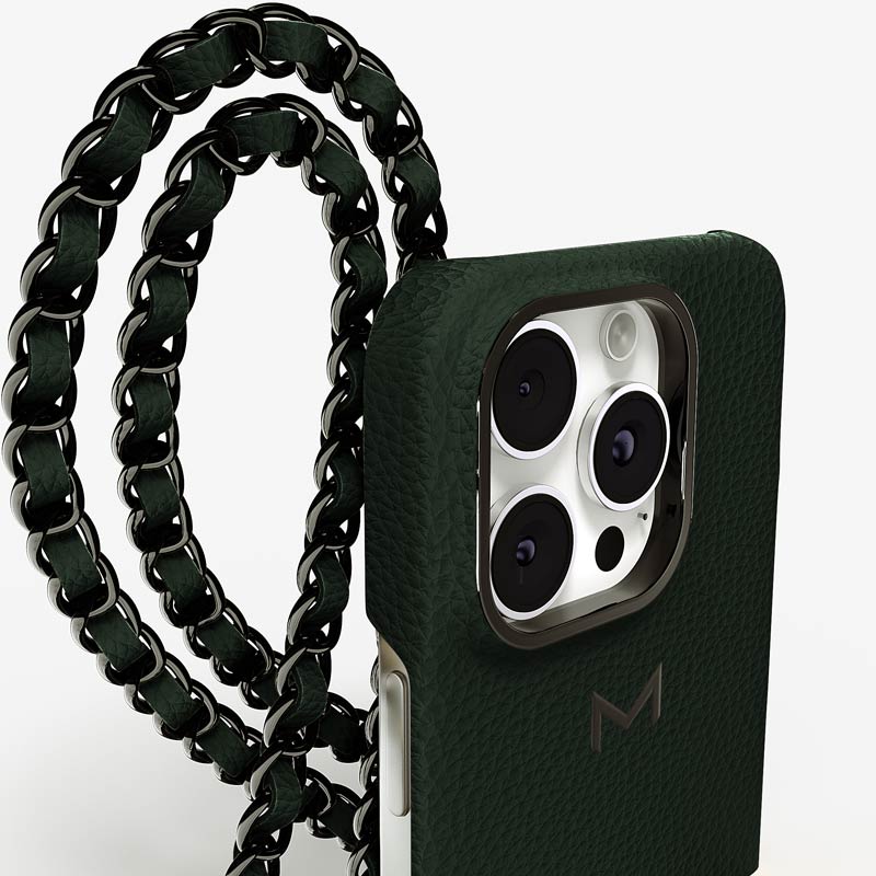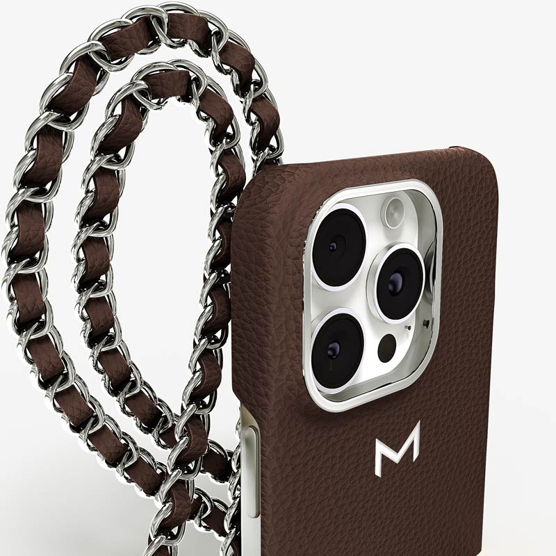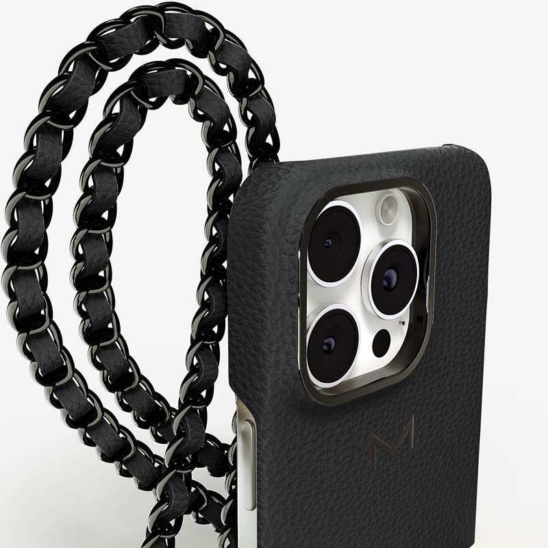 Exclusively made to order and entirely handcrafted, this iPhone 15 Pro Max case is sheathed in hand-selected, premium calf leather — prized for its softness, durability, and understated elegance. Inside, a soft Alcantara lining cradles your device, preserving its flawless condition. The hand-polished 316L stainless steel logo and leather-interlaced metal chain reflect a commitment to detail and craftsmanship rarely seen.