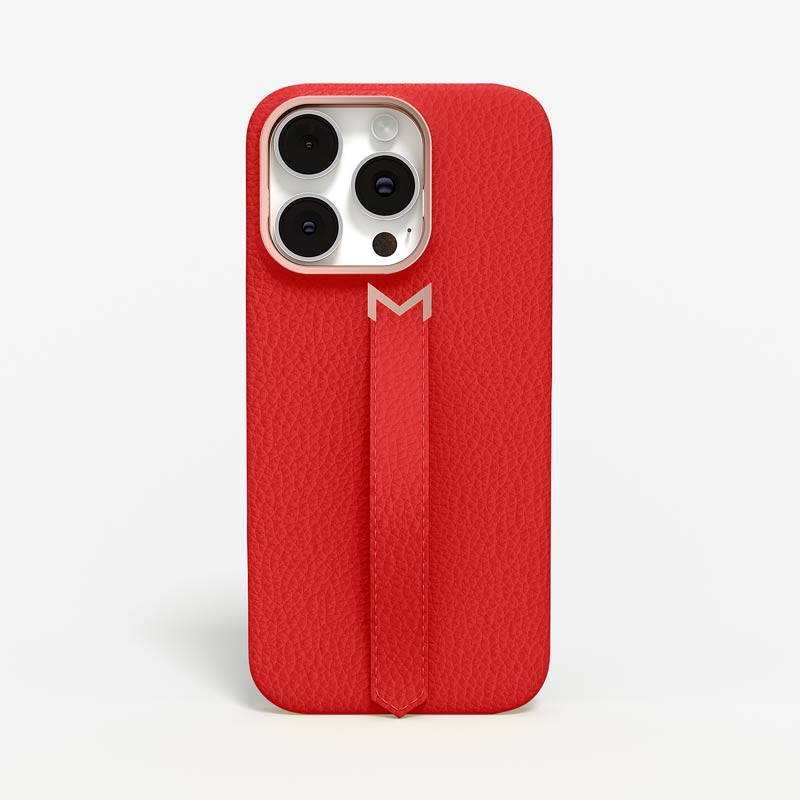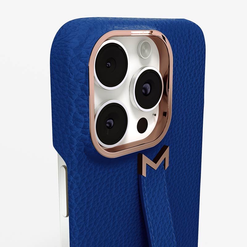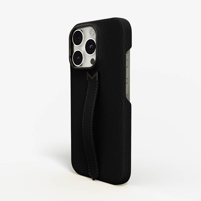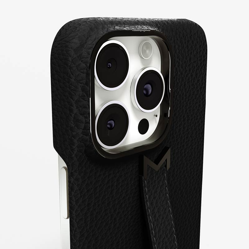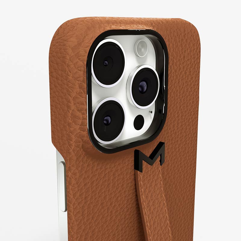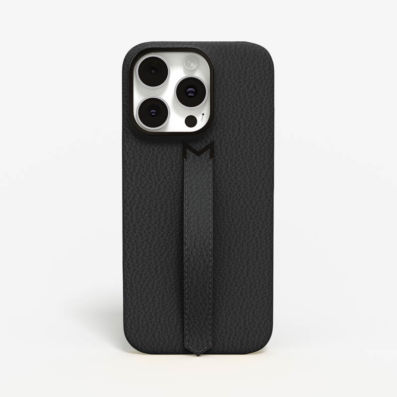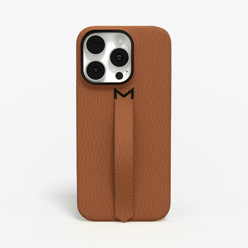 An integrated leather finger strap adds comfort and control, allowing for a secure grip while using your phone — with elegance and ease.