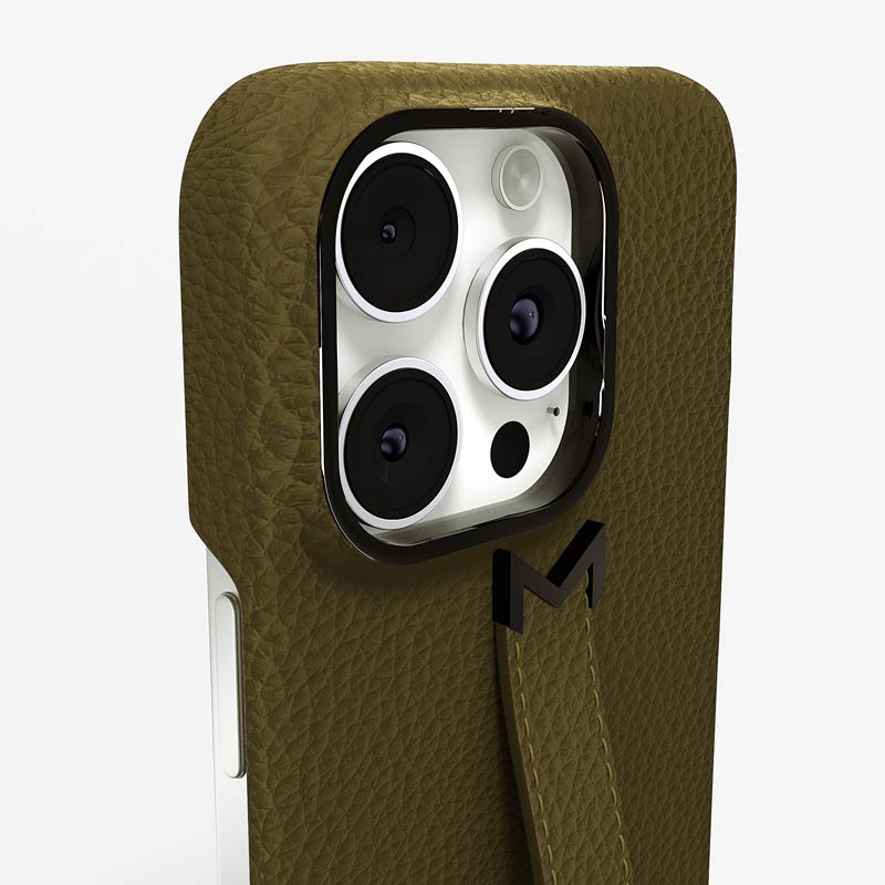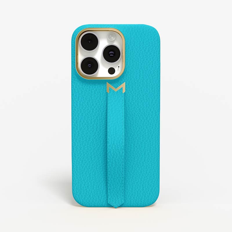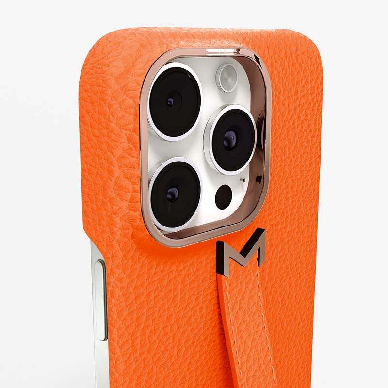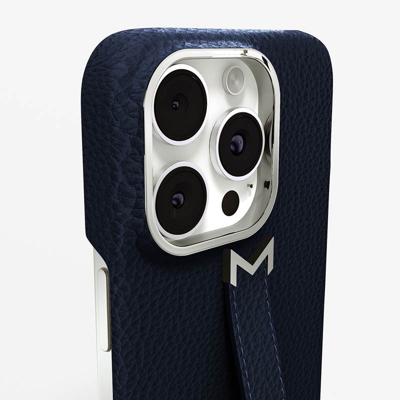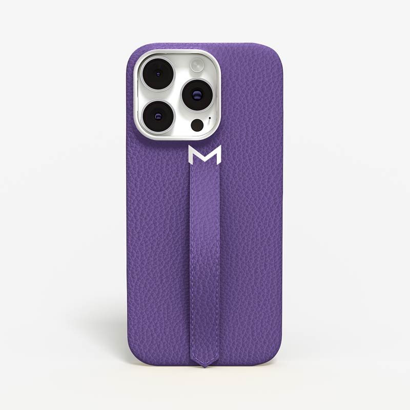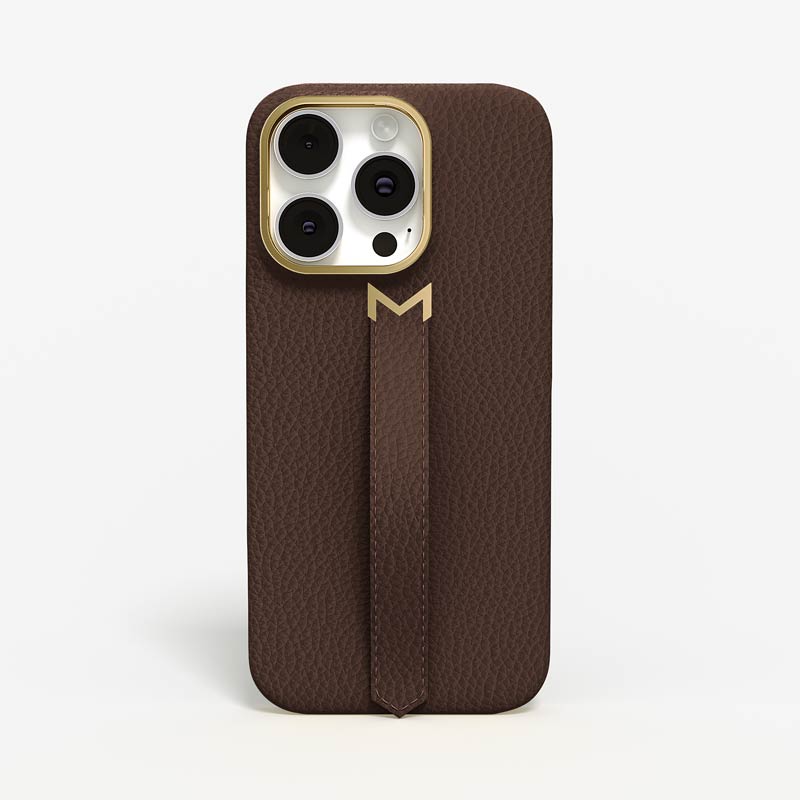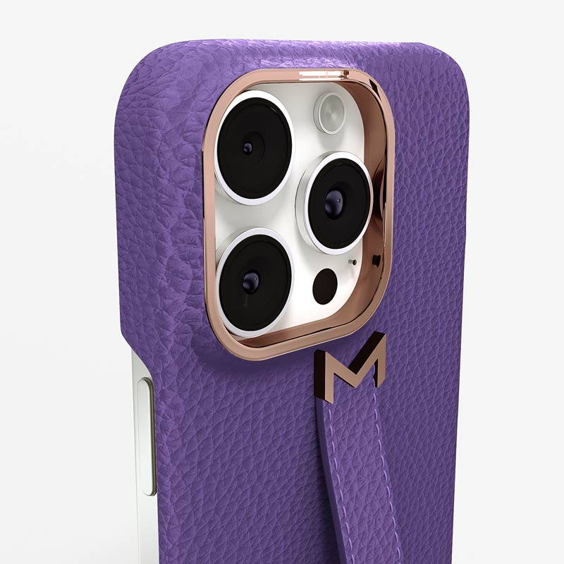 An integrated leather finger strap adds comfort and control, allowing for a secure grip while using your phone — with elegance and ease.
