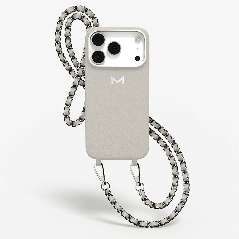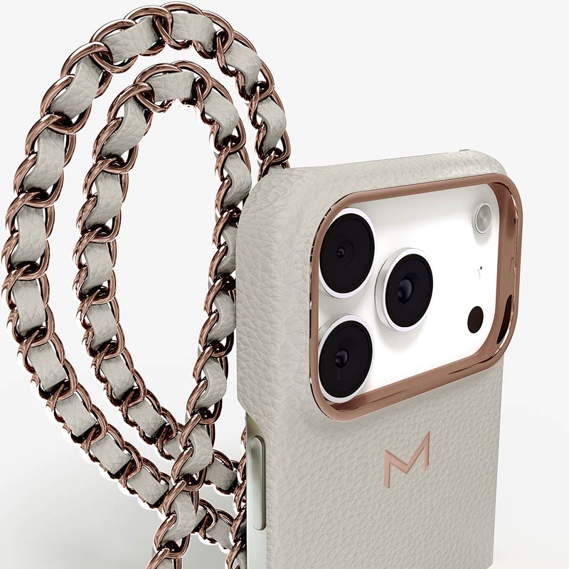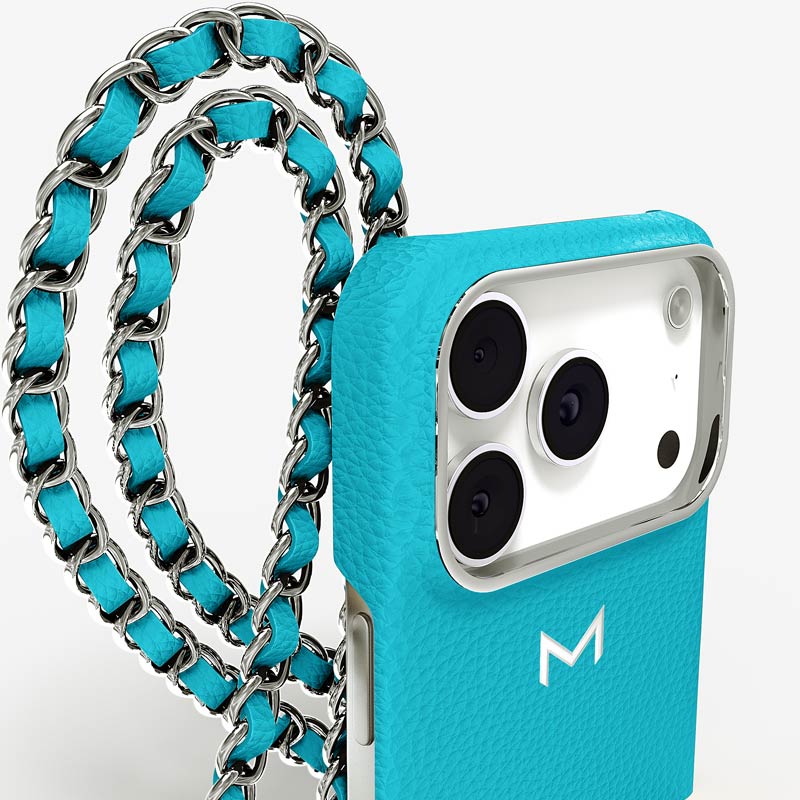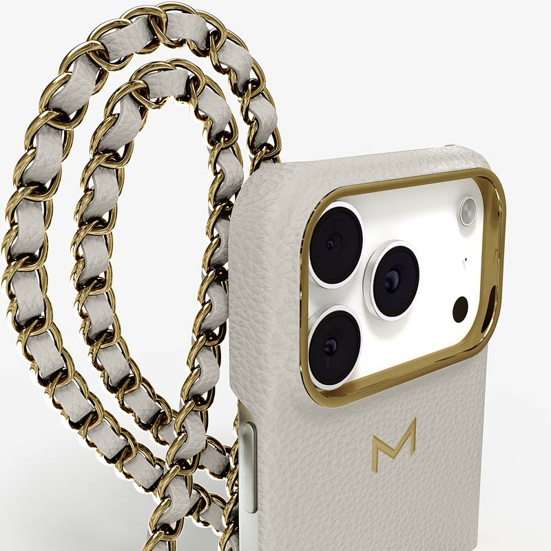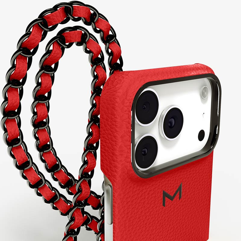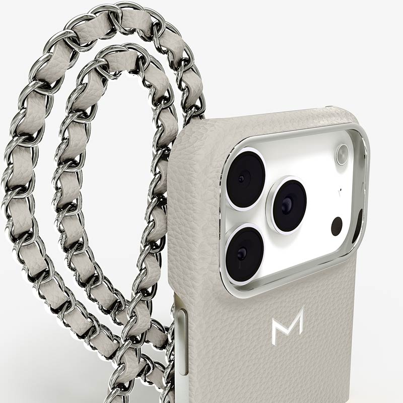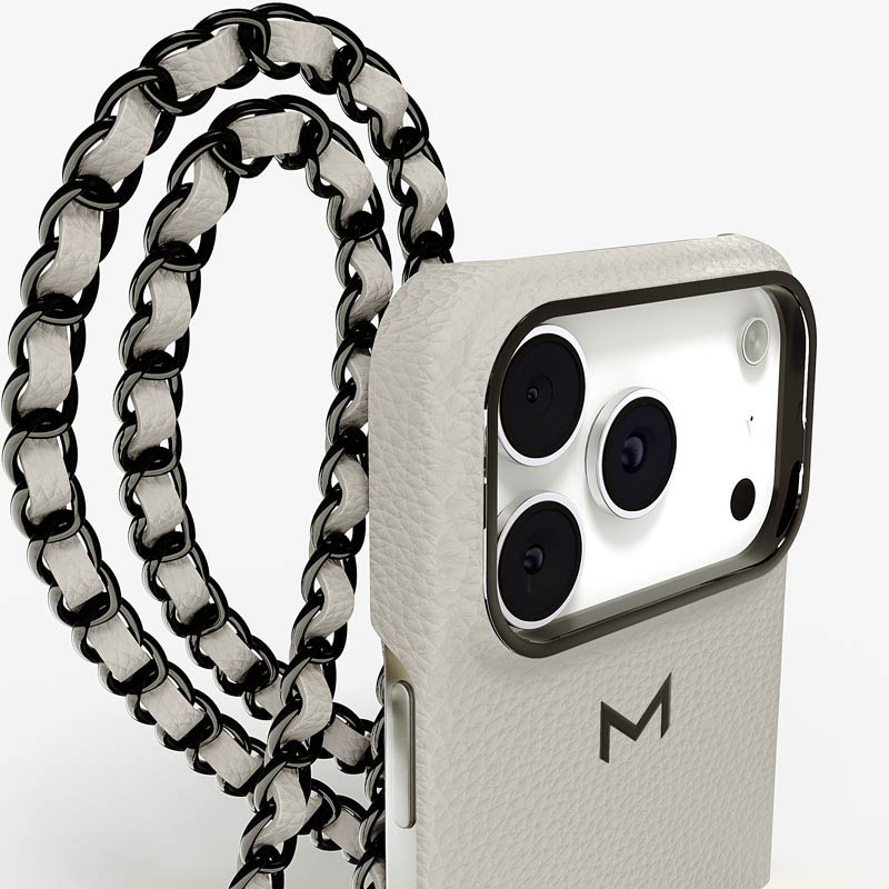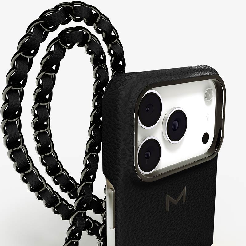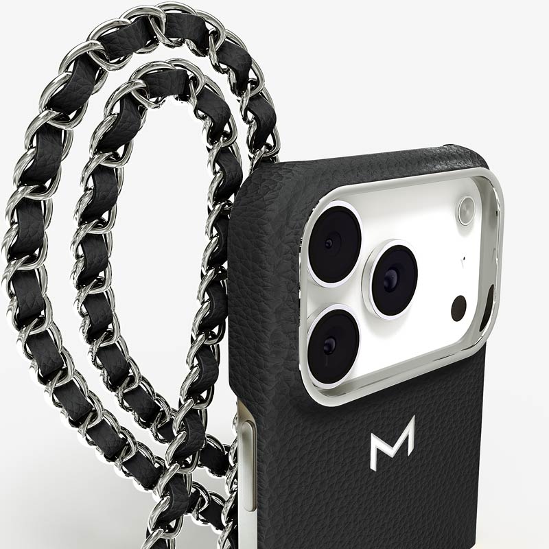 Exclusively made to order and entirely handcrafted, this iPhone 17 Pro Max case is sheathed in hand-selected, premium calf leather — prized for its softness, durability, and understated elegance. Inside, a soft Alcantara lining cradles your device, preserving its flawless condition. The hand-polished 316L stainless steel logo and leather-interlaced metal chain reflect a commitment to detail and craftsmanship rarely seen.