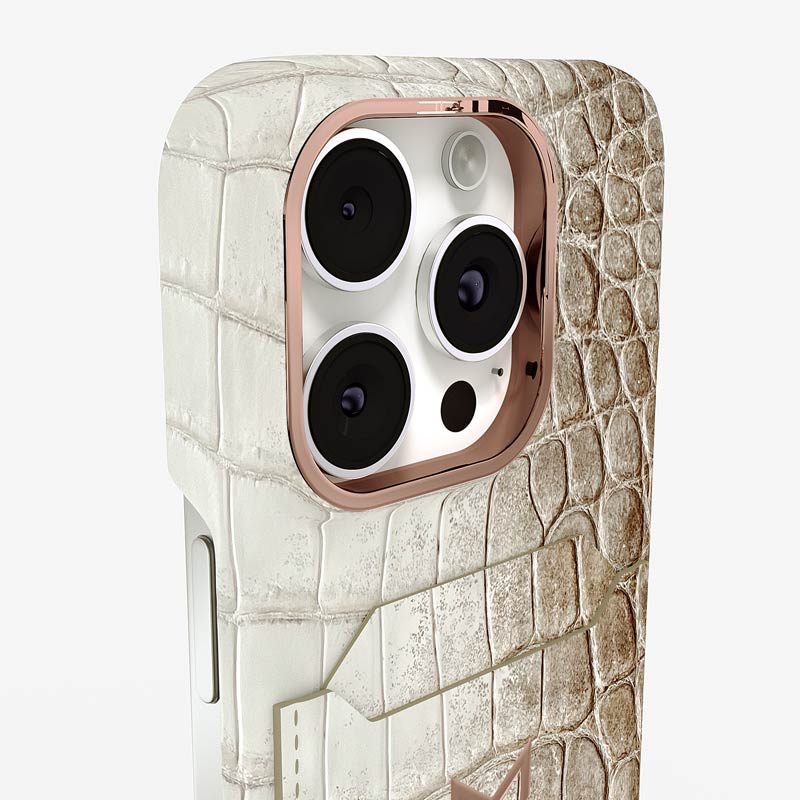 Exclusively made to order and entirely handcrafted, this iPhone 15 Pro case is sheathed in ultra-rare Himalaya crocodile leather — selected for its exceptional gradient, rarity, and timeless prestige. Inside, a soft Alcantara lining cradles your device, preserving its flawless condition. The hand-polished 316L stainless steel logo and camera ring reflect a commitment to detail and craftsmanship rarely seen.