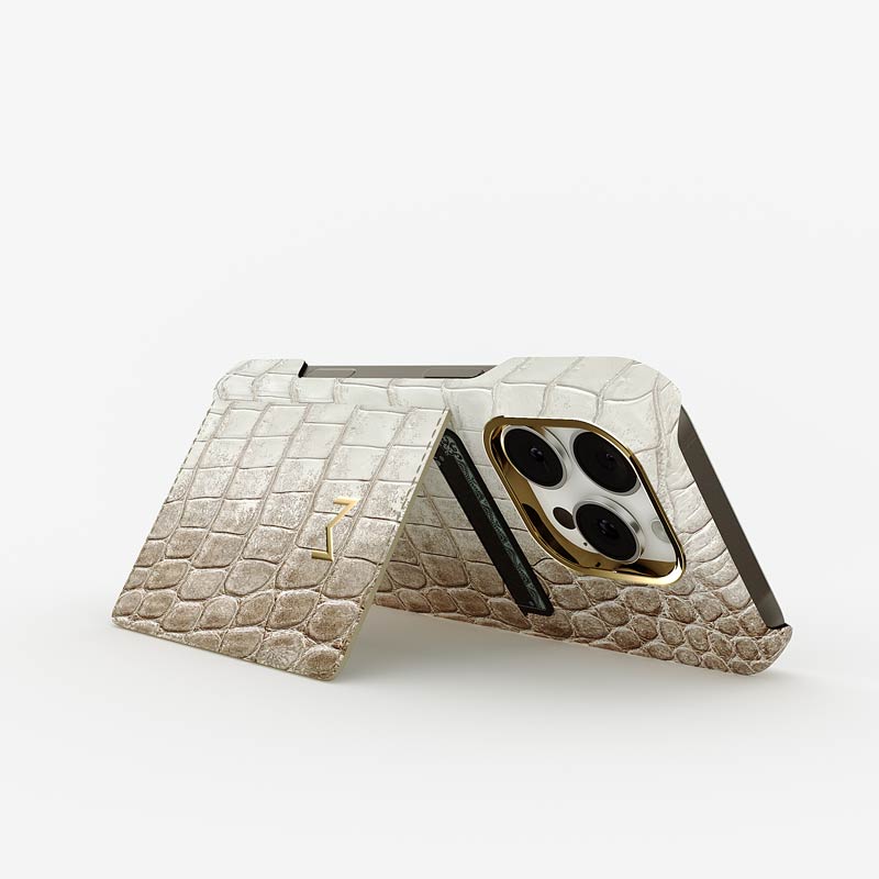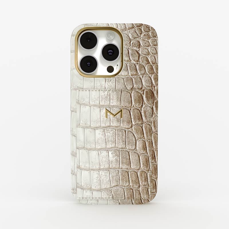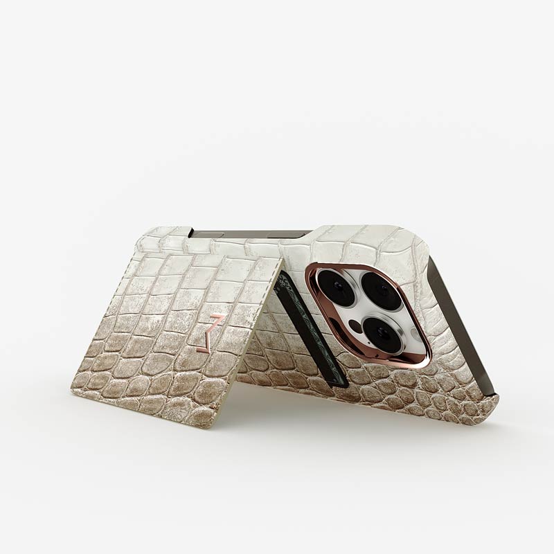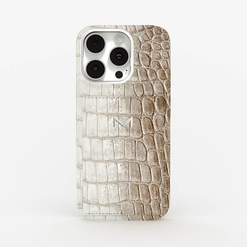 Exclusively made to order and entirely handcrafted, this iPhone 15 Pro Max case is sheathed in ultra-rare Himalaya crocodile leather — selected for its exceptional gradient, rarity, and timeless prestige. Inside, a soft Alcantara lining cradles your device, preserving its flawless condition. The hand-polished 316L stainless steel logo and camera ring reflect a commitment to detail and craftsmanship rarely seen.