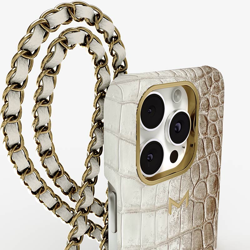 Exclusively made to order and entirely handcrafted, this iPhone 16 Pro Max case is sheathed in ultra-rare Himalaya crocodile leather — selected for its exceptional gradient, rarity, and timeless prestige. Inside, a soft Alcantara lining cradles your device, preserving its flawless condition. The hand-polished 316L stainless steel logo and leather-interlaced metal chain reflect a commitment to detail and craftsmanship rarely seen.