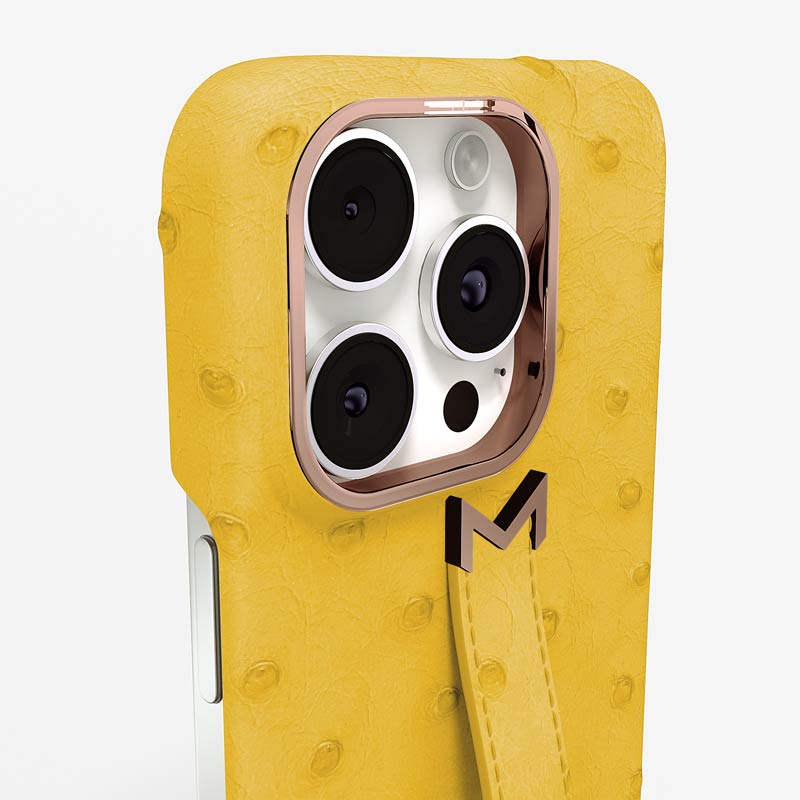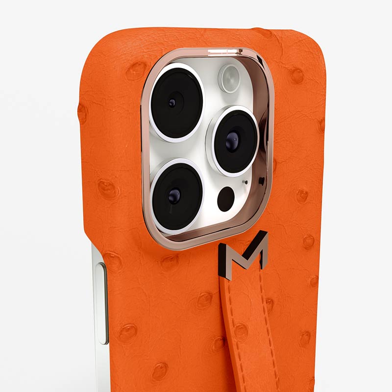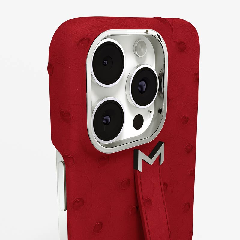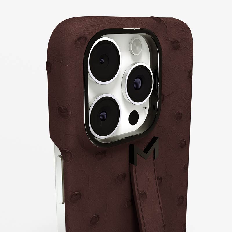 Exclusively made to order and entirely handcrafted, this iPhone 15 Pro case is sheathed in hand-selected, full-quill ostrich leather — valued for its supple texture, natural markings, and unmistakable character. Inside, a soft Alcantara lining cradles your device, preserving its flawless condition. The hand-polished 316L stainless steel logo and camera ring reflect a commitment to detail and craftsmanship rarely seen.