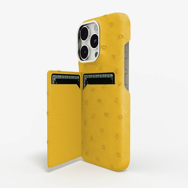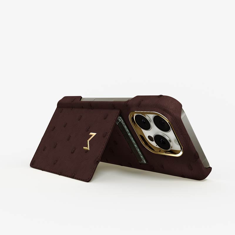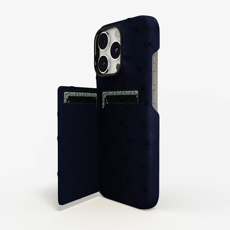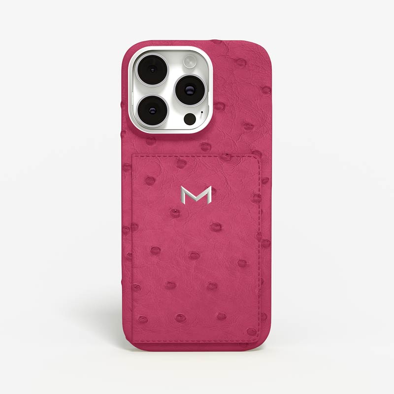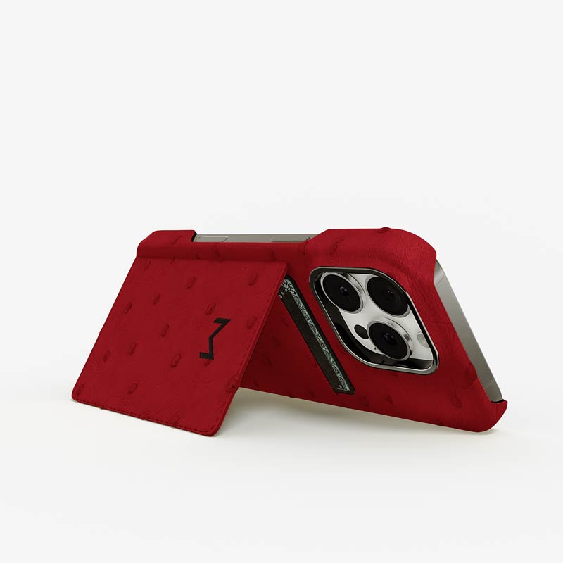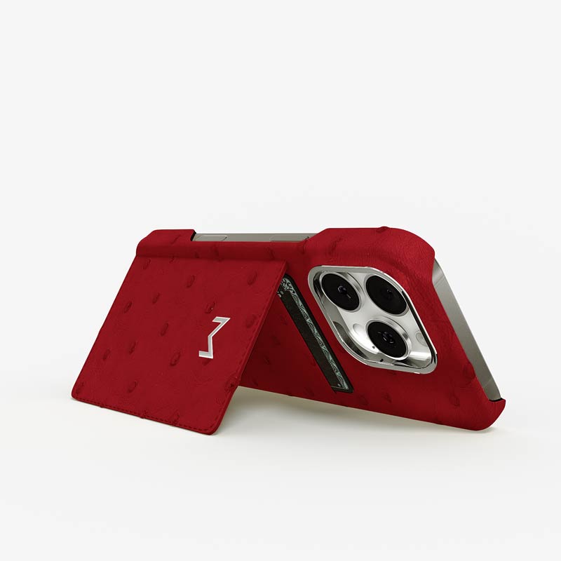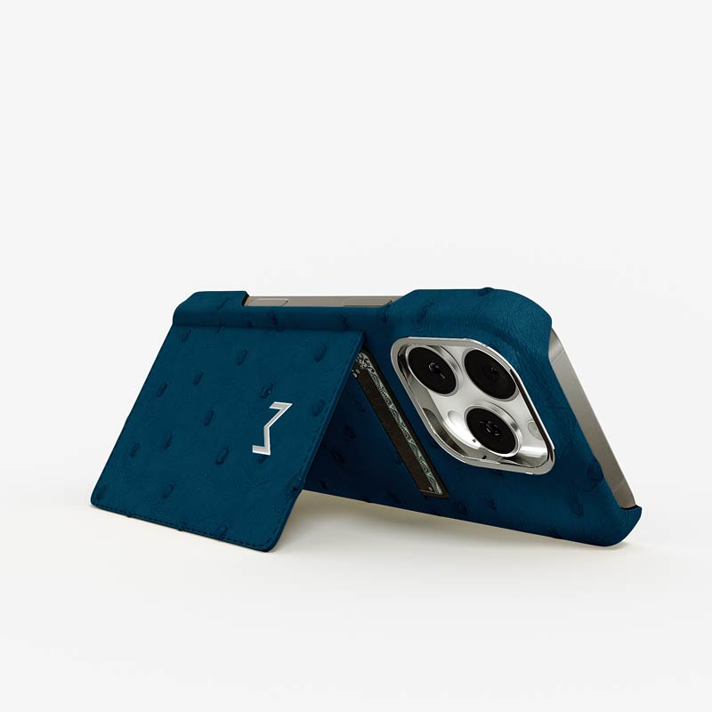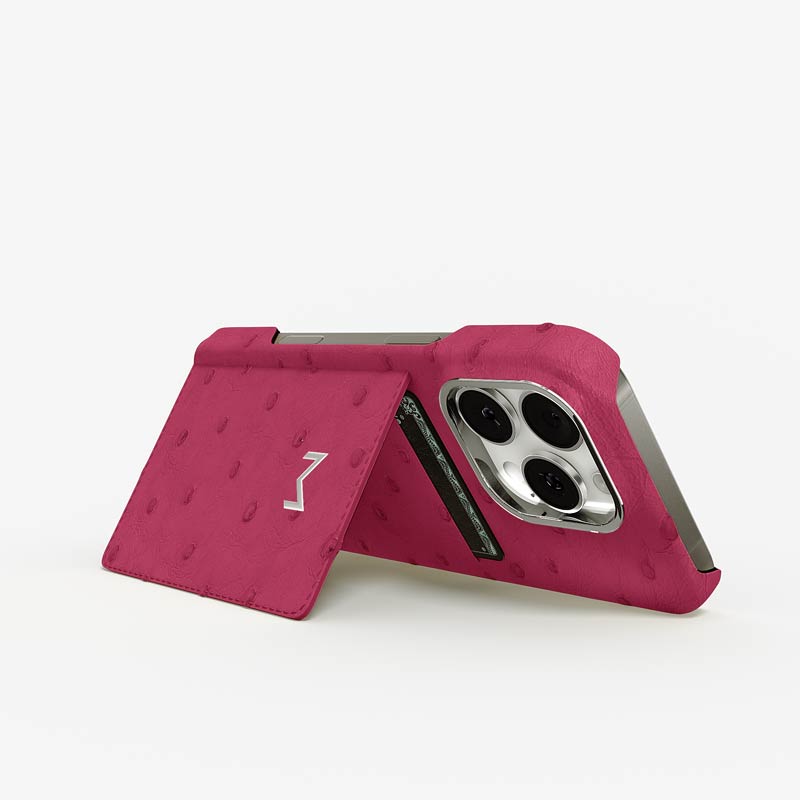 Exclusively made to order and entirely handcrafted, this iPhone 15 Pro case is sheathed in hand-selected, full-quill ostrich leather — valued for its supple texture, natural markings, and unmistakable character. Inside, a soft Alcantara lining cradles your device, preserving its flawless condition. The hand-polished 316L stainless steel logo and camera ring reflect a commitment to detail and craftsmanship rarely seen.