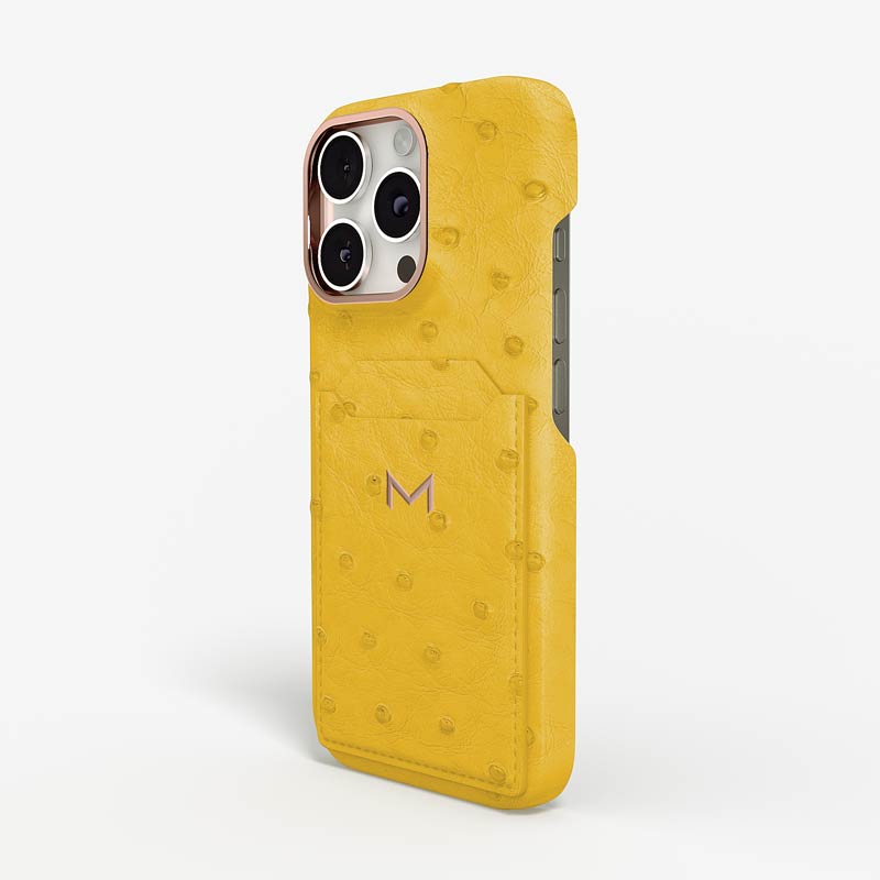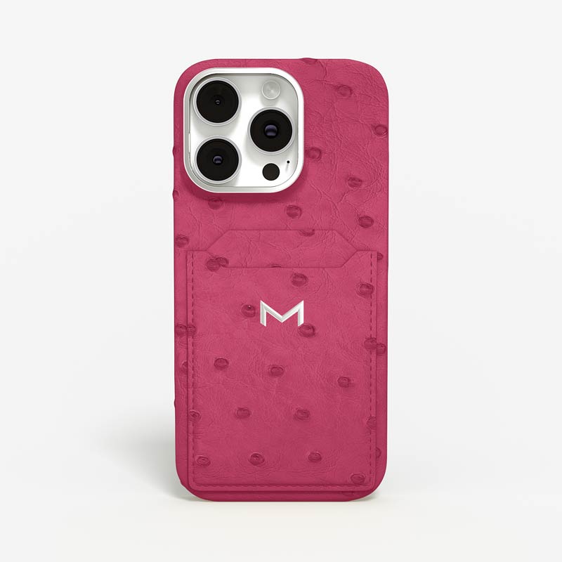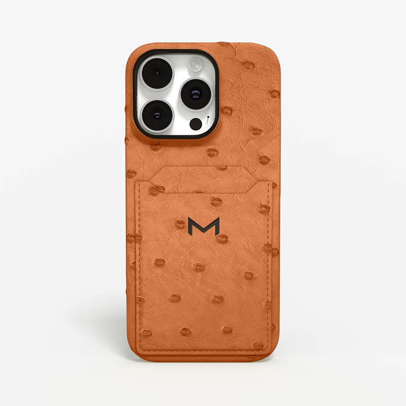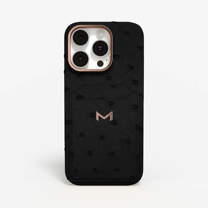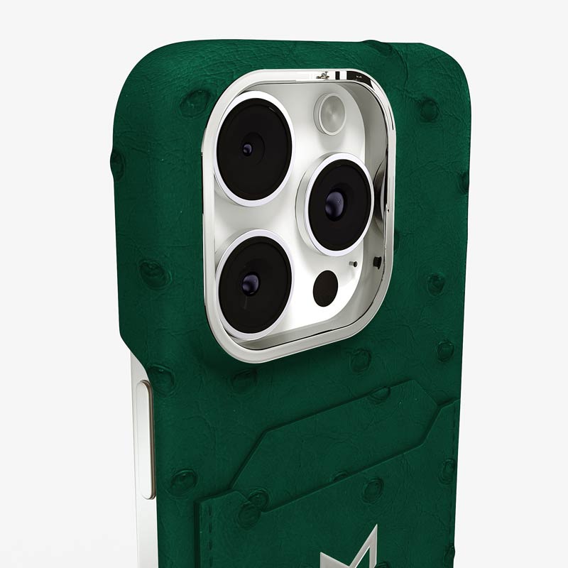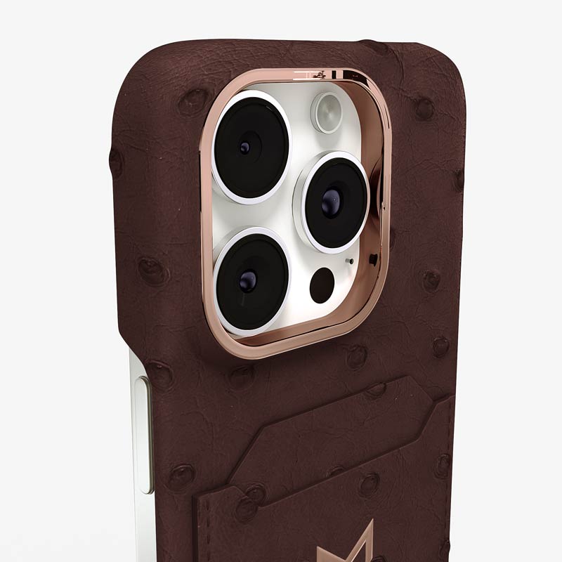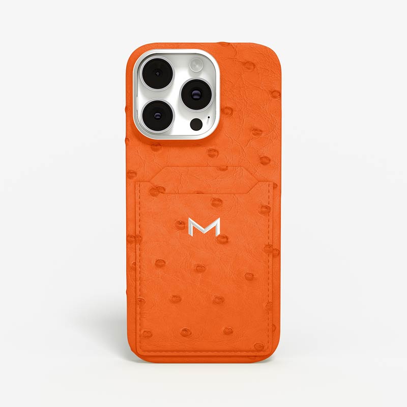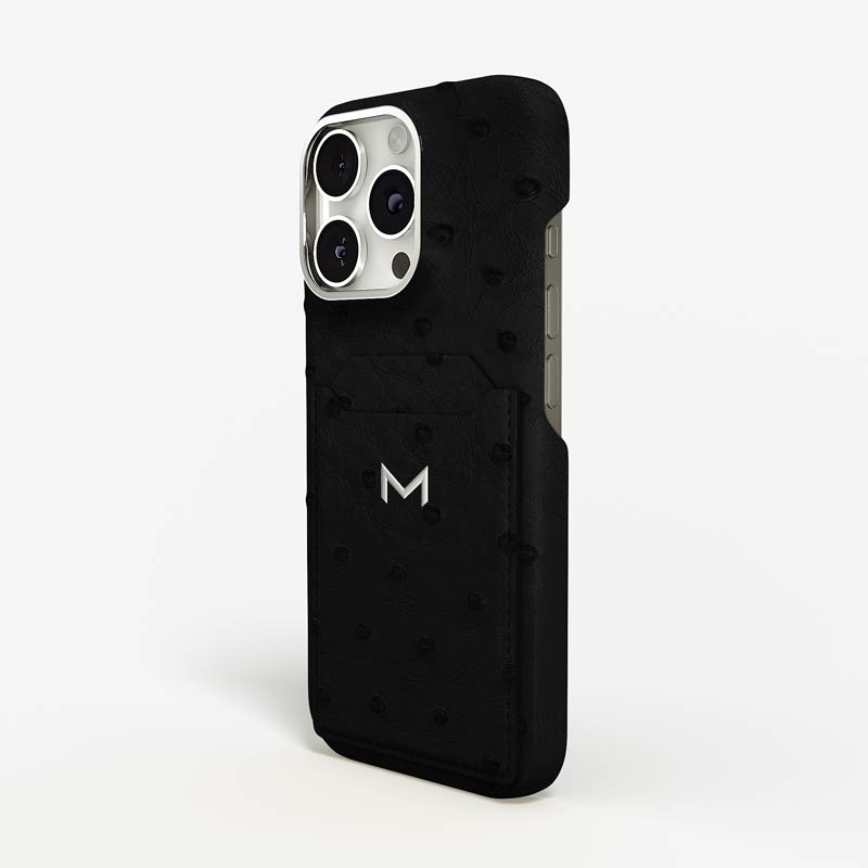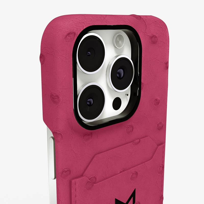Exclusively made to order and entirely handcrafted, this iPhone 15 Pro Max case is sheathed in hand-selected, full-quill ostrich leather — valued for its supple texture, natural markings, and unmistakable character. Inside, a soft Alcantara lining cradles your device, preserving its flawless condition. The hand-polished 316L stainless steel logo and camera ring reflect a commitment to detail and craftsmanship rarely seen.