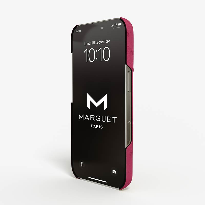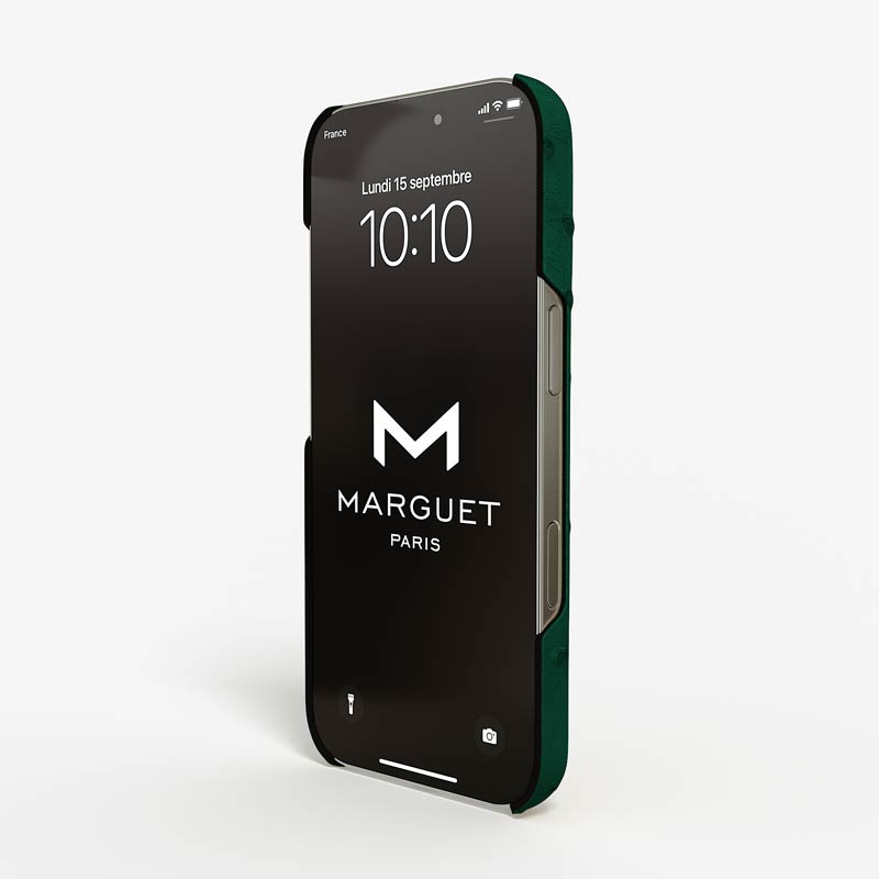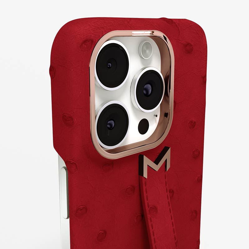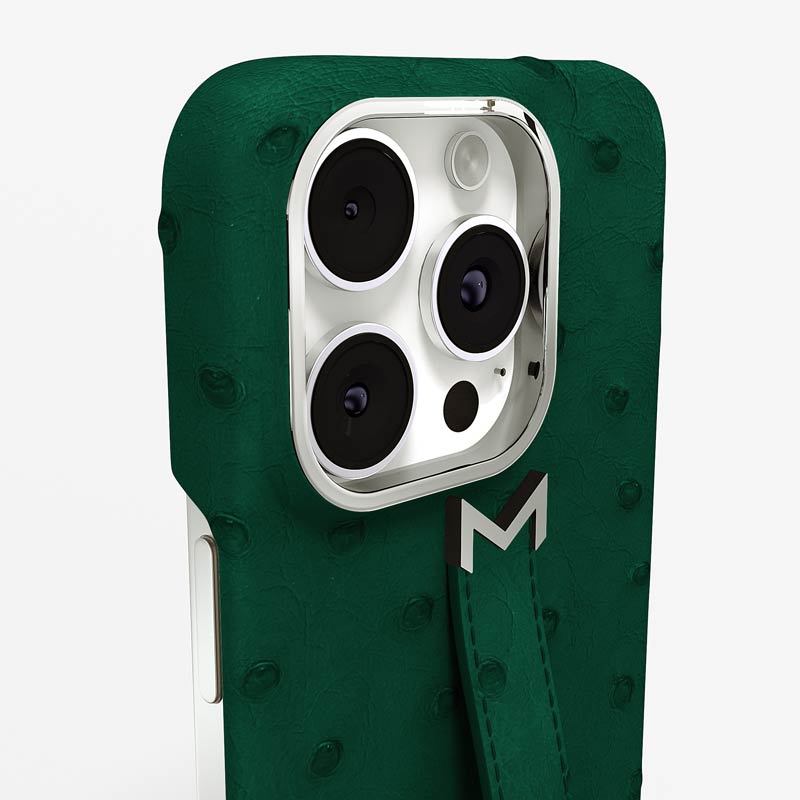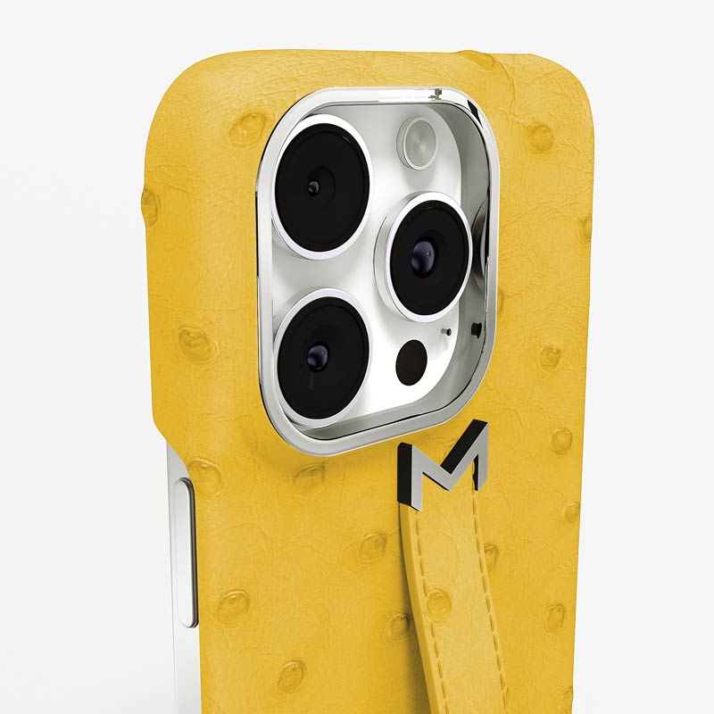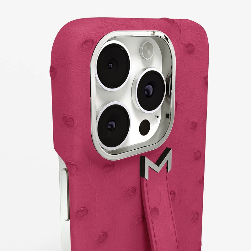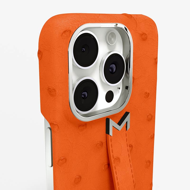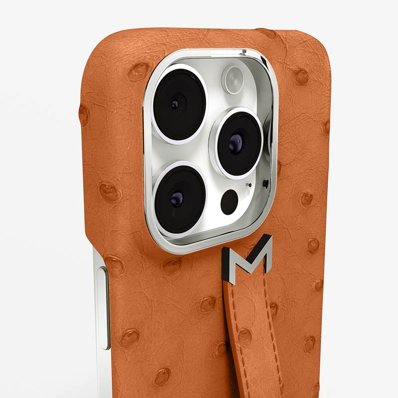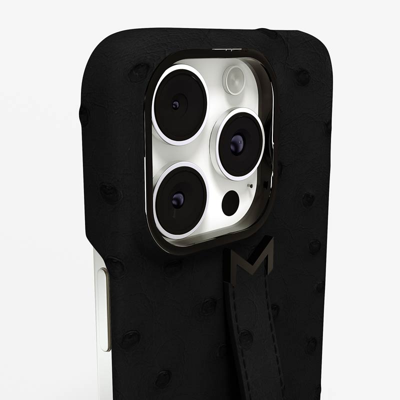 Exclusively made to order and entirely handcrafted, this iPhone 15 Pro Max case is sheathed in hand-selected, full-quill ostrich leather — valued for its supple texture, natural markings, and unmistakable character. Inside, a soft Alcantara lining cradles your device, preserving its flawless condition. The hand-polished 316L stainless steel logo and camera ring reflect a commitment to detail and craftsmanship rarely seen.