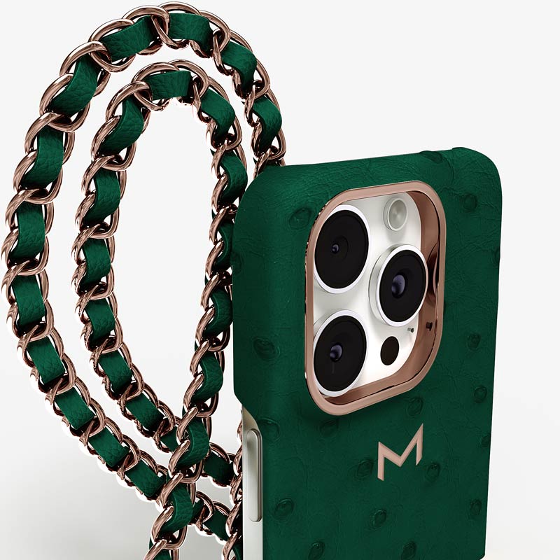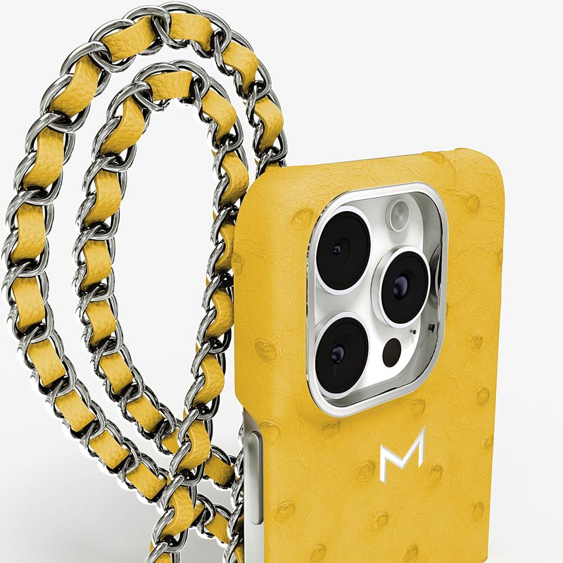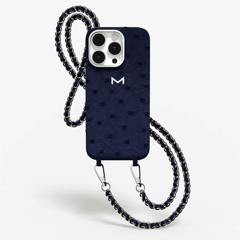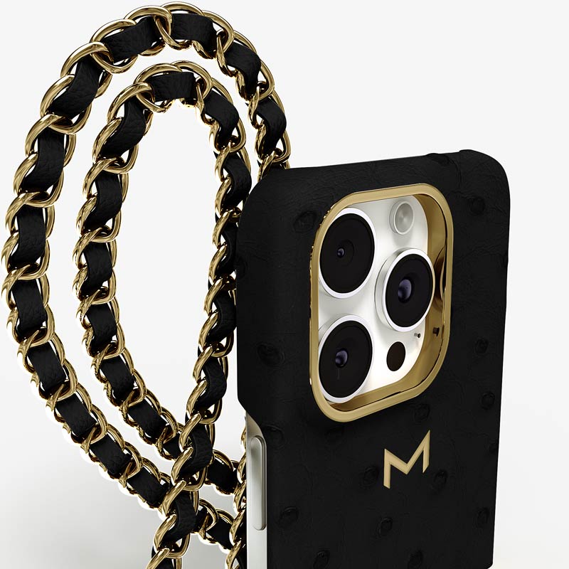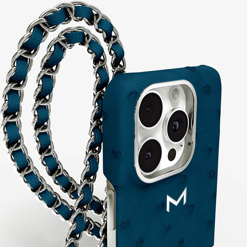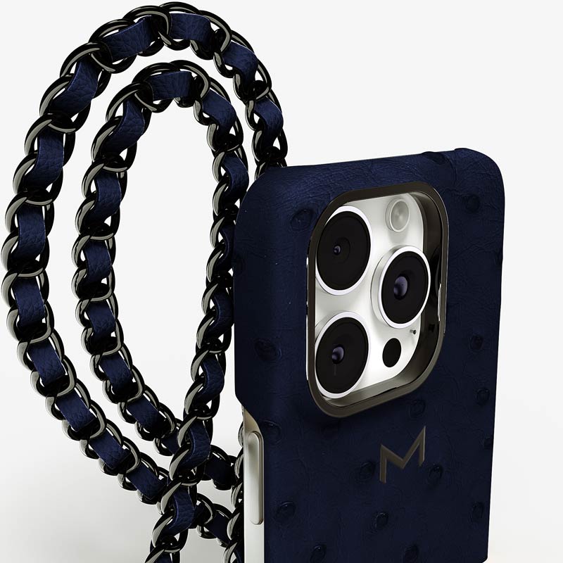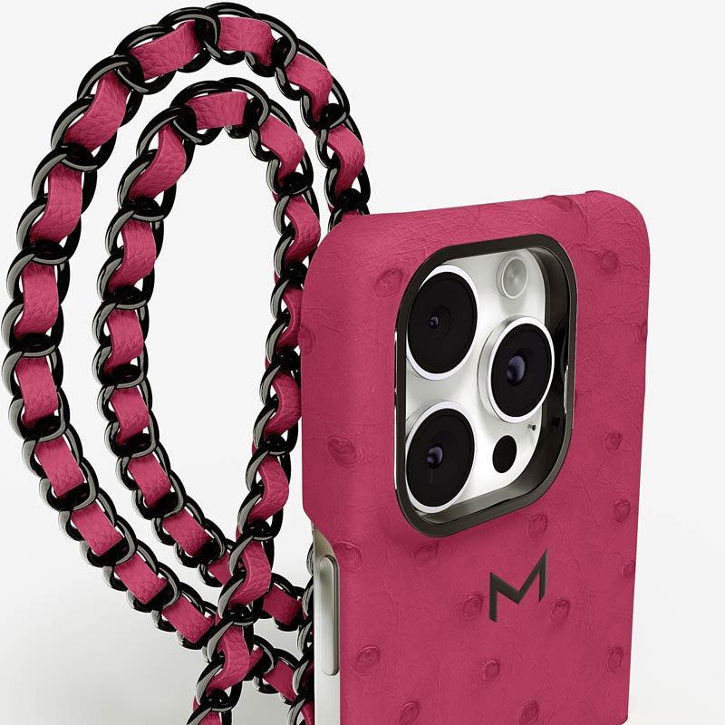 Exclusively made to order and entirely handcrafted, this iPhone 15 Pro Max case is sheathed in hand-selected, full-quill ostrich leather — valued for its supple texture, natural markings, and unmistakable character. Inside, a soft Alcantara lining cradles your device, preserving its flawless condition. The hand-polished 316L stainless steel logo and leather-interlaced metal chain reflect a commitment to detail and craftsmanship rarely seen.