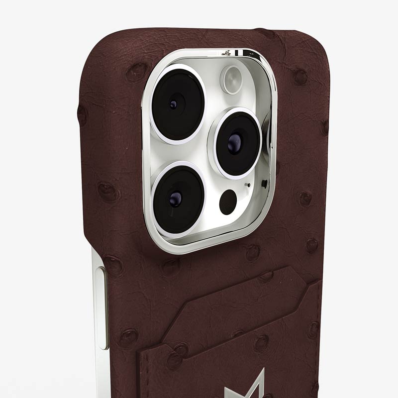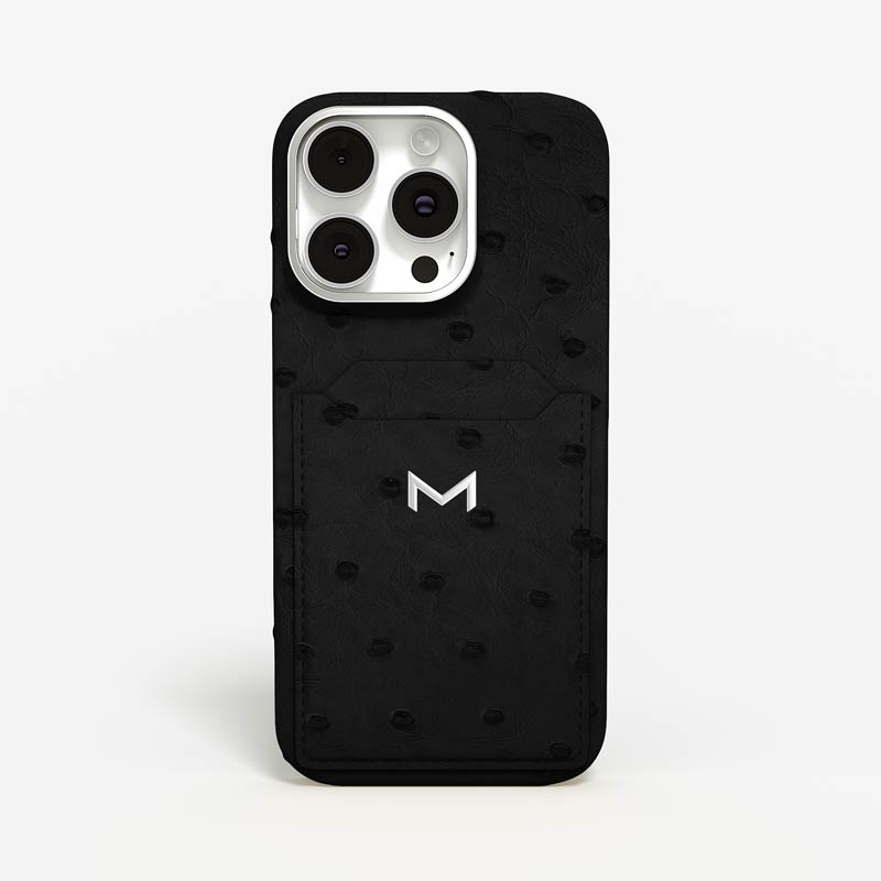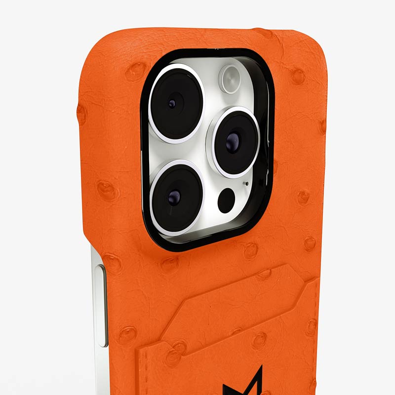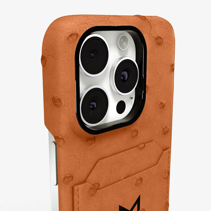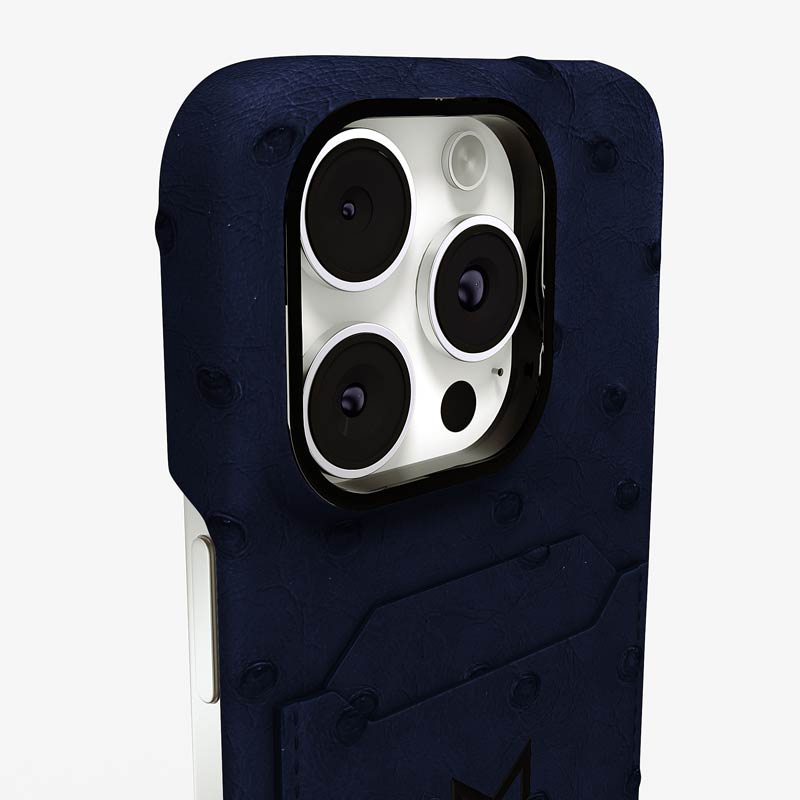 Exclusively made to order and entirely handcrafted, this iPhone 16 Pro Max case is sheathed in hand-selected, full-quill ostrich leather — valued for its supple texture, natural markings, and unmistakable character. Inside, a soft Alcantara lining cradles your device, preserving its flawless condition. The hand-polished 316L stainless steel logo and camera ring reflect a commitment to detail and craftsmanship rarely seen.