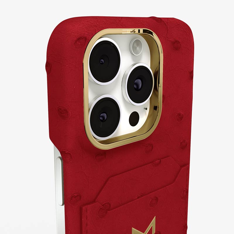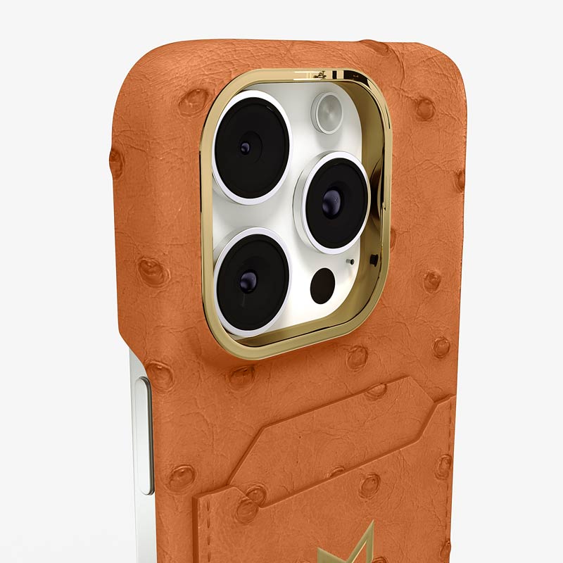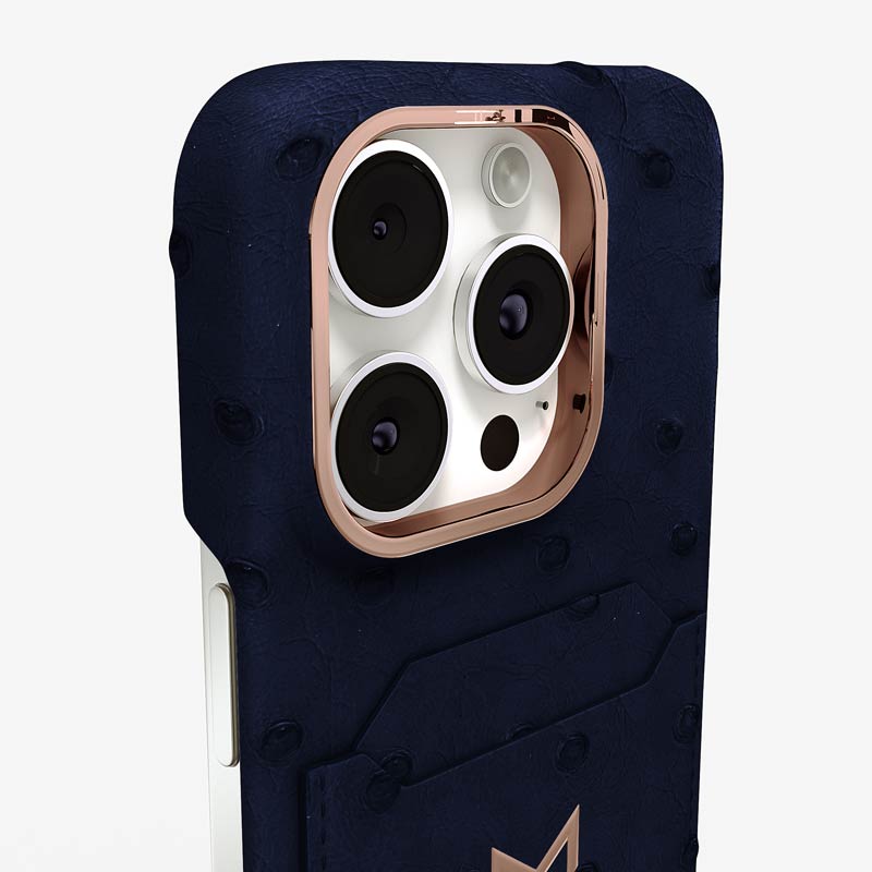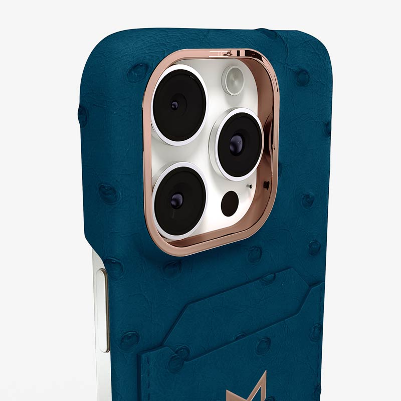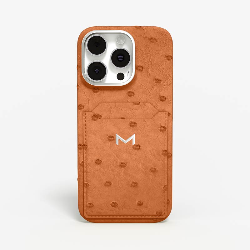Exclusively made to order and entirely handcrafted, this iPhone 16 Pro Max case is sheathed in hand-selected, full-quill ostrich leather — valued for its supple texture, natural markings, and unmistakable character. Inside, a soft Alcantara lining cradles your device, preserving its flawless condition. The hand-polished 316L stainless steel logo and camera ring reflect a commitment to detail and craftsmanship rarely seen.