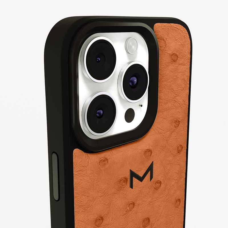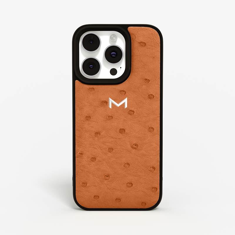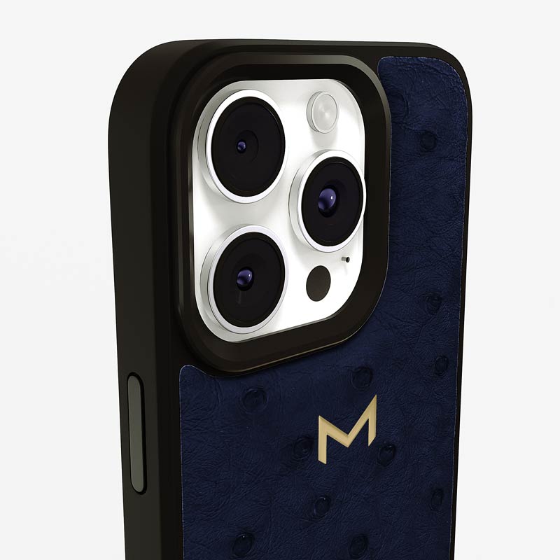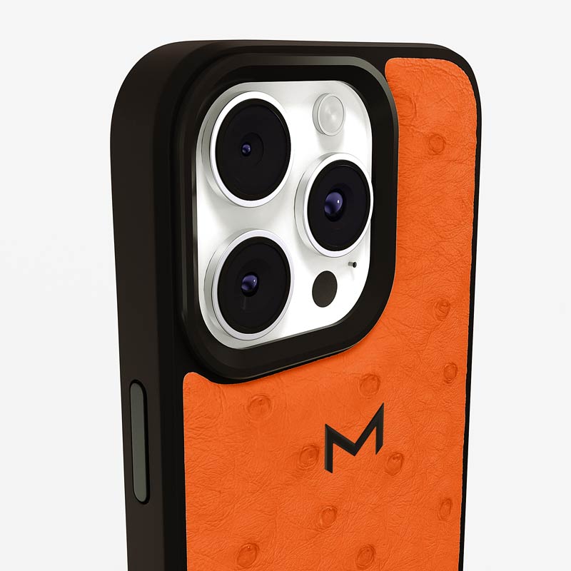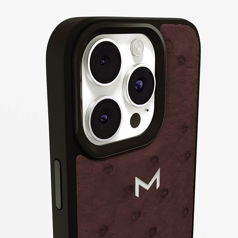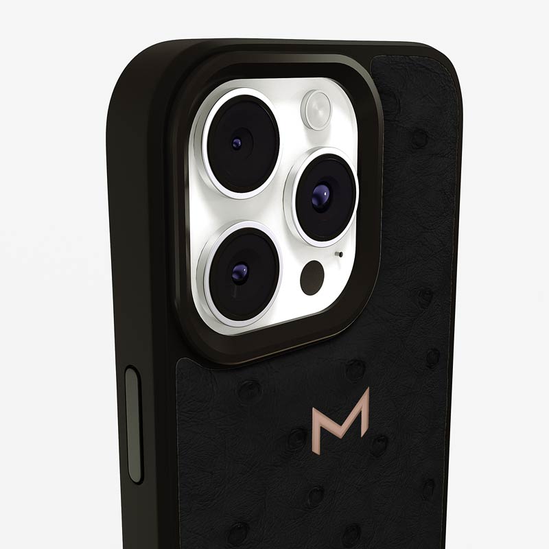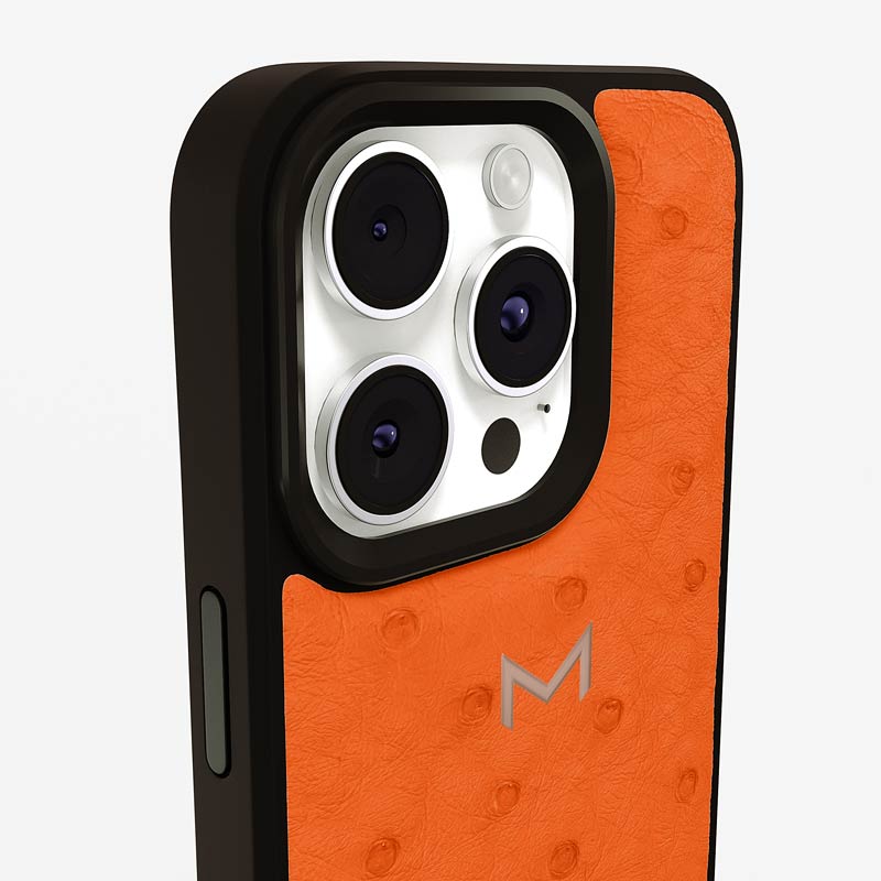 Exclusively made to order and entirely handcrafted, this iPhone 16 Pro Max case is sheathed in hand-selected, full-quill ostrich leather — valued for its supple texture, natural markings, and unmistakable character. Inside, a soft Alcantara lining cradles your device, preserving its flawless condition. The hand-polished 316L stainless steel logo and camera ring reflect a commitment to detail and craftsmanship rarely seen.