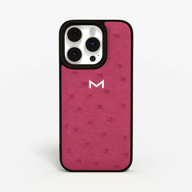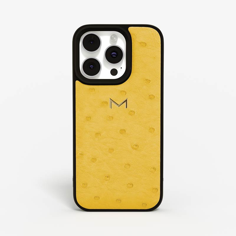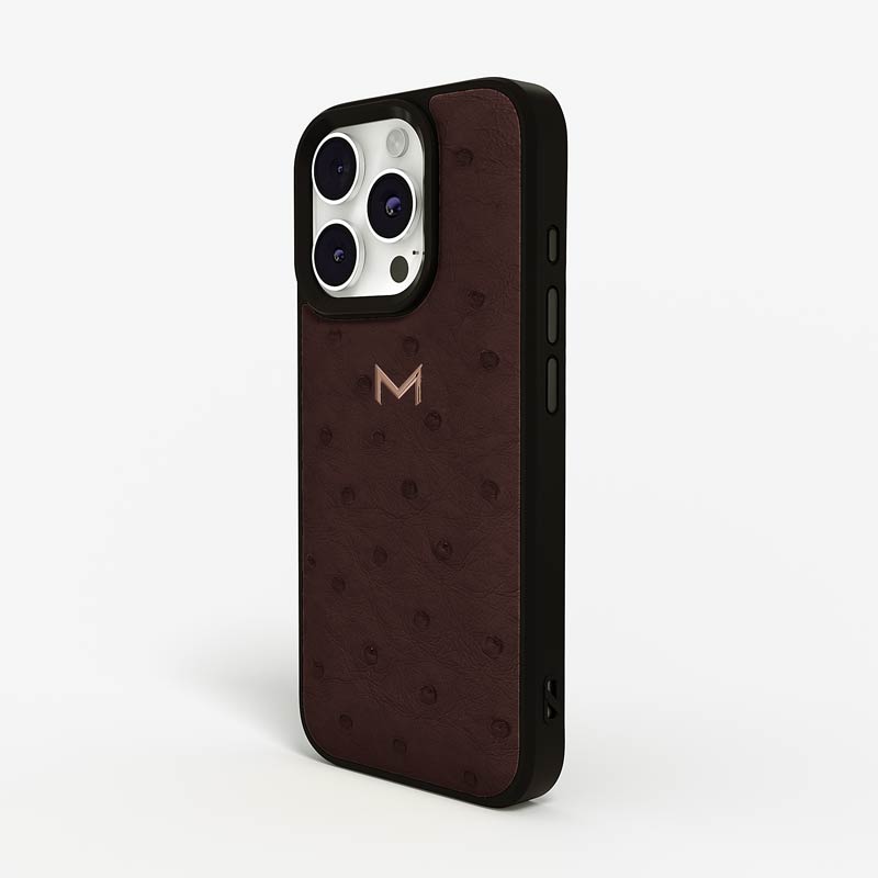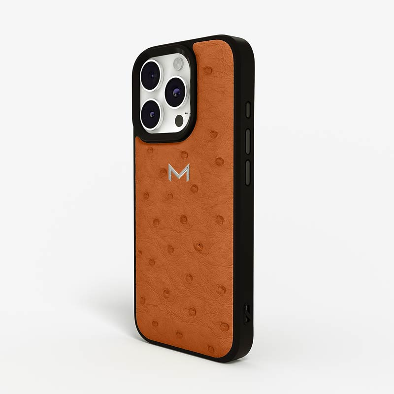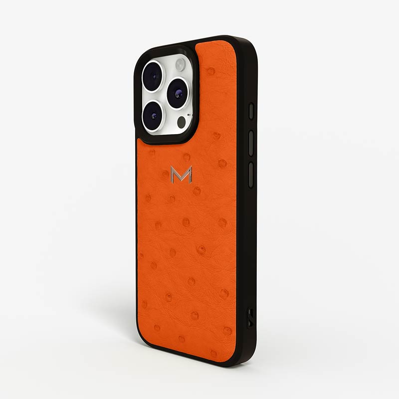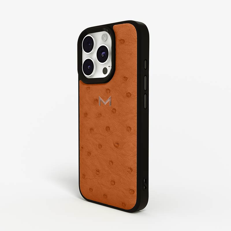 Exclusively made to order and entirely handcrafted, this iPhone 16 Pro Max case is sheathed in hand-selected, full-quill ostrich leather — valued for its supple texture, natural markings, and unmistakable character. Inside, a soft Alcantara lining cradles your device, preserving its flawless condition. The hand-polished 316L stainless steel logo and camera ring reflect a commitment to detail and craftsmanship rarely seen.