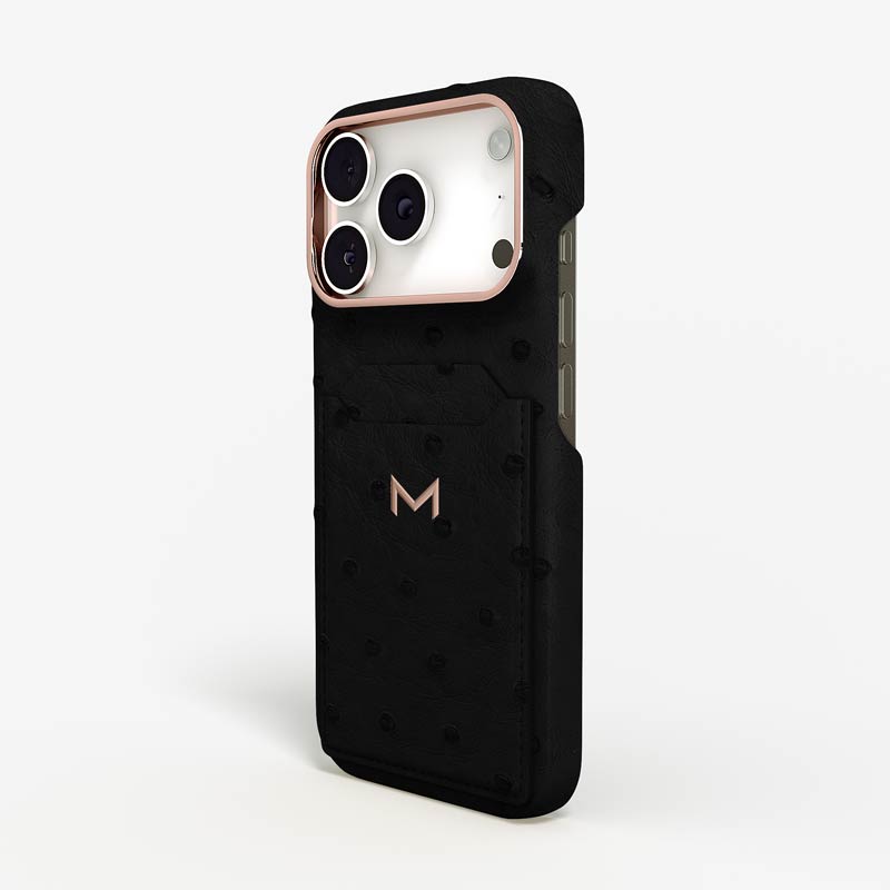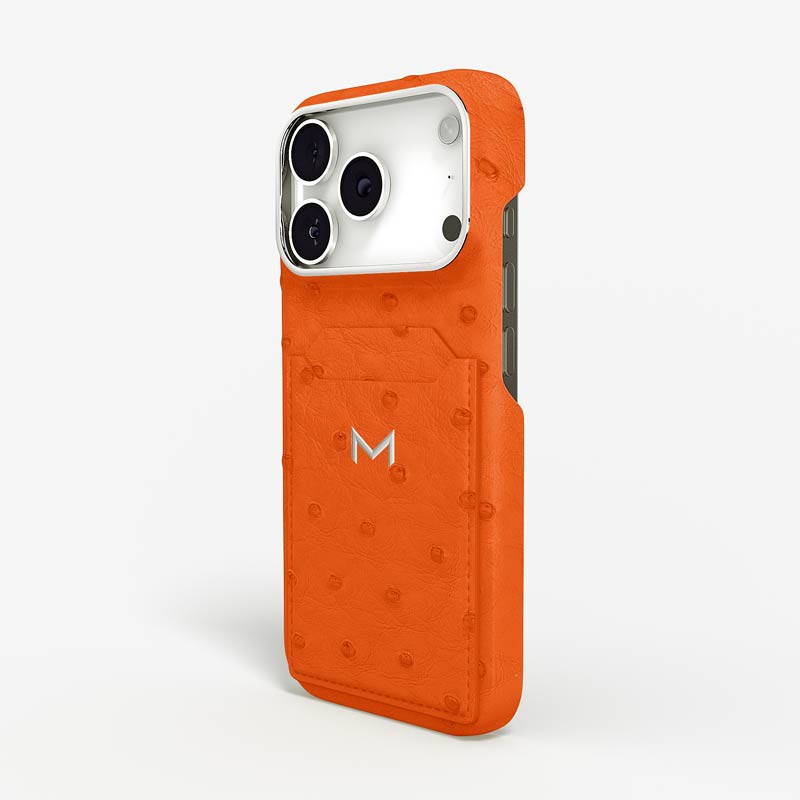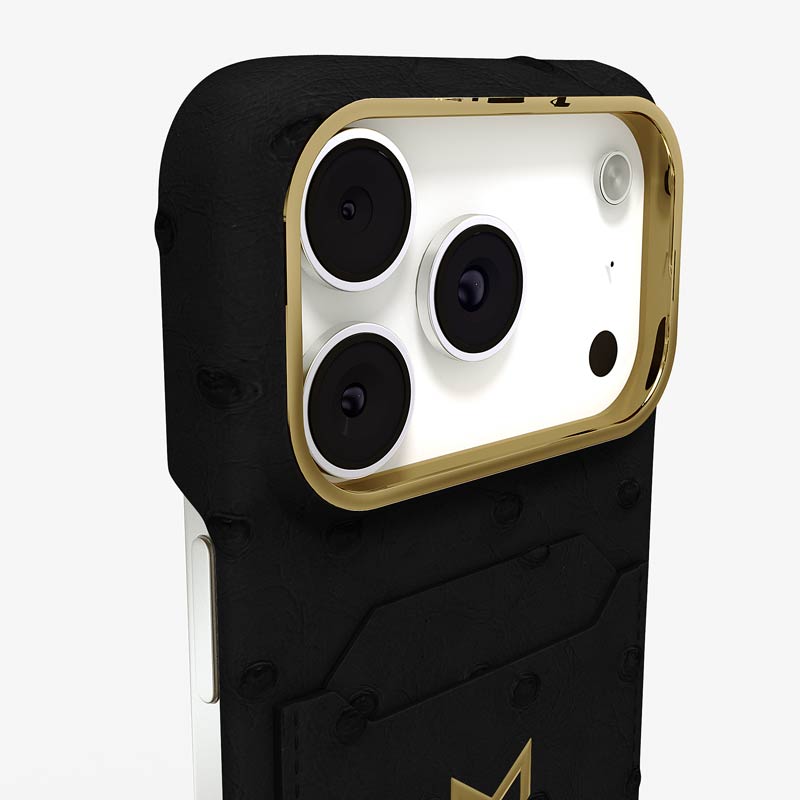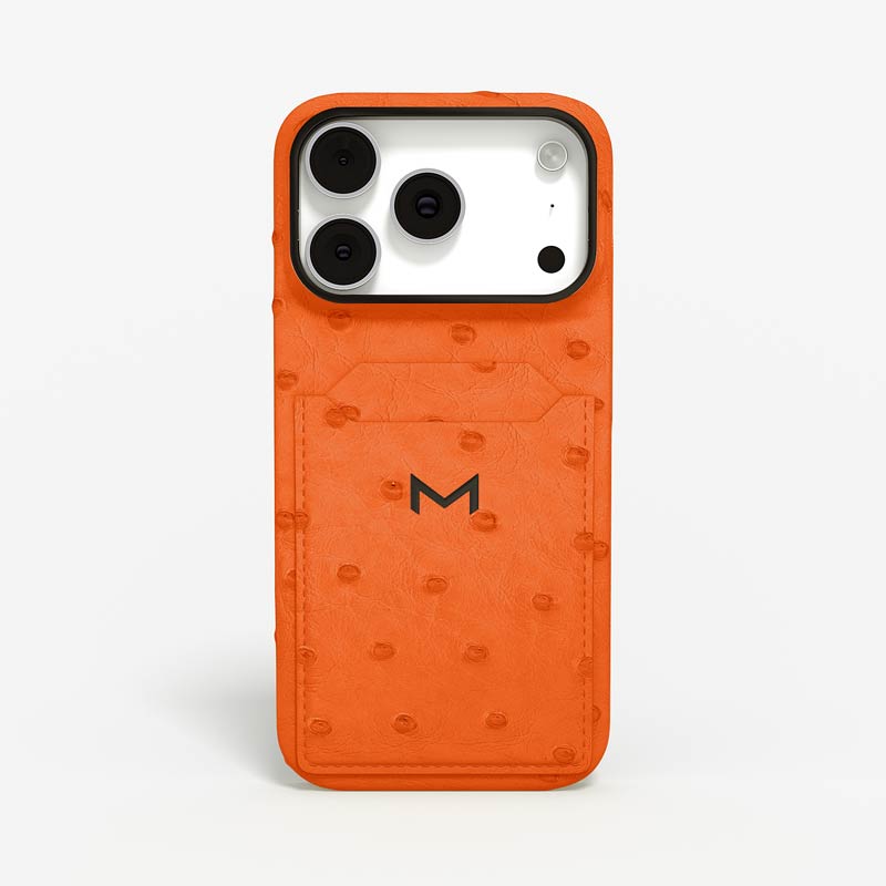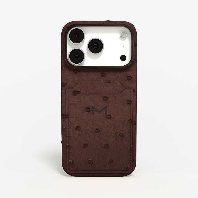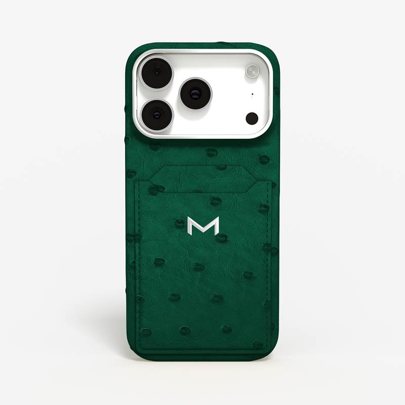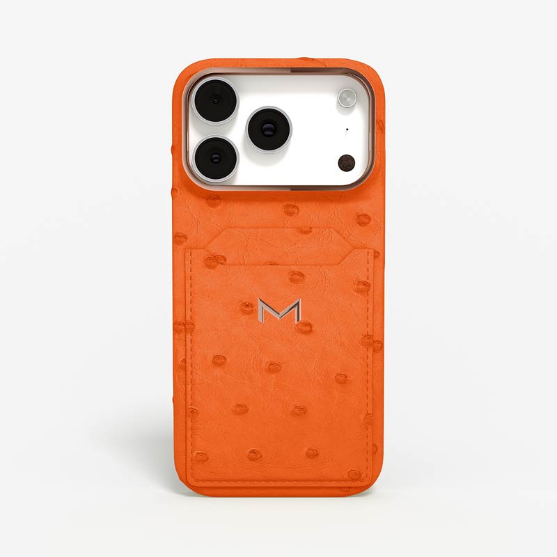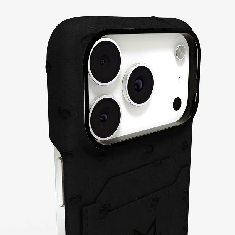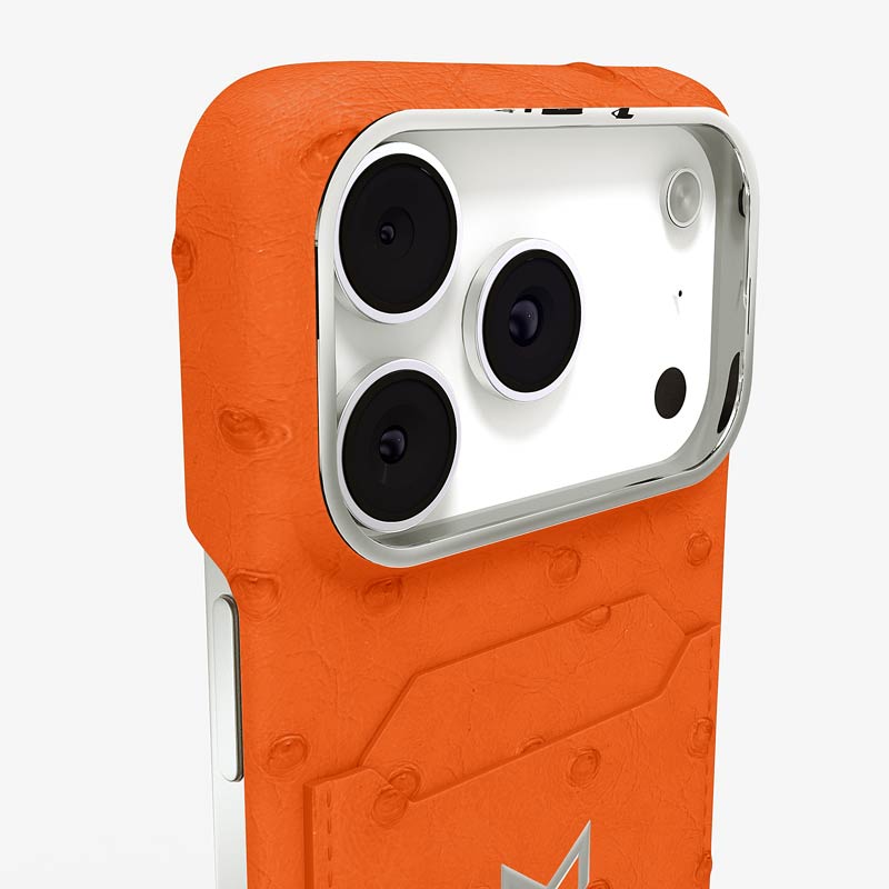Exclusively made to order and entirely handcrafted, this iPhone 17 Pro case is sheathed in hand-selected, full-quill ostrich leather — valued for its supple texture, natural markings, and unmistakable character. Inside, a soft Alcantara lining cradles your device, preserving its flawless condition. The hand-polished 316L stainless steel logo and camera ring reflect a commitment to detail and craftsmanship rarely seen.