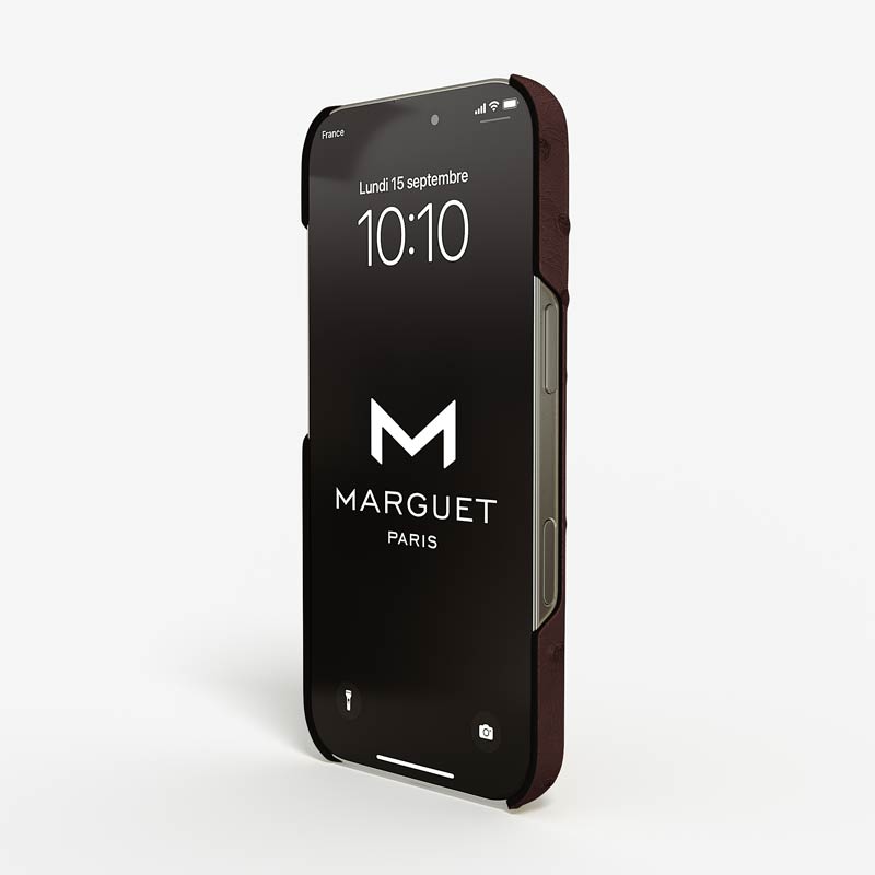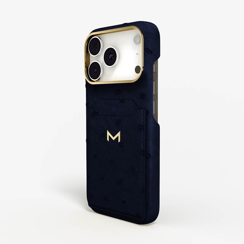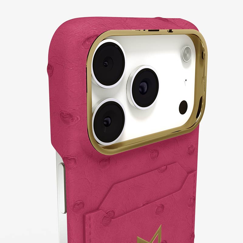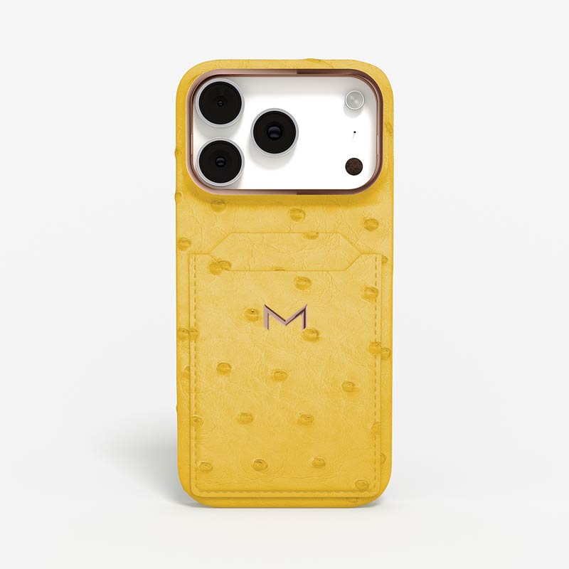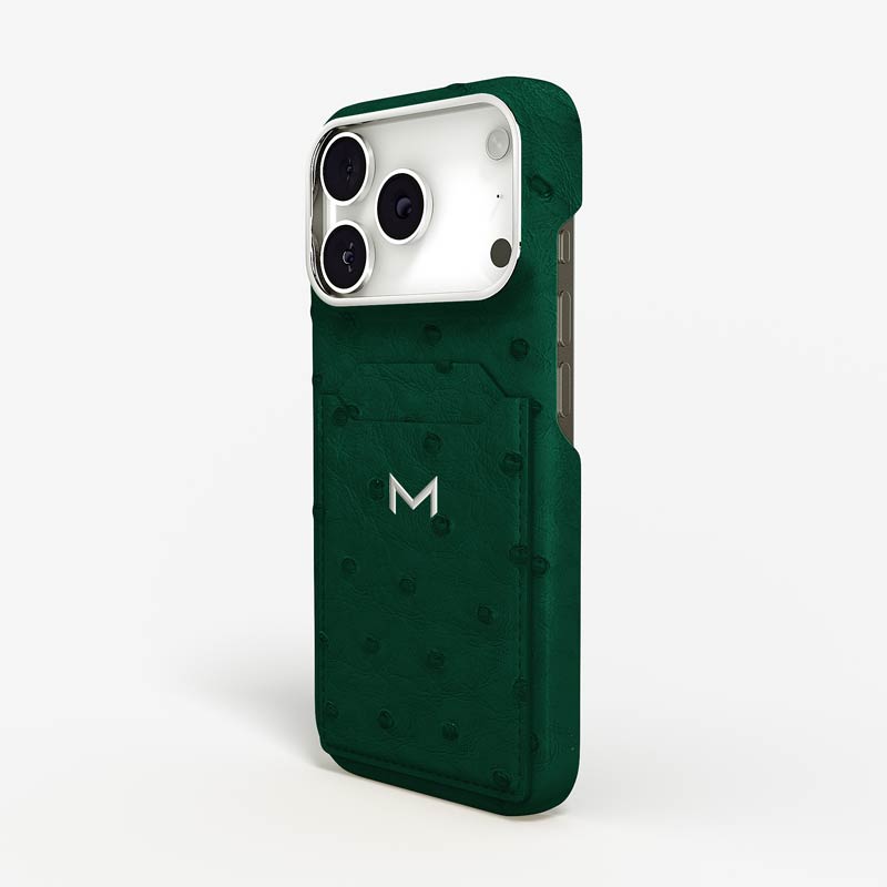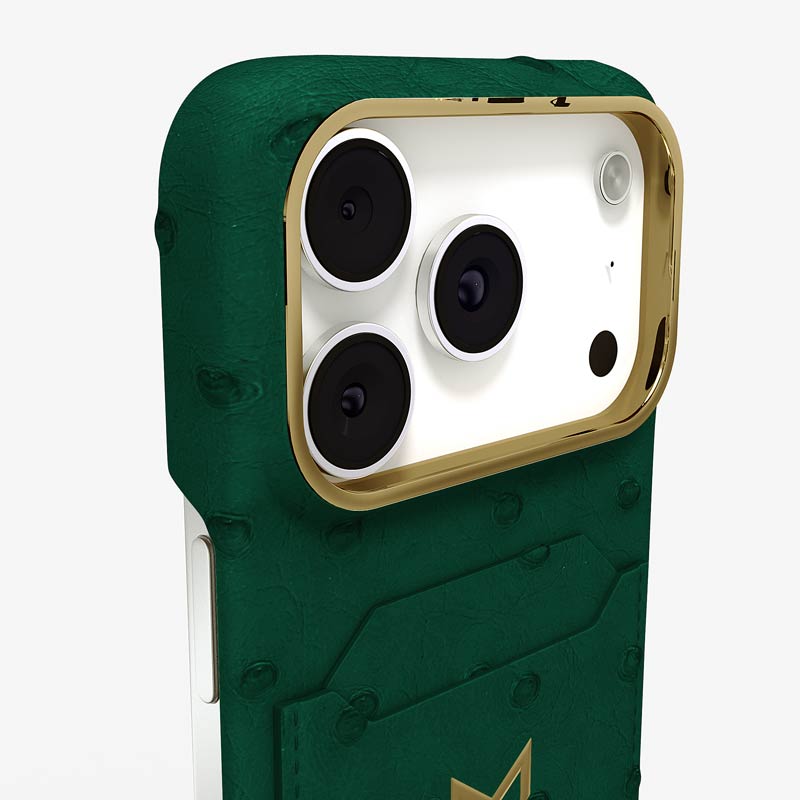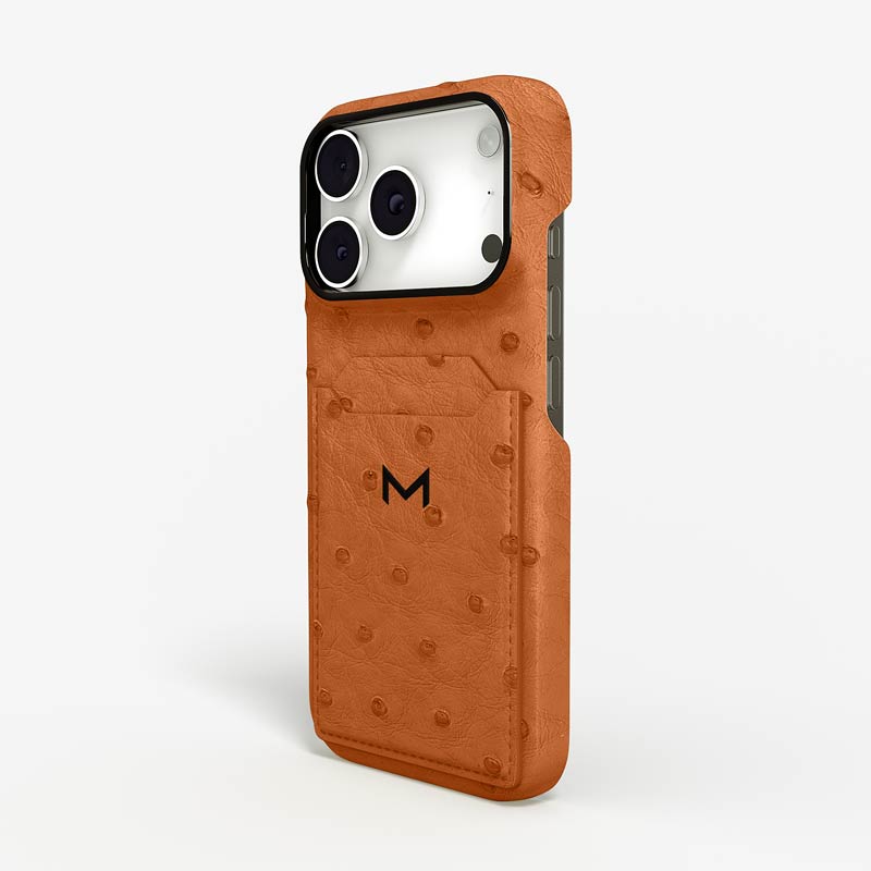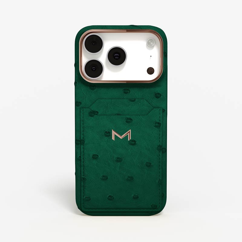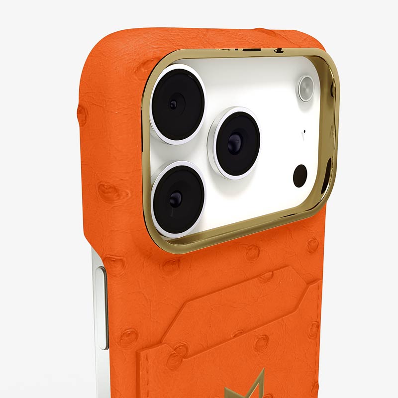 Exclusively made to order and entirely handcrafted, this iPhone 17 Pro case is sheathed in hand-selected, full-quill ostrich leather — valued for its supple texture, natural markings, and unmistakable character. Inside, a soft Alcantara lining cradles your device, preserving its flawless condition. The hand-polished 316L stainless steel logo and camera ring reflect a commitment to detail and craftsmanship rarely seen.