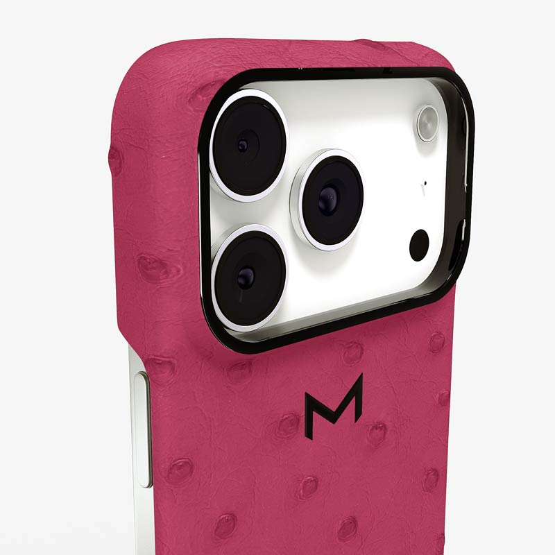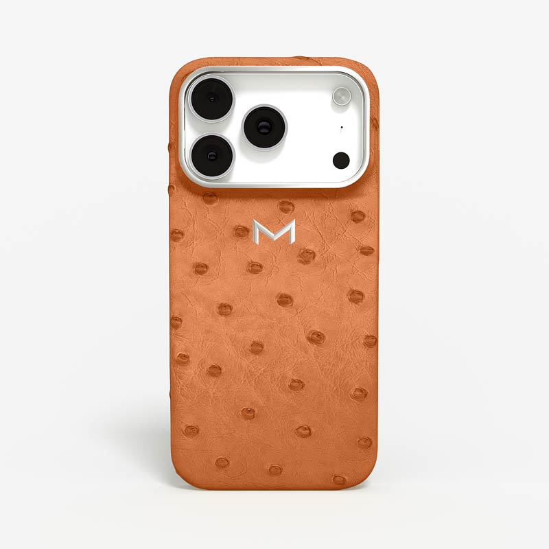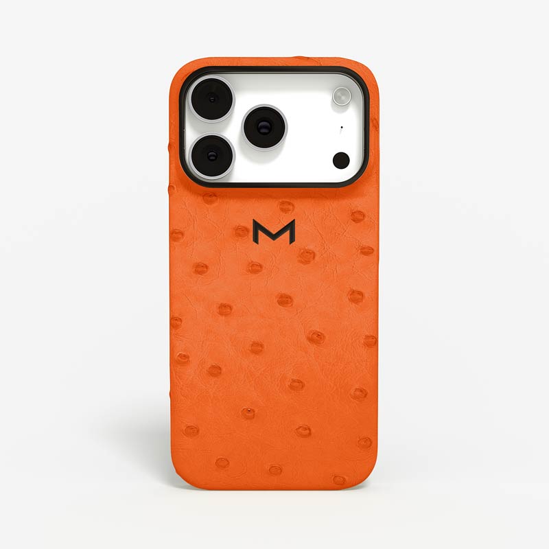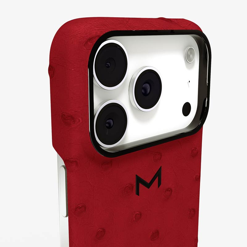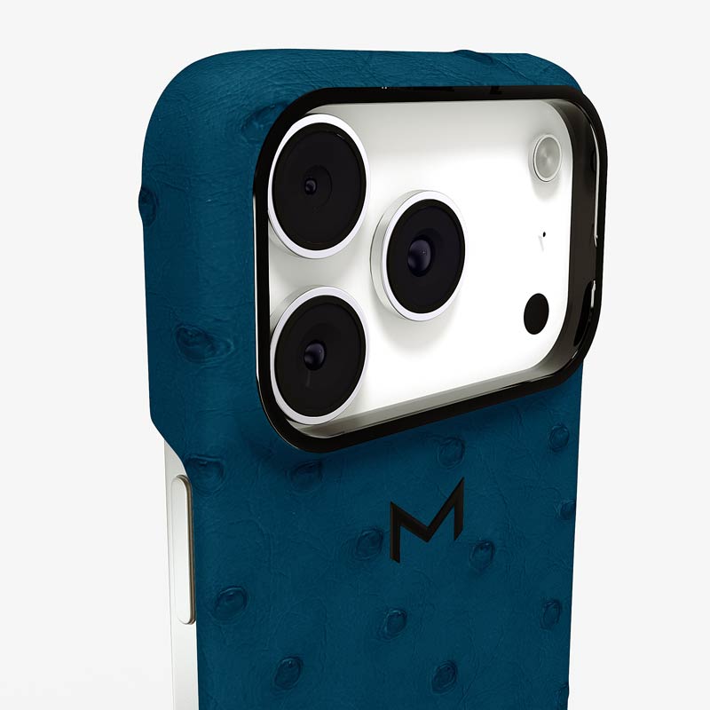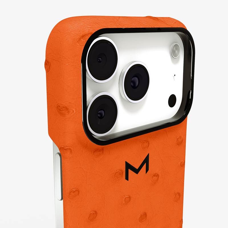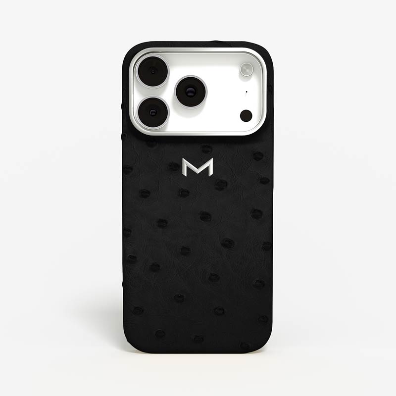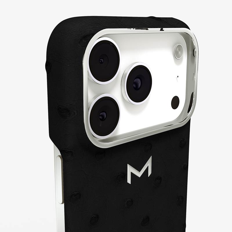 Exclusively made to order and entirely handcrafted, this iPhone 17 Pro case is sheathed in hand-selected, full-quill ostrich leather — valued for its supple texture, natural markings, and unmistakable character. Inside, a soft Alcantara lining cradles your device, preserving its flawless condition. The hand-polished 316L stainless steel logo and camera ring reflect a commitment to detail and craftsmanship rarely seen.