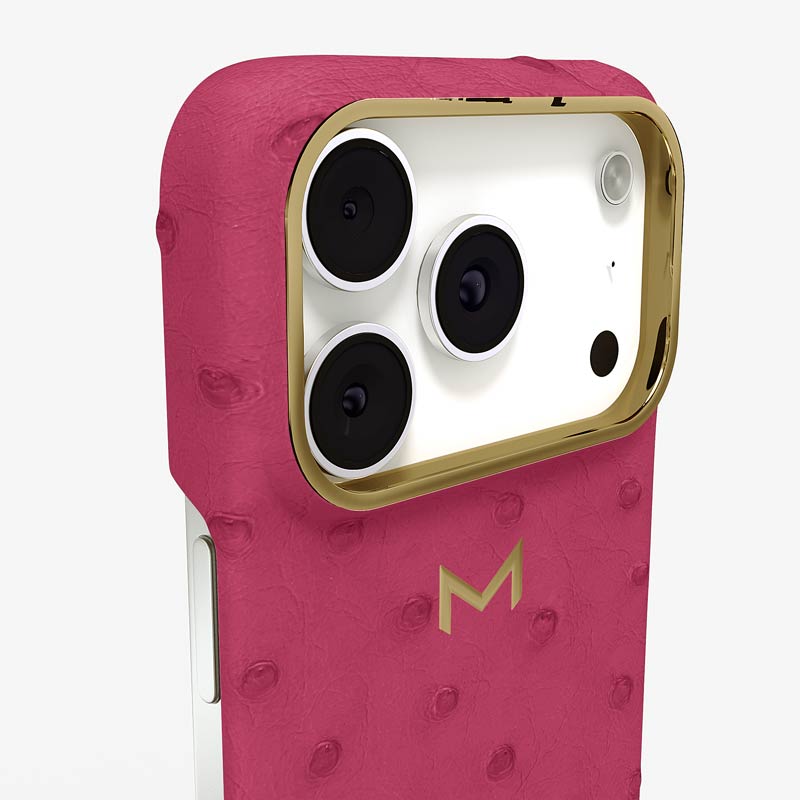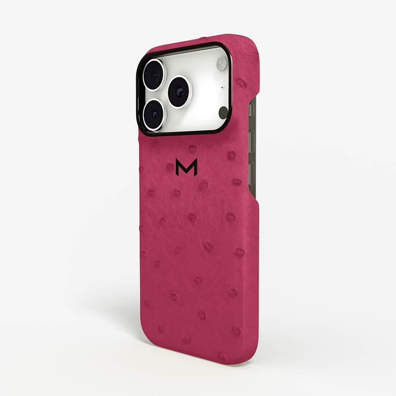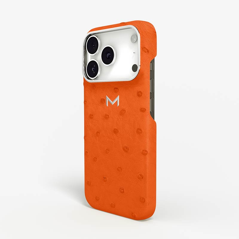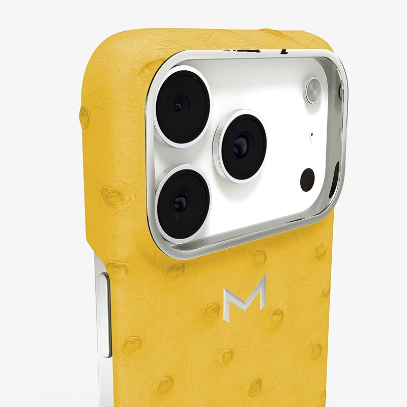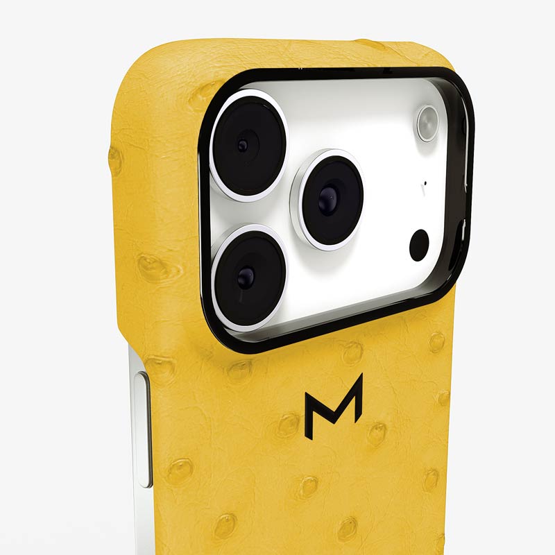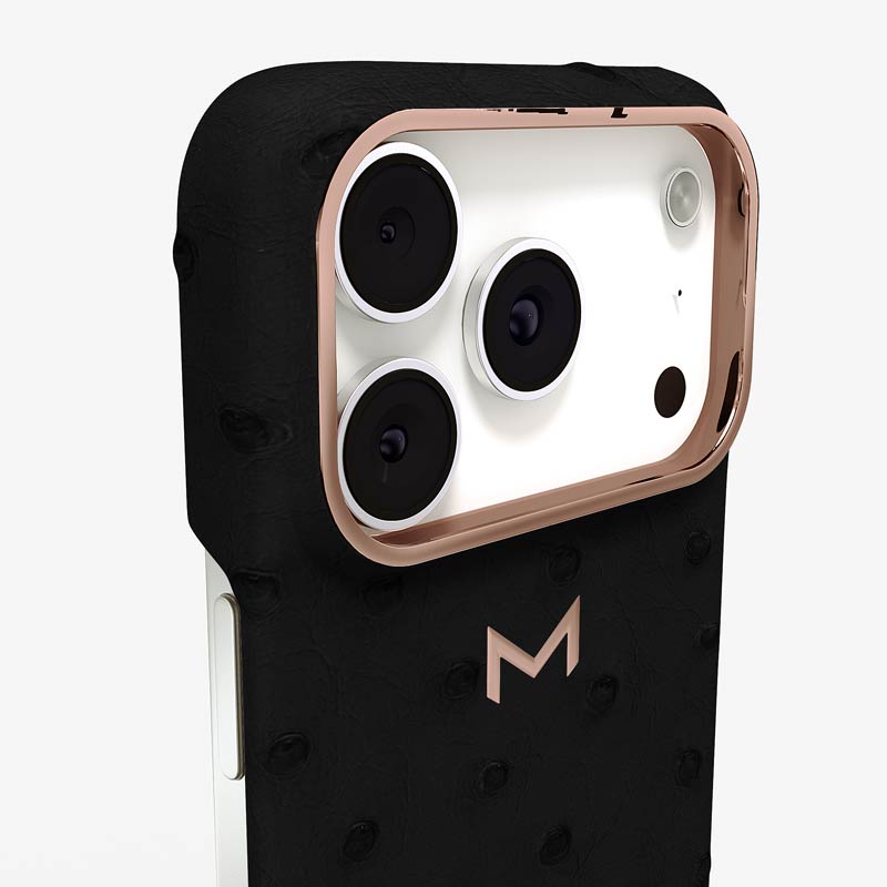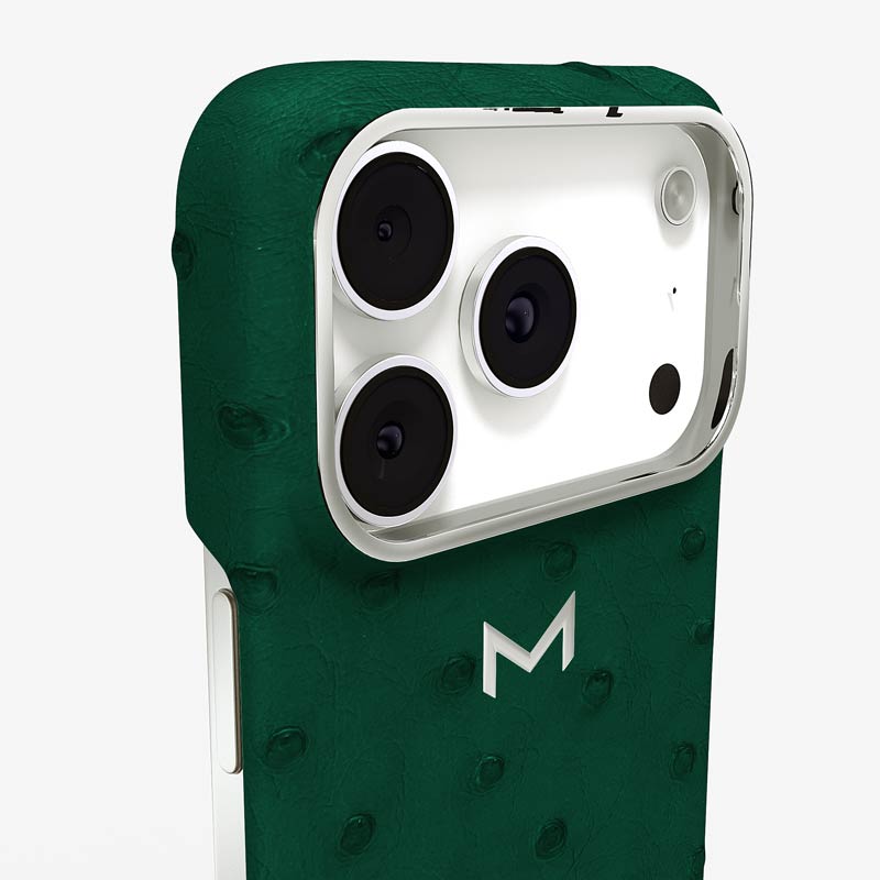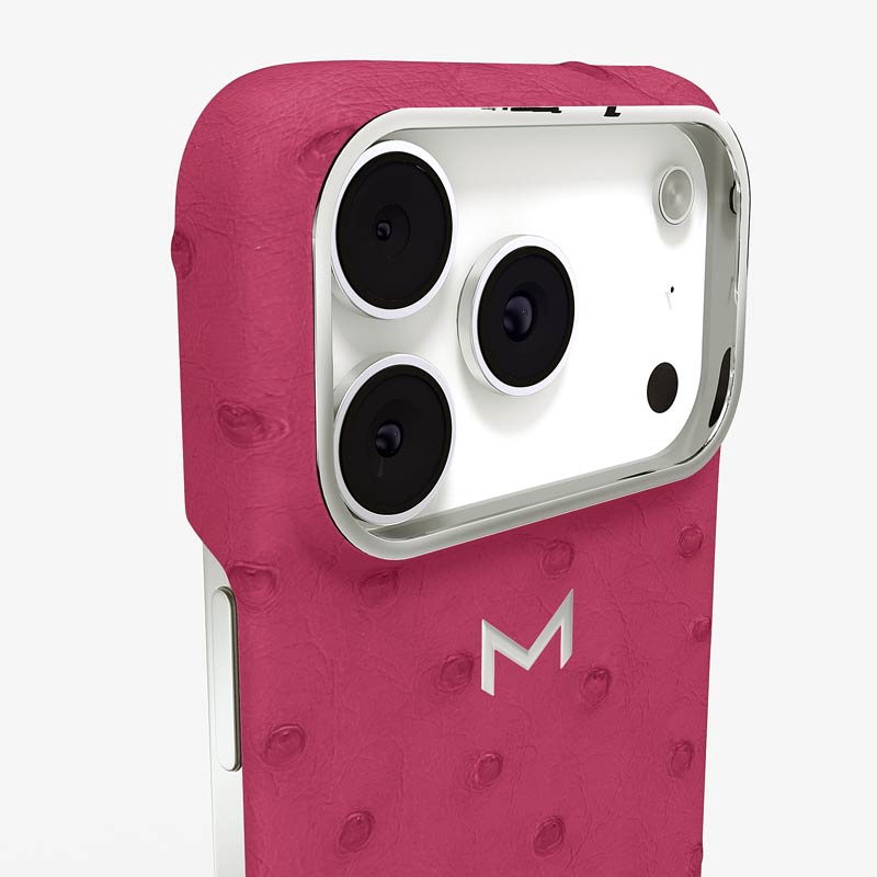 Exclusively made to order and entirely handcrafted, this iPhone 17 Pro case is sheathed in hand-selected, full-quill ostrich leather — valued for its supple texture, natural markings, and unmistakable character. Inside, a soft Alcantara lining cradles your device, preserving its flawless condition. The hand-polished 316L stainless steel logo and camera ring reflect a commitment to detail and craftsmanship rarely seen.