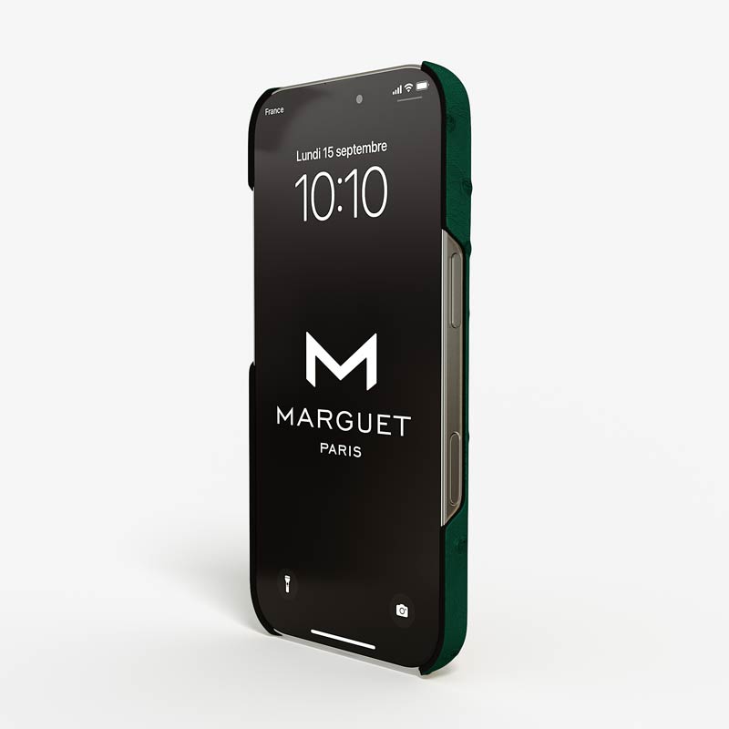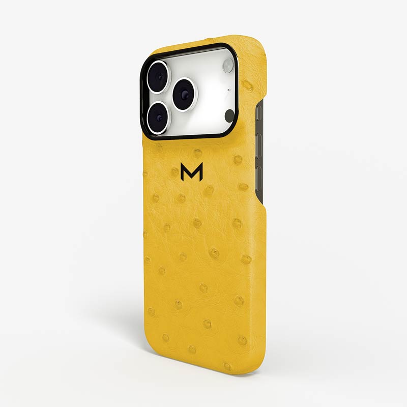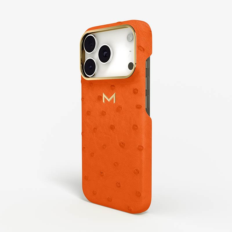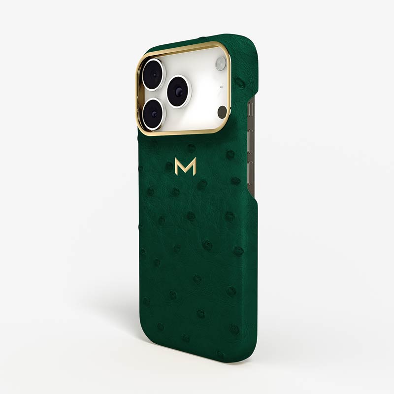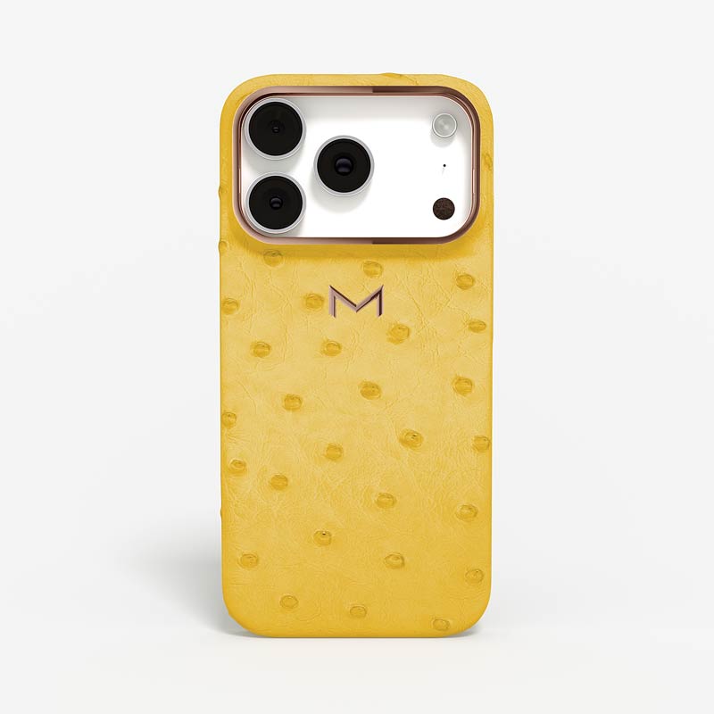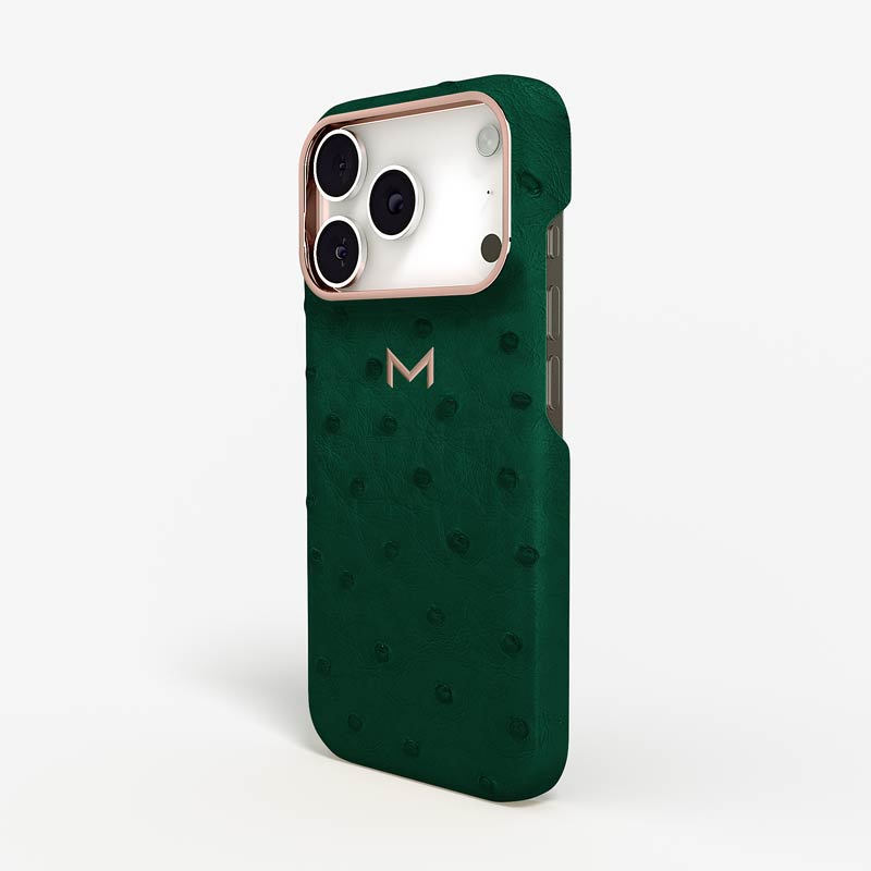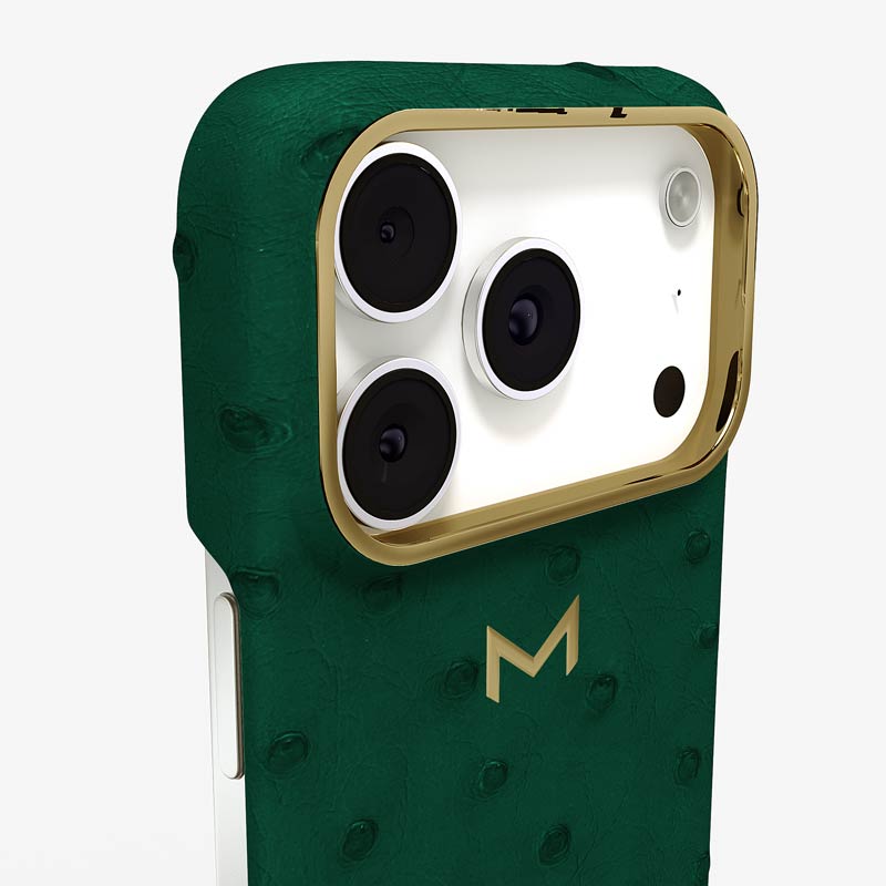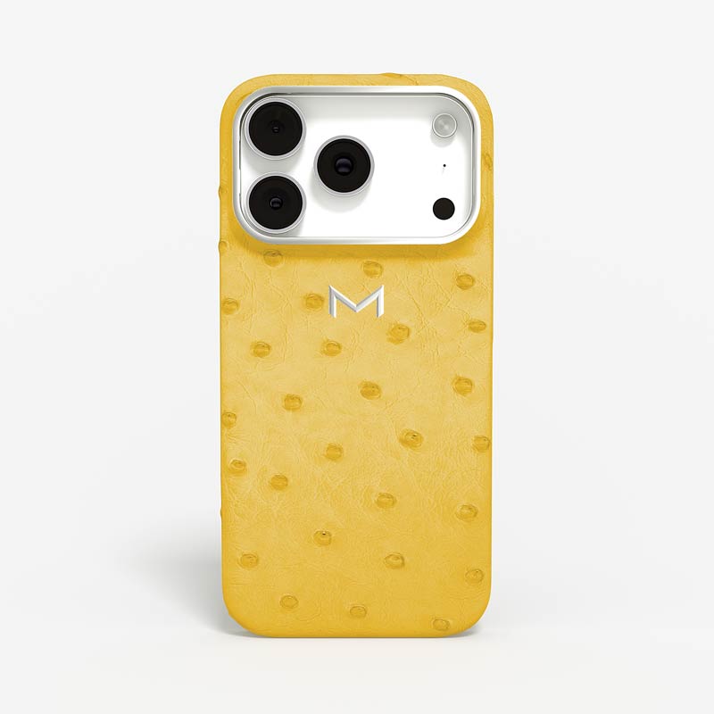Exclusively made to order and entirely handcrafted, this iPhone 17 Pro case is sheathed in hand-selected, full-quill ostrich leather — valued for its supple texture, natural markings, and unmistakable character. Inside, a soft Alcantara lining cradles your device, preserving its flawless condition. The hand-polished 316L stainless steel logo and camera ring reflect a commitment to detail and craftsmanship rarely seen.