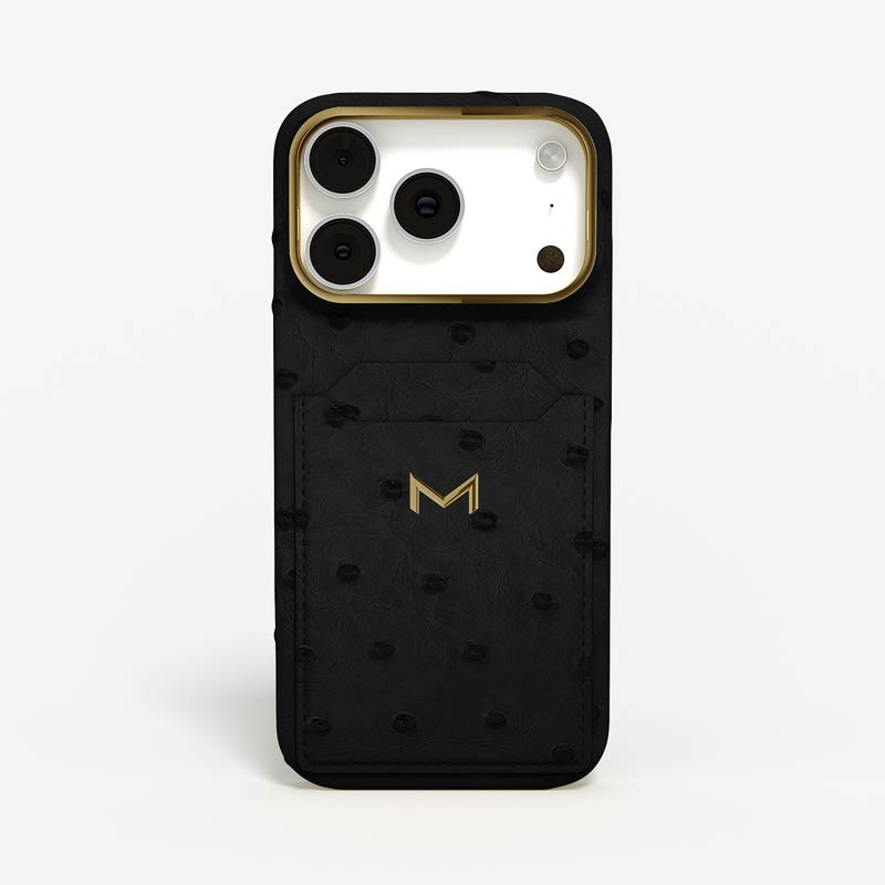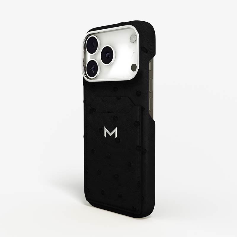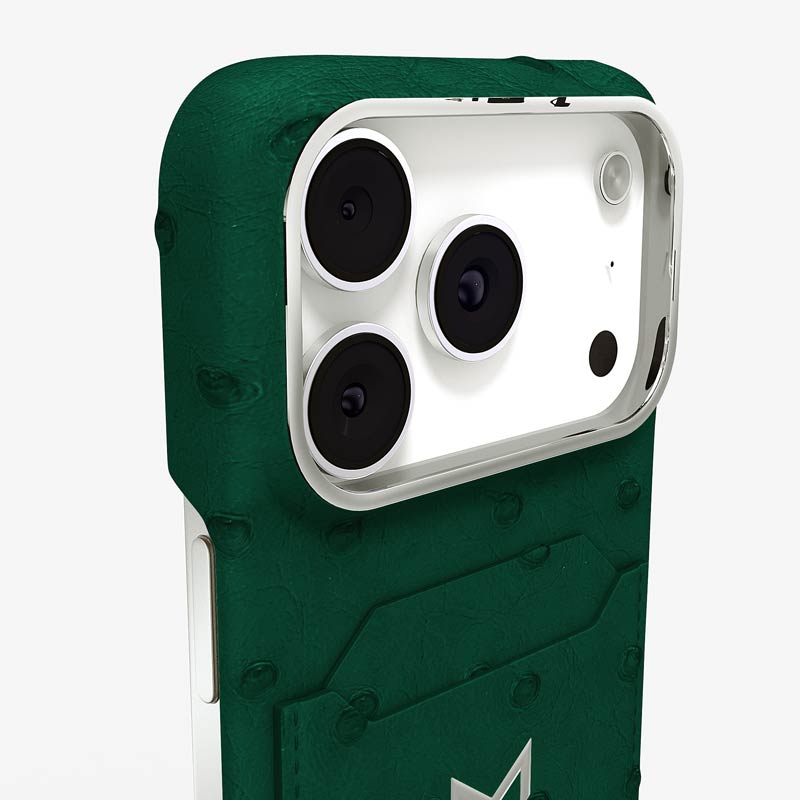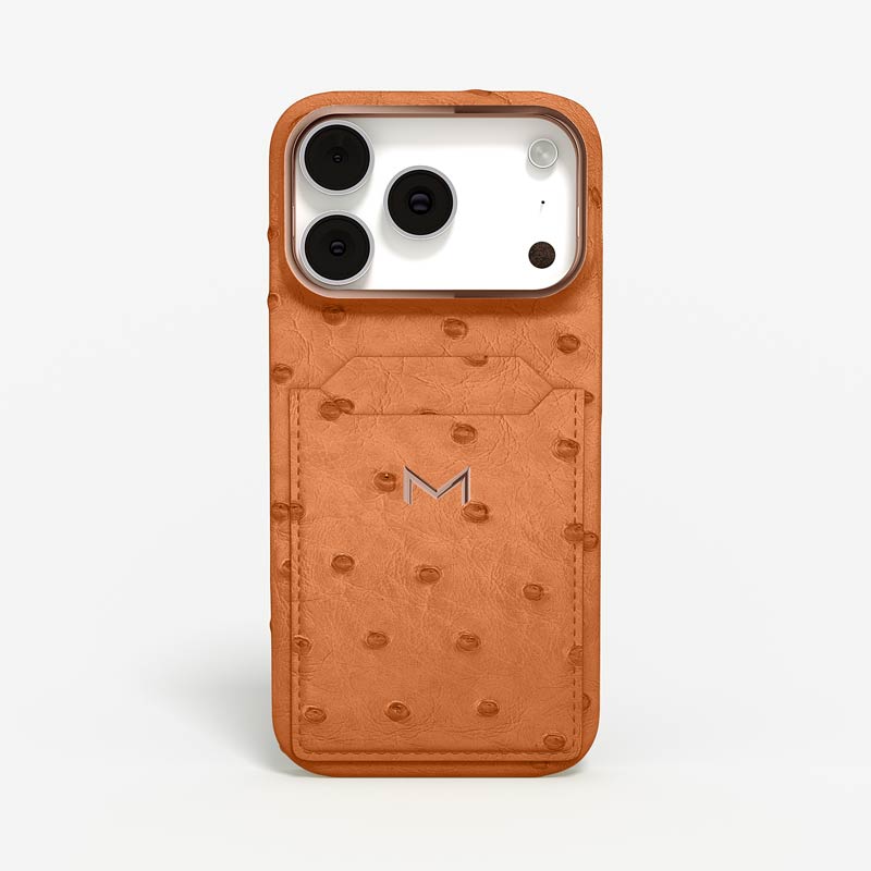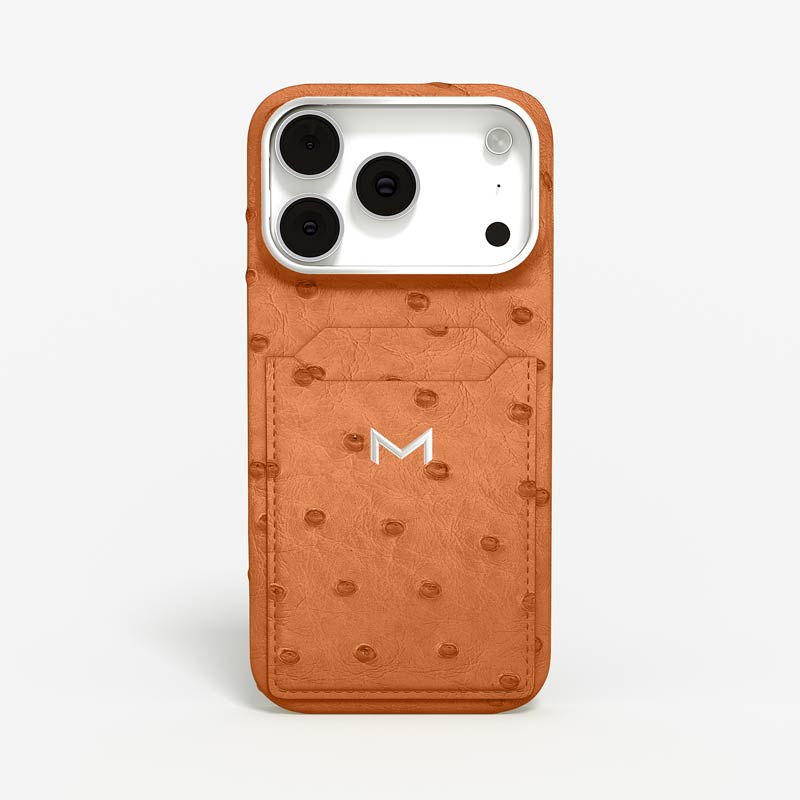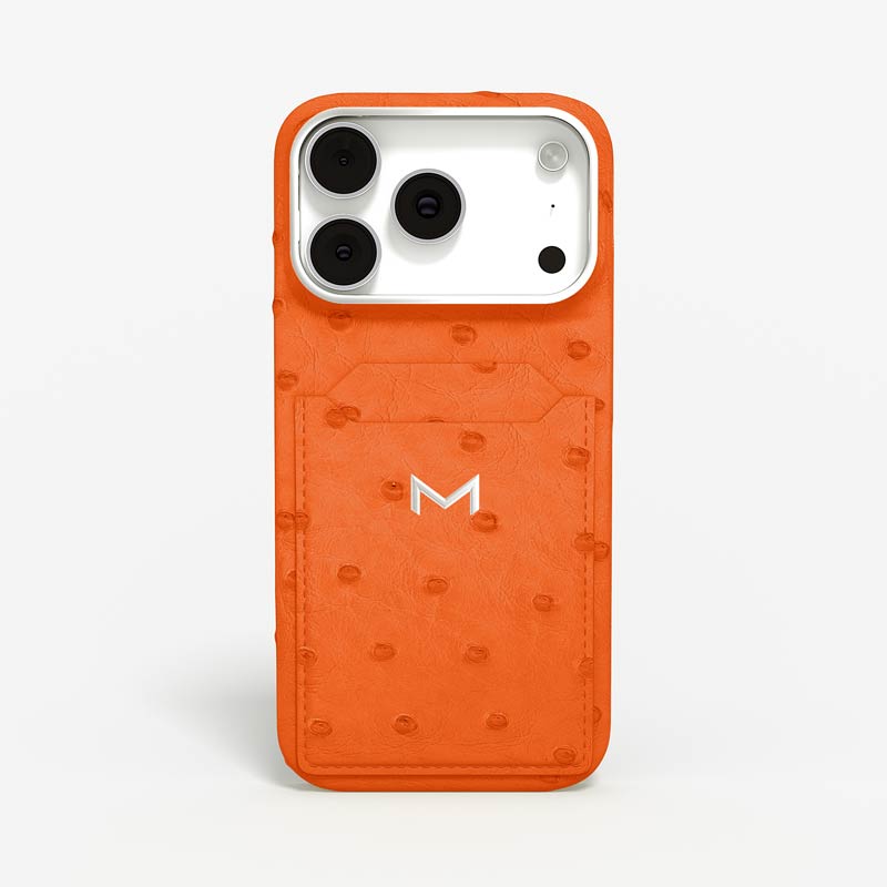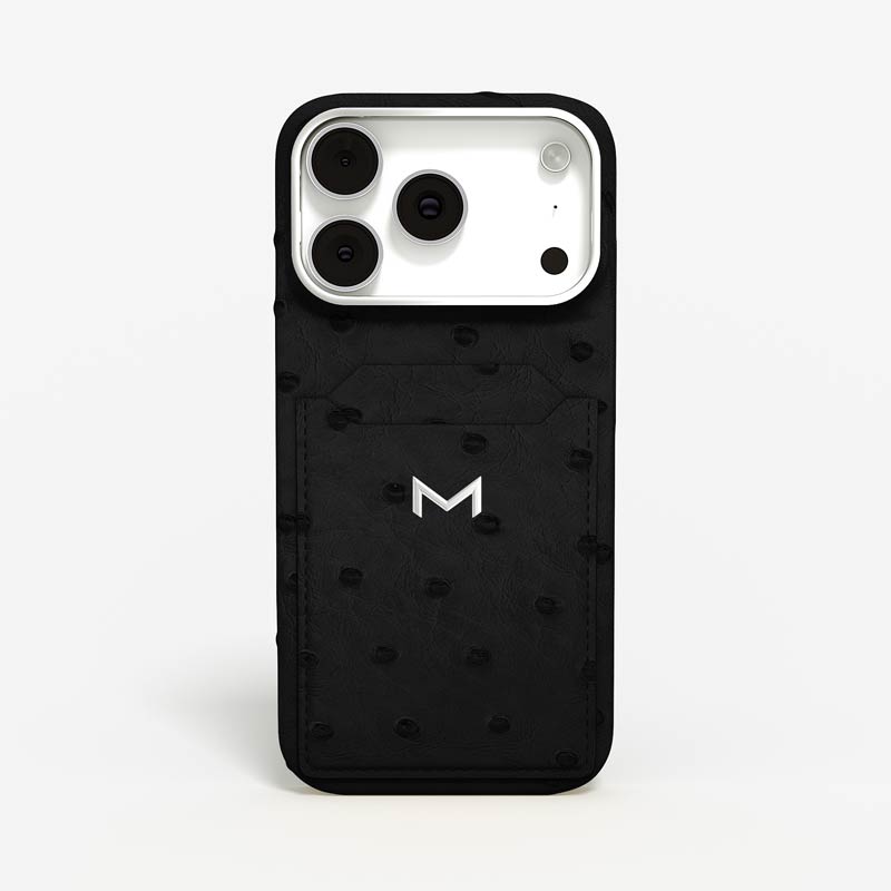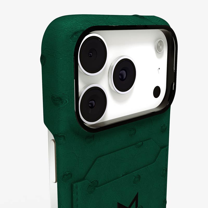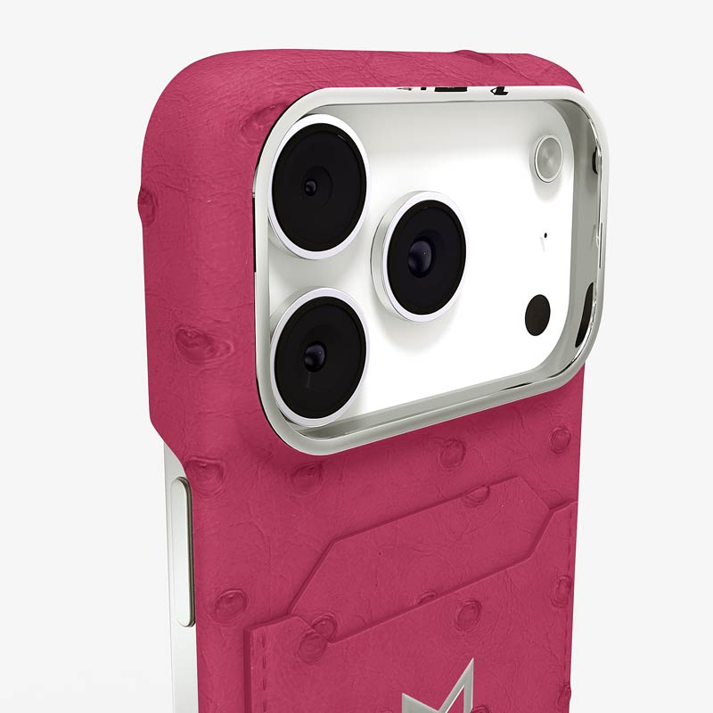 Exclusively made to order and entirely handcrafted, this iPhone 17 Pro Max case is sheathed in hand-selected, full-quill ostrich leather — valued for its supple texture, natural markings, and unmistakable character. Inside, a soft Alcantara lining cradles your device, preserving its flawless condition. The hand-polished 316L stainless steel logo and camera ring reflect a commitment to detail and craftsmanship rarely seen.