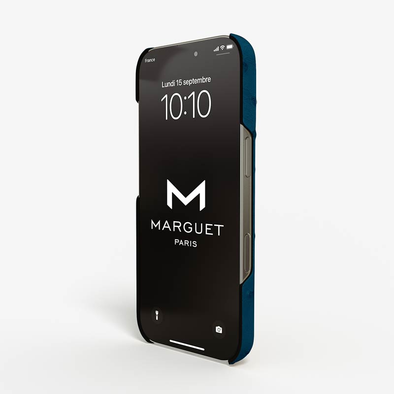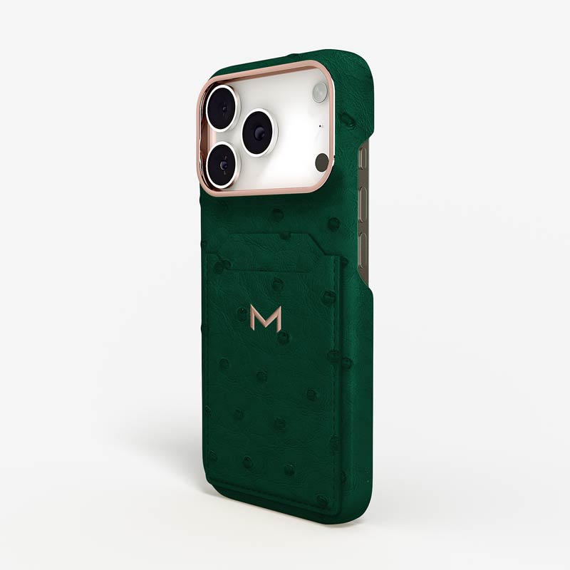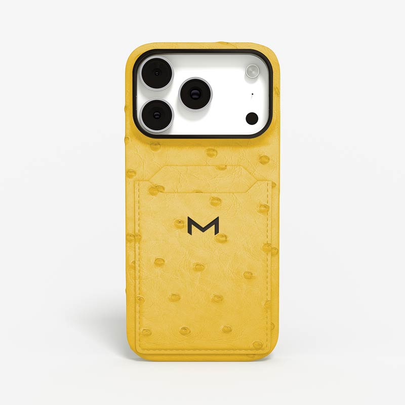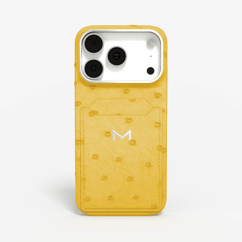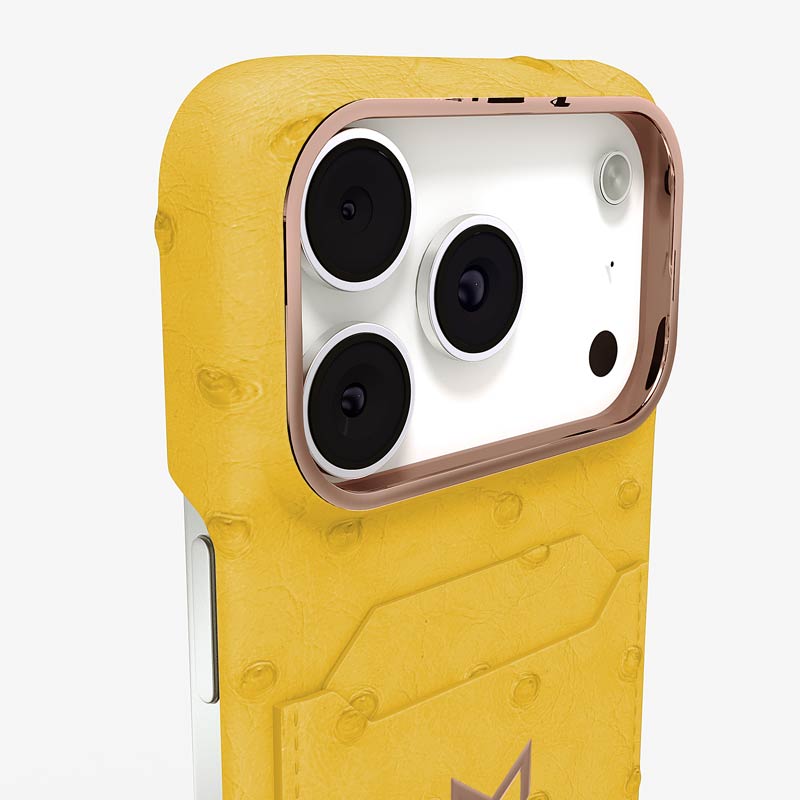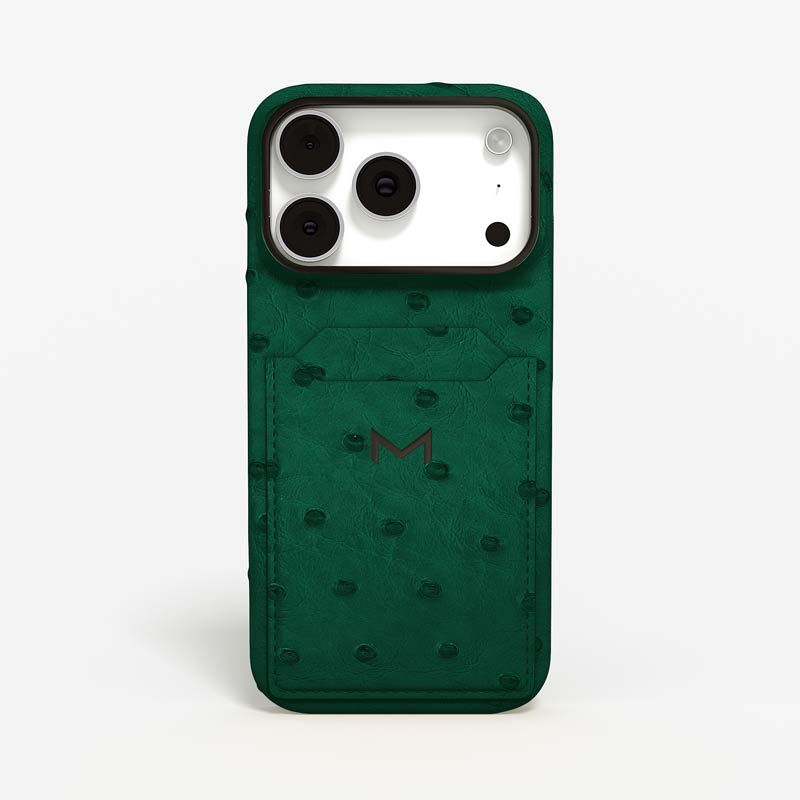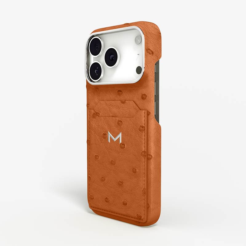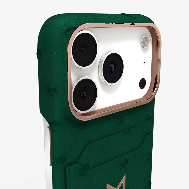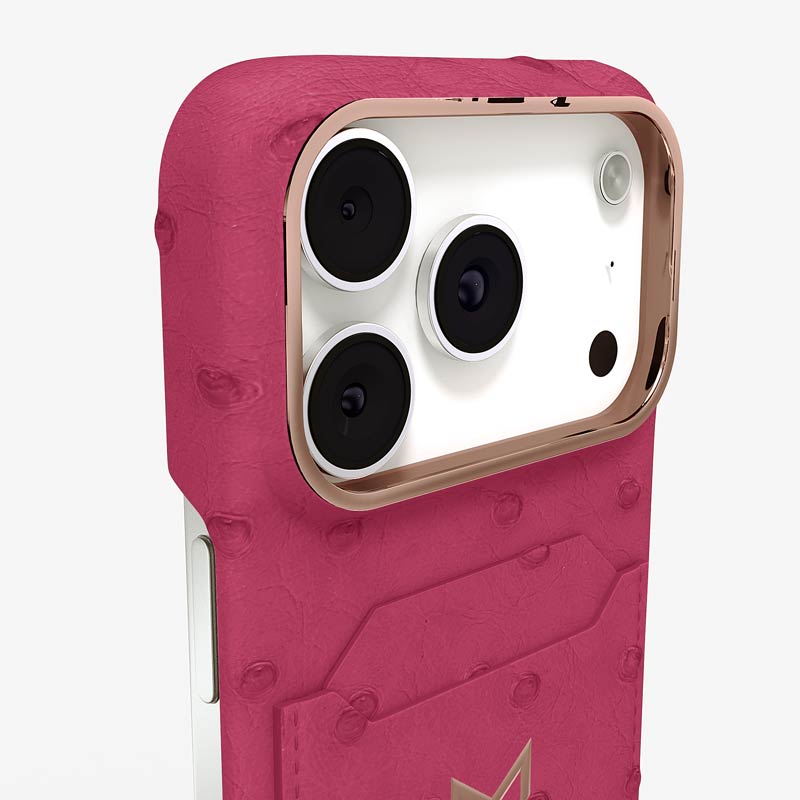 Exclusively made to order and entirely handcrafted, this iPhone 17 Pro Max case is sheathed in hand-selected, full-quill ostrich leather — valued for its supple texture, natural markings, and unmistakable character. Inside, a soft Alcantara lining cradles your device, preserving its flawless condition. The hand-polished 316L stainless steel logo and camera ring reflect a commitment to detail and craftsmanship rarely seen.