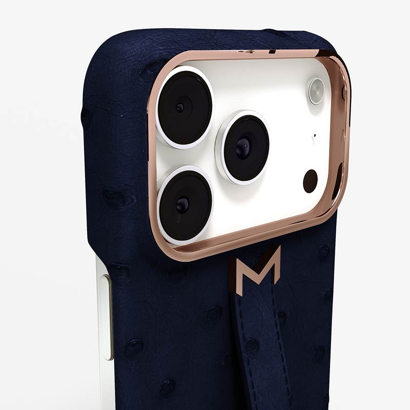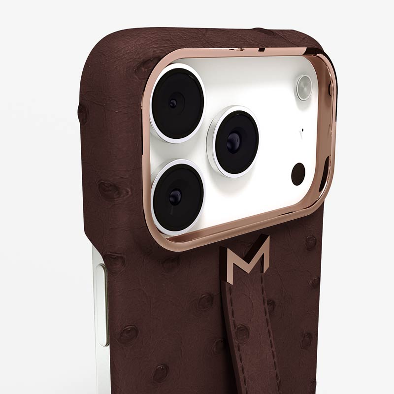 Exclusively made to order and entirely handcrafted, this iPhone 17 Pro Max case is sheathed in hand-selected, full-quill ostrich leather — valued for its supple texture, natural markings, and unmistakable character. Inside, a soft Alcantara lining cradles your device, preserving its flawless condition. The hand-polished 316L stainless steel logo and camera ring reflect a commitment to detail and craftsmanship rarely seen.