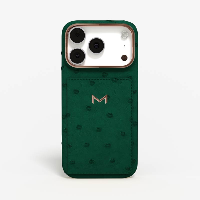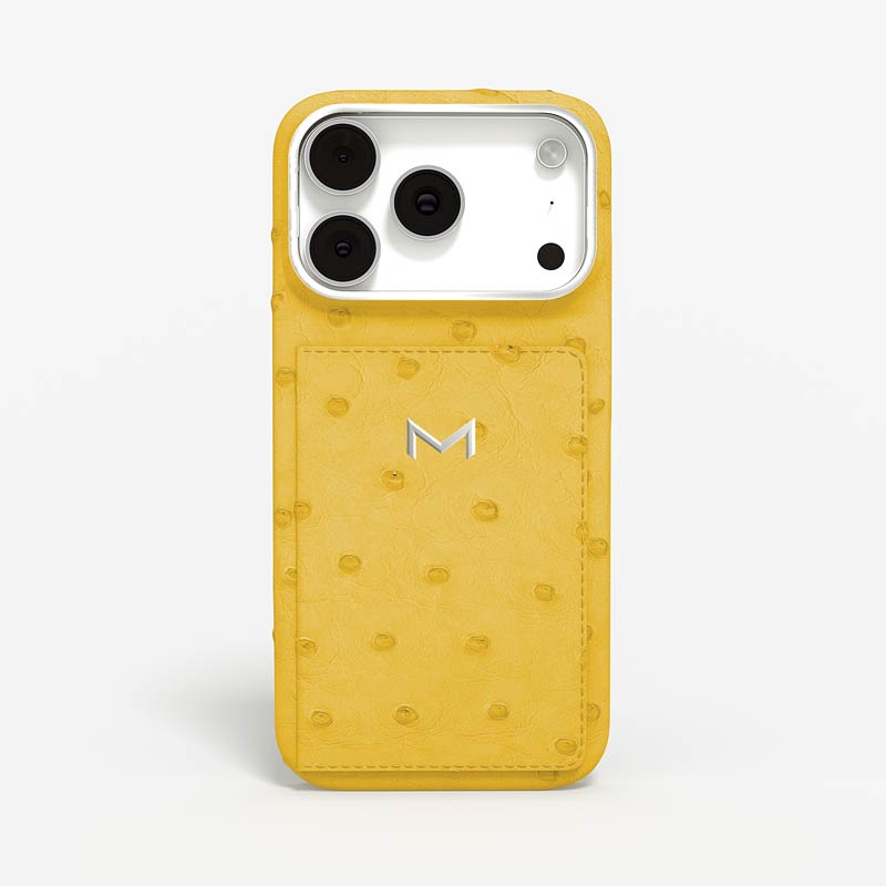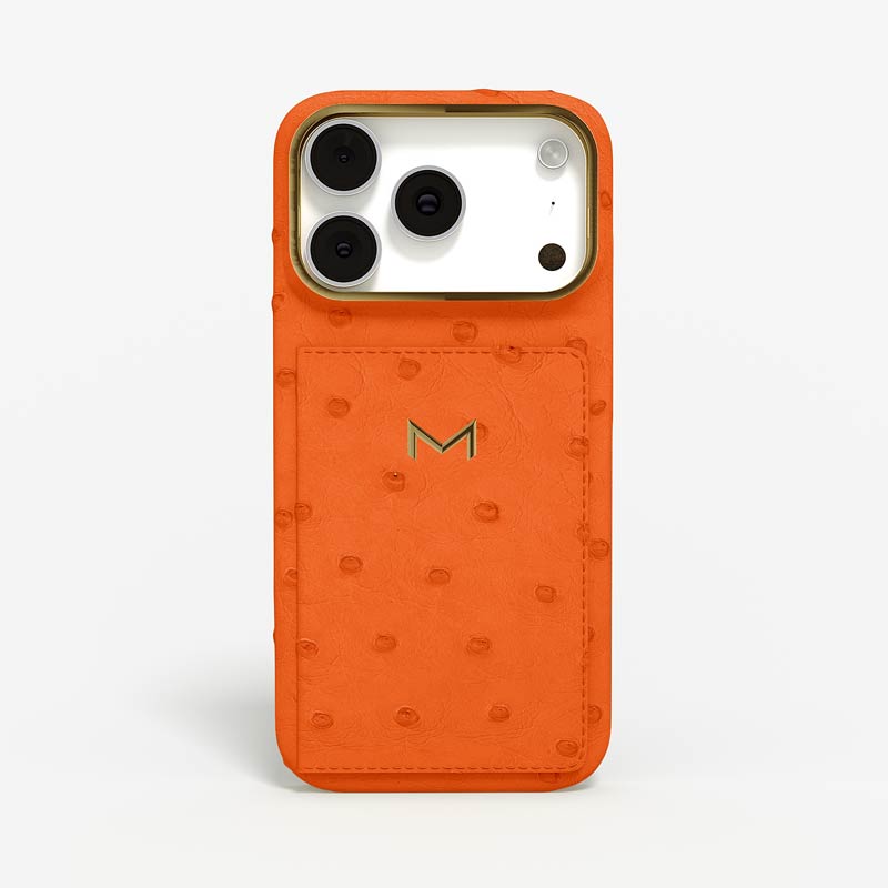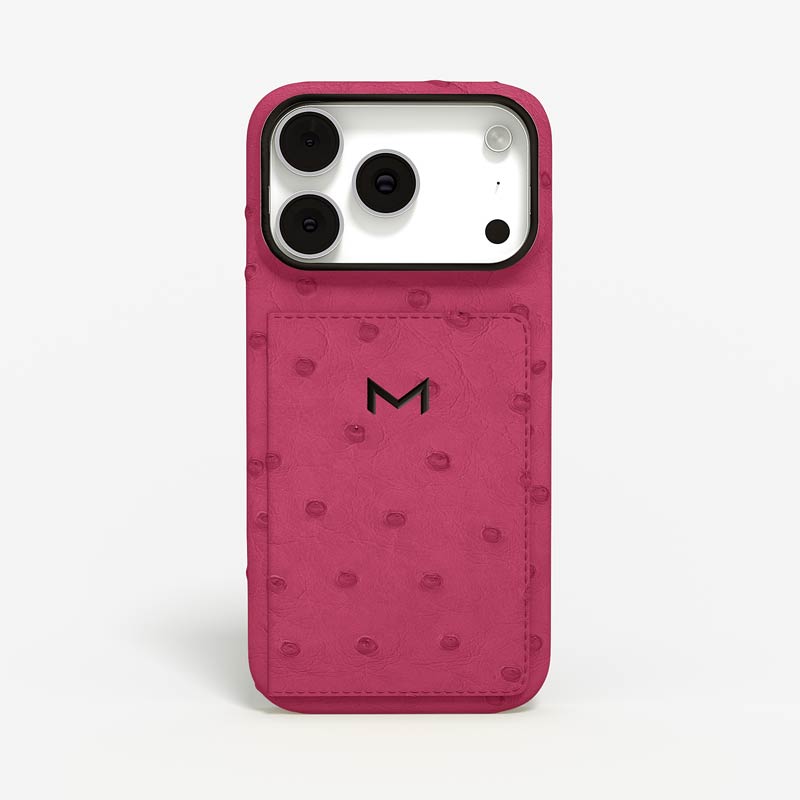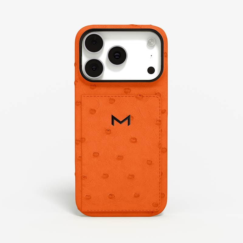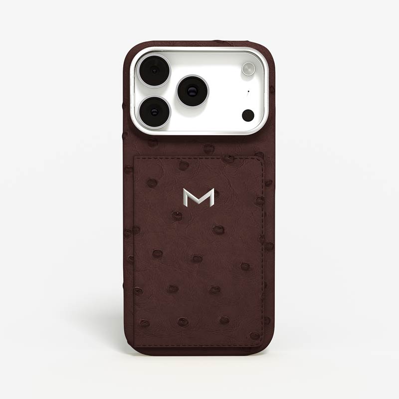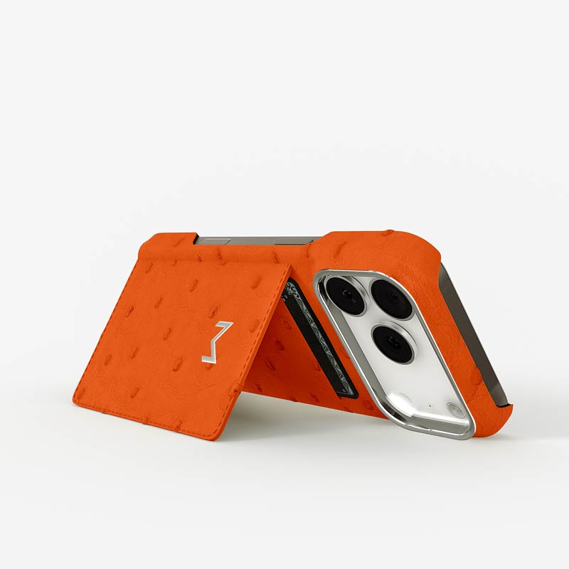 Exclusively made to order and entirely handcrafted, this iPhone 17 Pro Max case is sheathed in hand-selected, full-quill ostrich leather — valued for its supple texture, natural markings, and unmistakable character. Inside, a soft Alcantara lining cradles your device, preserving its flawless condition. The hand-polished 316L stainless steel logo and camera ring reflect a commitment to detail and craftsmanship rarely seen.