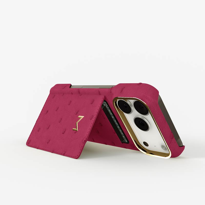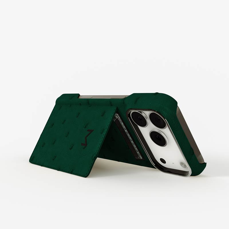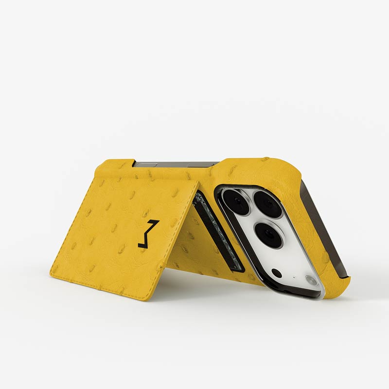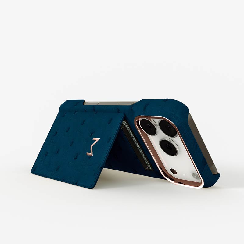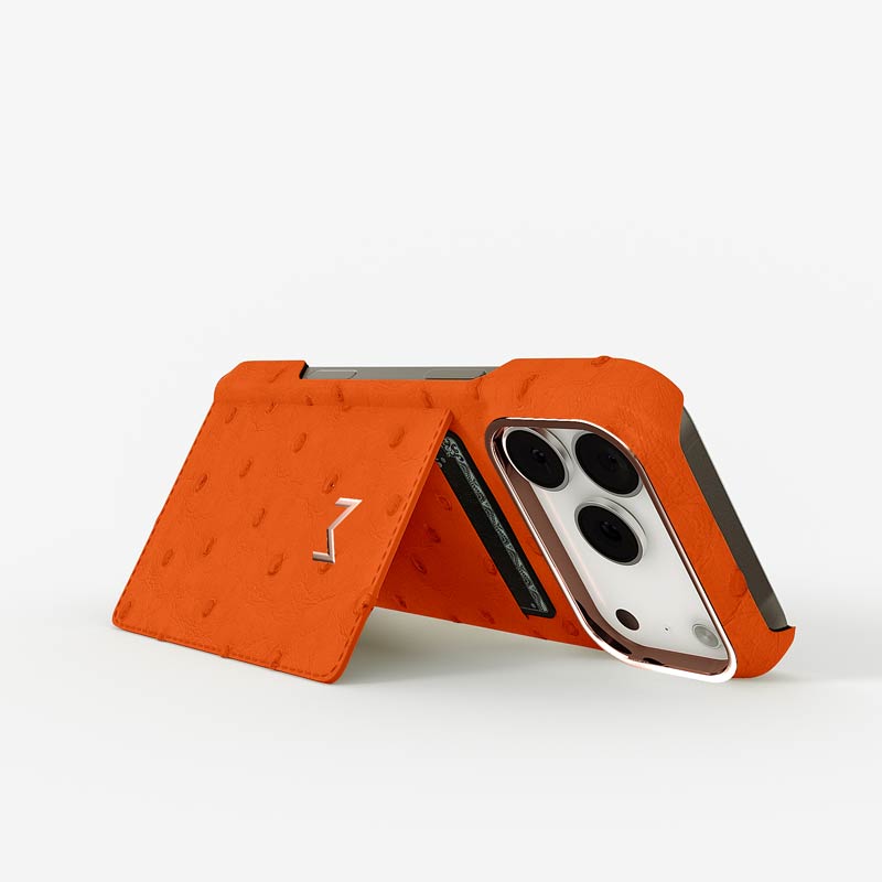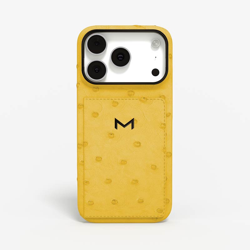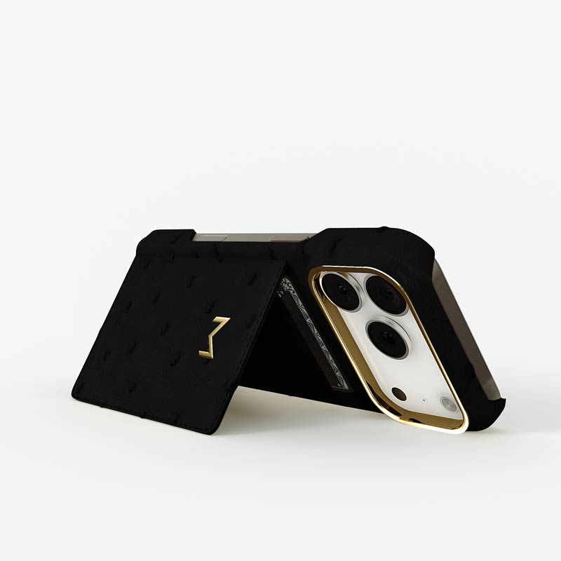 Exclusively made to order and entirely handcrafted, this iPhone 17 Pro Max case is sheathed in hand-selected, full-quill ostrich leather — valued for its supple texture, natural markings, and unmistakable character. Inside, a soft Alcantara lining cradles your device, preserving its flawless condition. The hand-polished 316L stainless steel logo and camera ring reflect a commitment to detail and craftsmanship rarely seen.