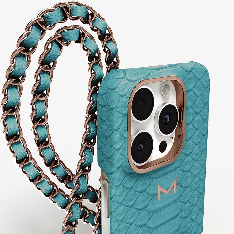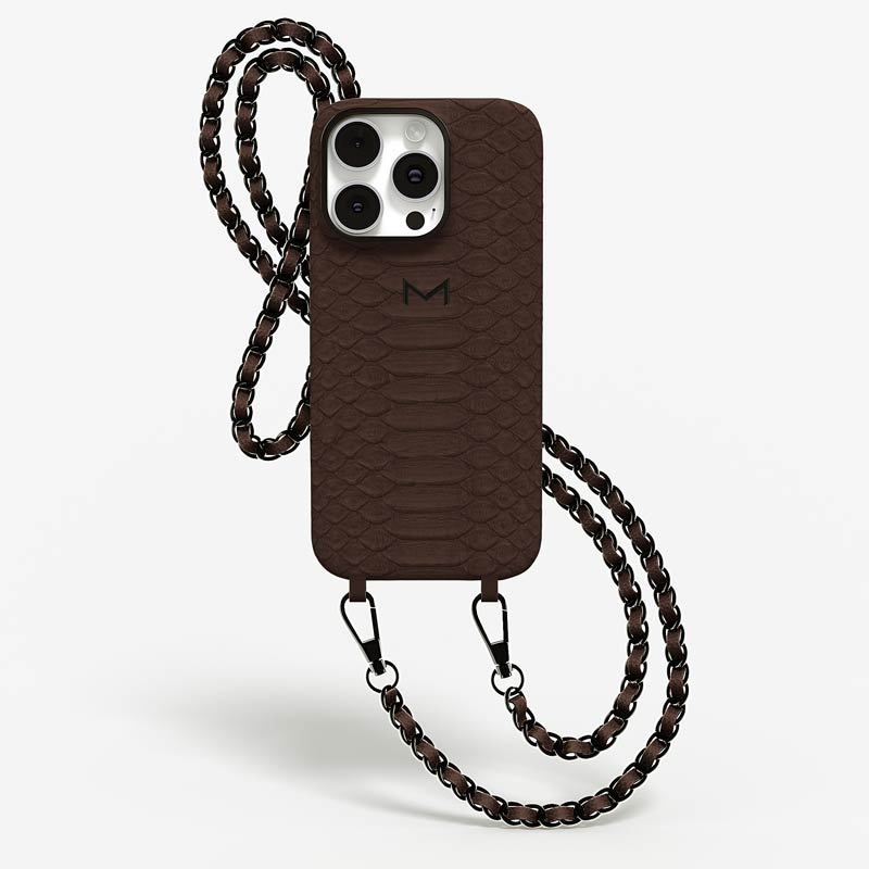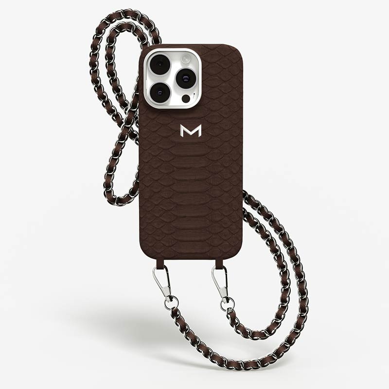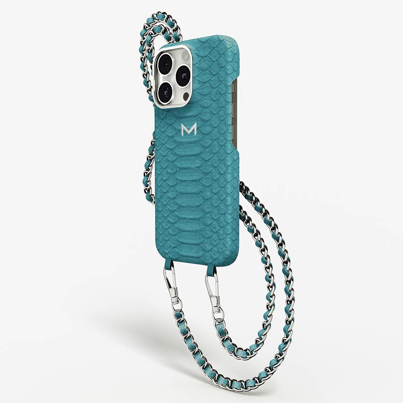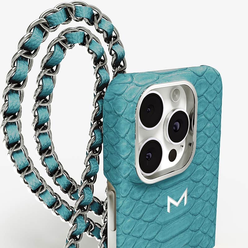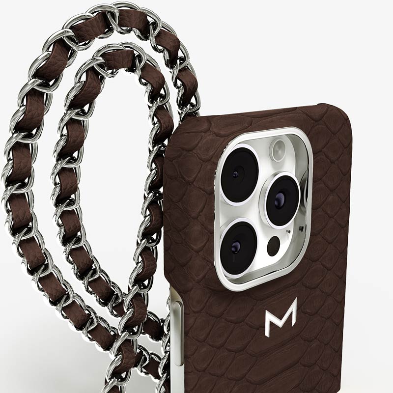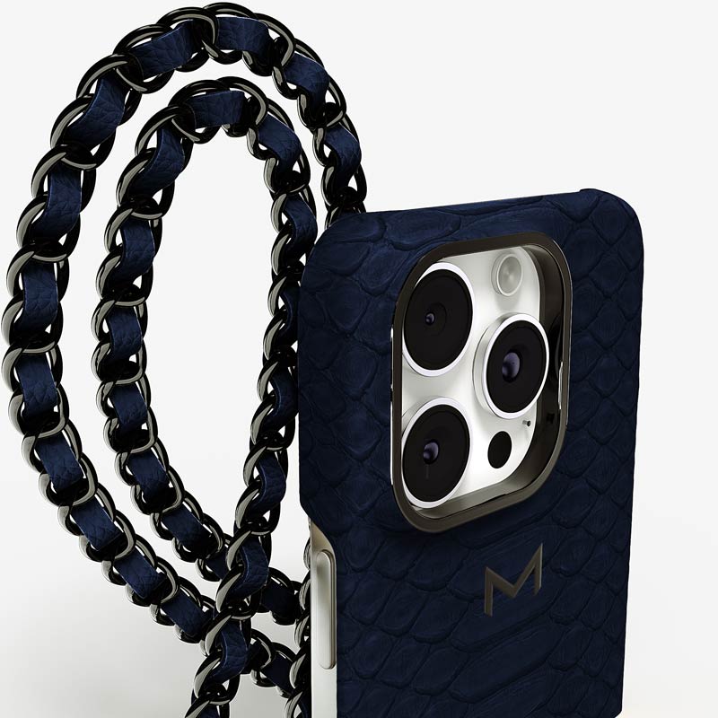 Exclusively made to order and entirely handcrafted, this iPhone 15 Pro case is sheathed in hand-selected python leather — chosen for its exotic texture, unique scale pattern, and bold presence. Inside, a soft Alcantara lining cradles your device, preserving its flawless condition. The hand-polished 316L stainless steel logo and leather-interlaced metal chain reflect a commitment to detail and craftsmanship rarely seen.