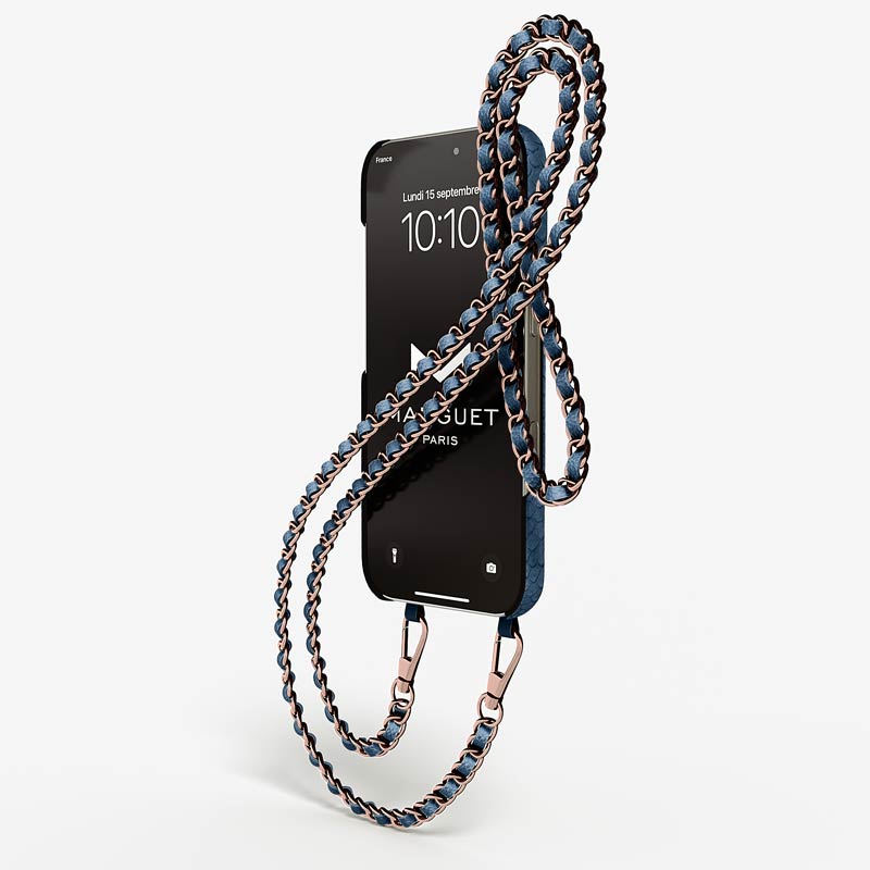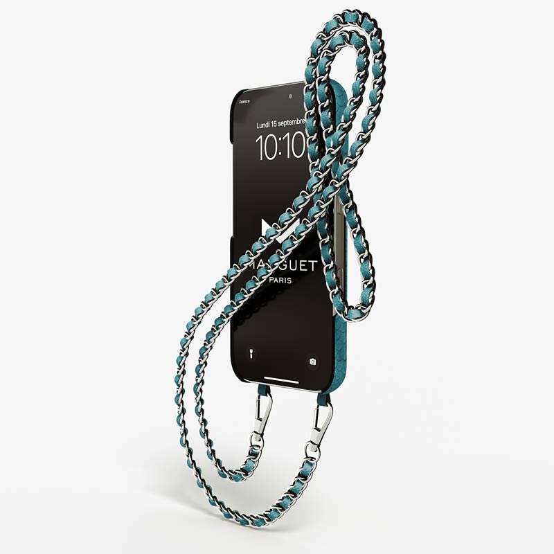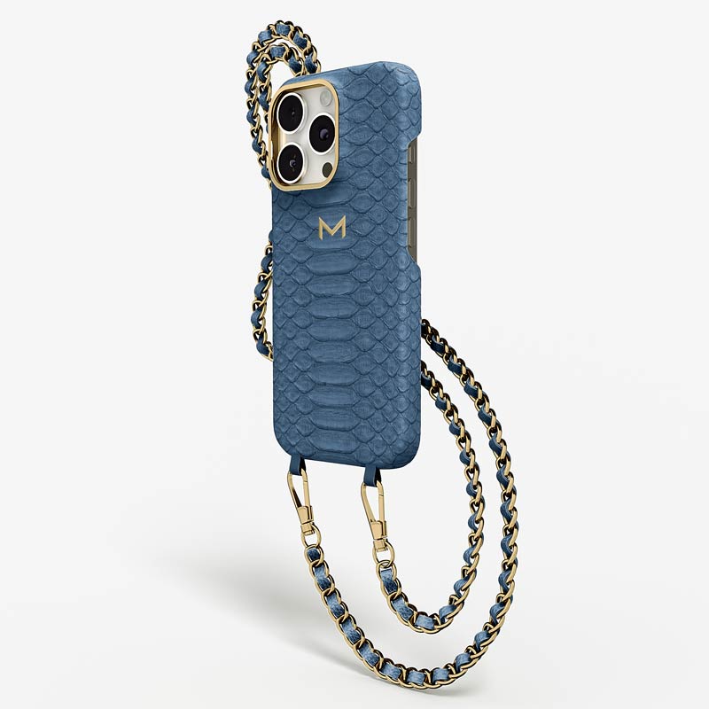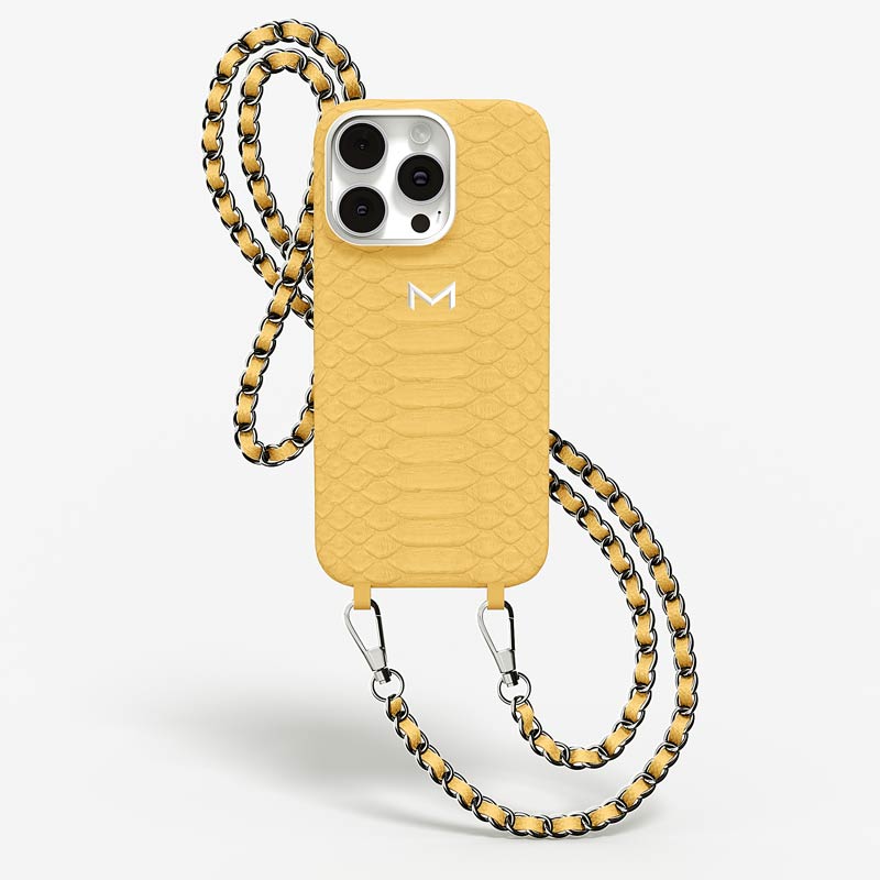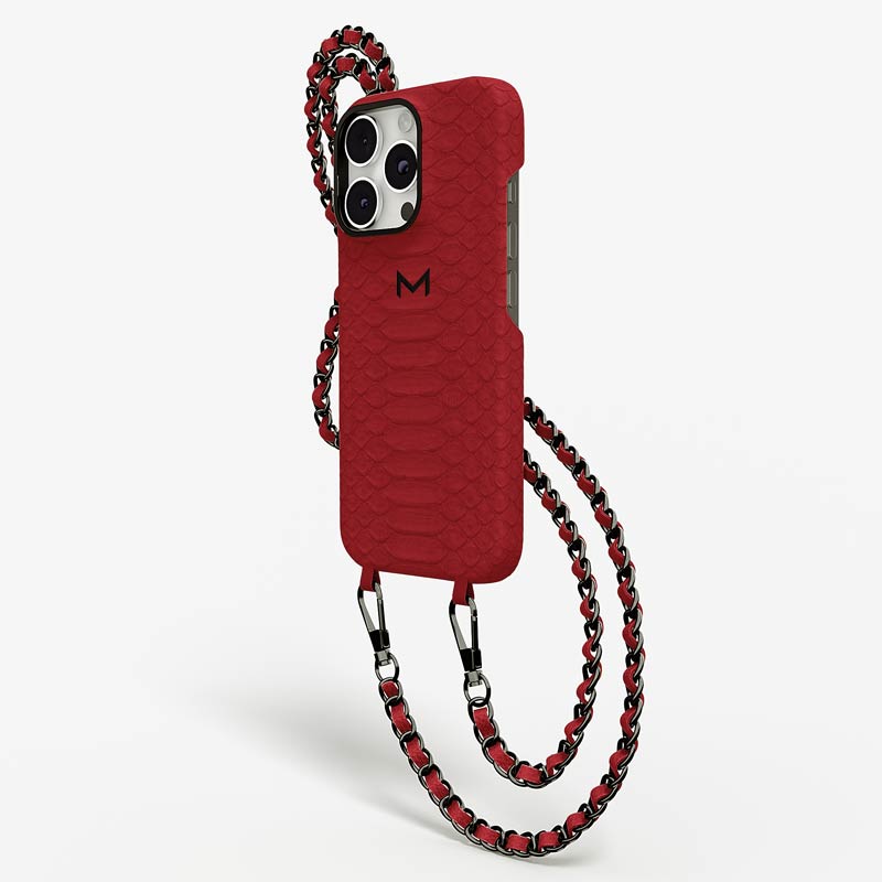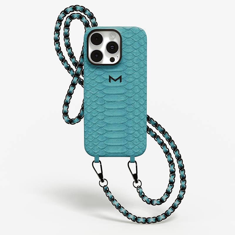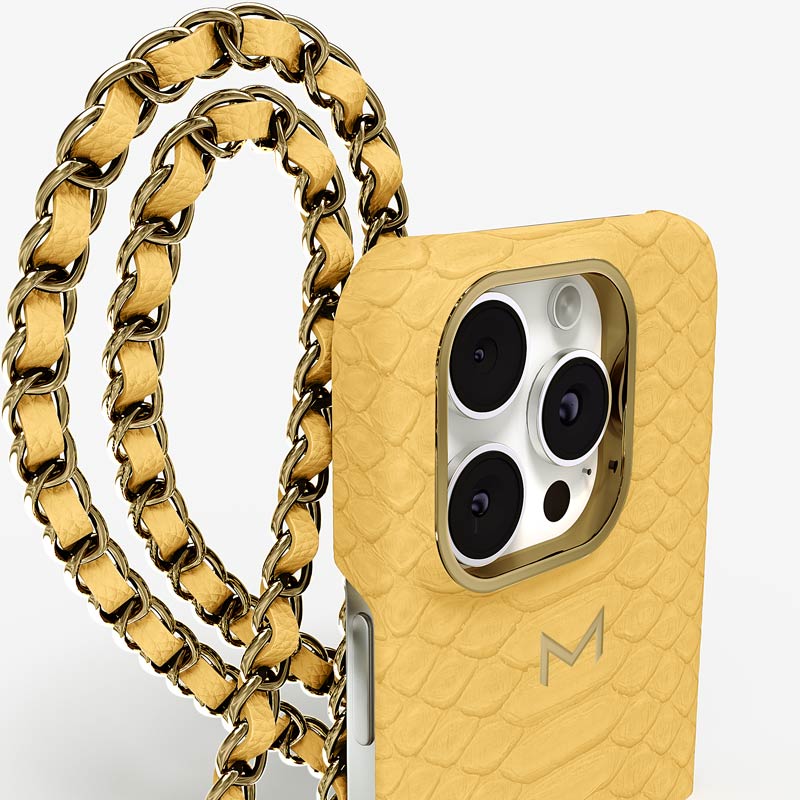 Exclusively made to order and entirely handcrafted, this iPhone 15 Pro case is sheathed in hand-selected python leather — chosen for its exotic texture, unique scale pattern, and bold presence. Inside, a soft Alcantara lining cradles your device, preserving its flawless condition. The hand-polished 316L stainless steel logo and leather-interlaced metal chain reflect a commitment to detail and craftsmanship rarely seen.