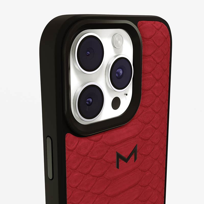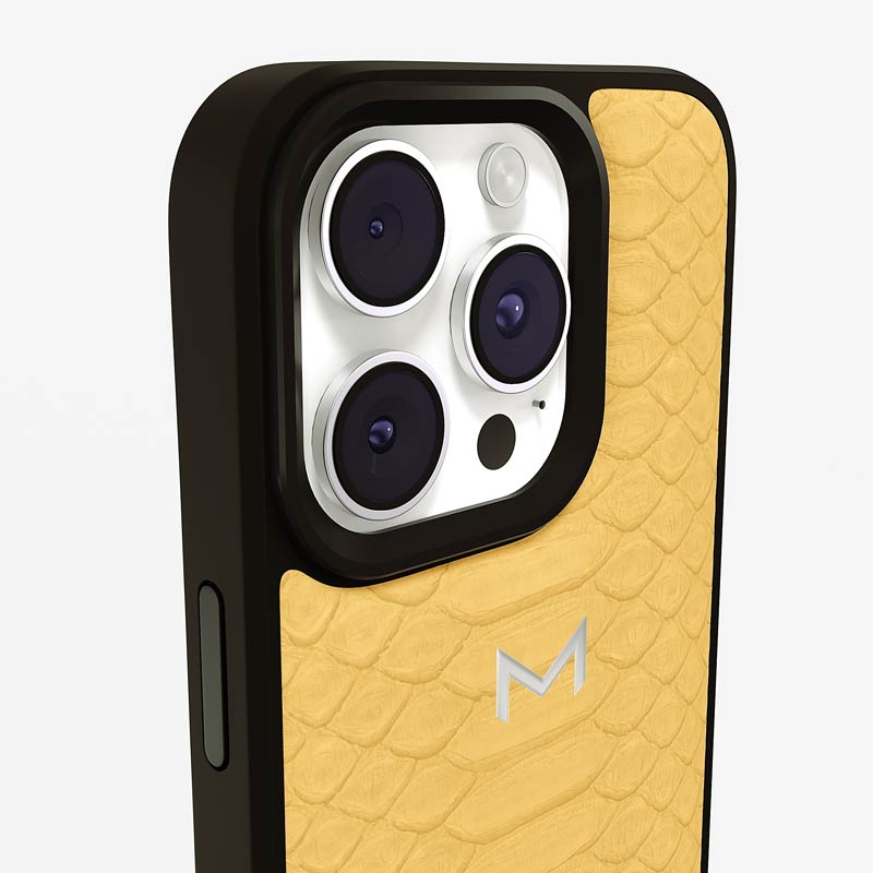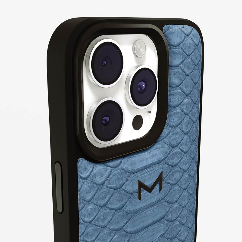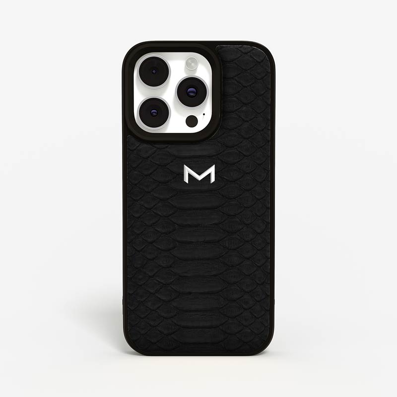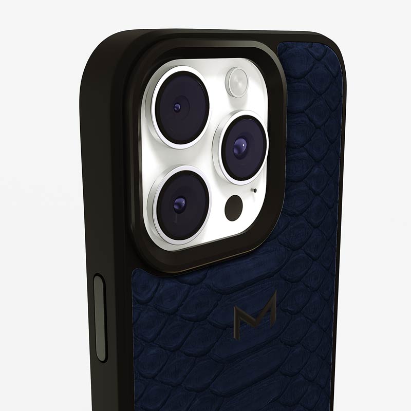 Exclusively made to order and entirely handcrafted, this iPhone 15 Pro case is sheathed in hand-selected python leather — chosen for its exotic texture, unique scale pattern, and bold presence. Inside, a soft Alcantara lining cradles your device, preserving its flawless condition. The hand-polished 316L stainless steel logo and camera ring reflect a commitment to detail and craftsmanship rarely seen.