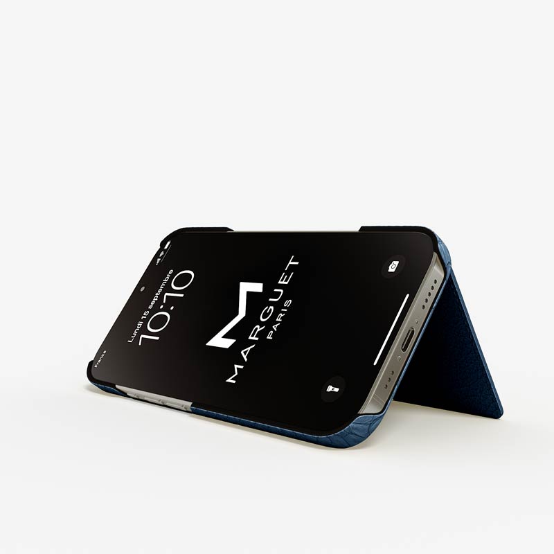 An elegant wallet design offers refined practicality, with one card slot on the case and one inside the flap. The flap also serves as a discreet stand for comfortable horizontal viewing.