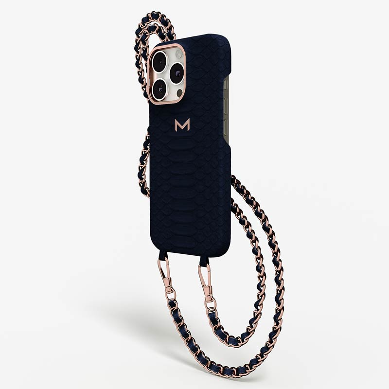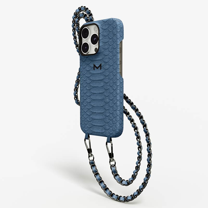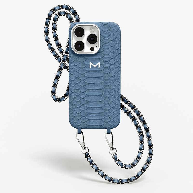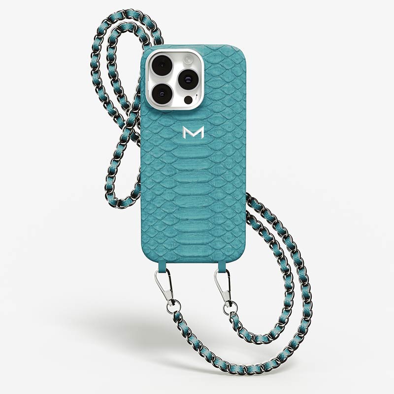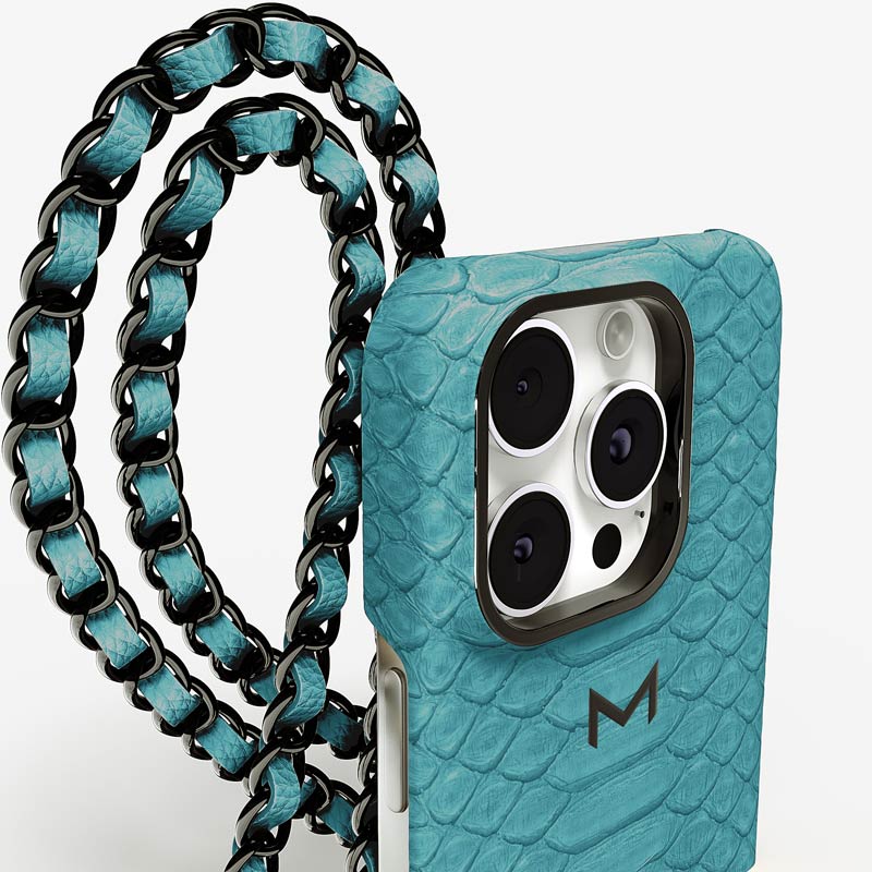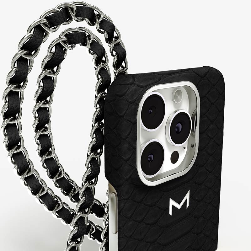 Exclusively made to order and entirely handcrafted, this iPhone 15 Pro Max case is sheathed in hand-selected python leather — chosen for its exotic texture, unique scale pattern, and bold presence. Inside, a soft Alcantara lining cradles your device, preserving its flawless condition. The hand-polished 316L stainless steel logo and leather-interlaced metal chain reflect a commitment to detail and craftsmanship rarely seen.