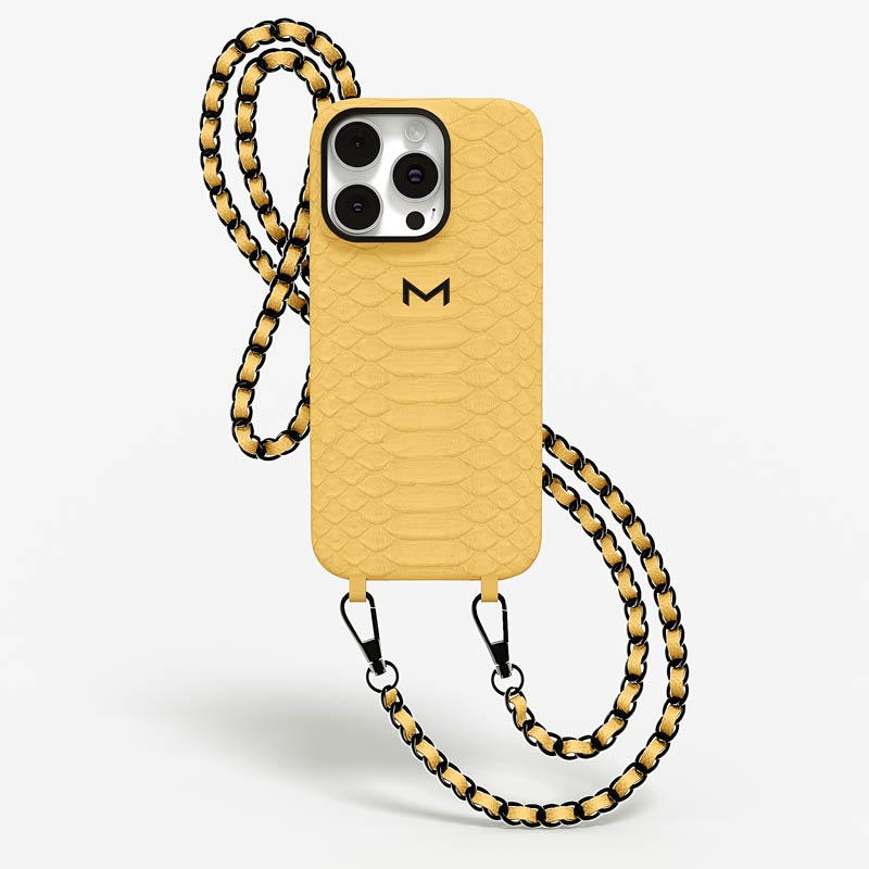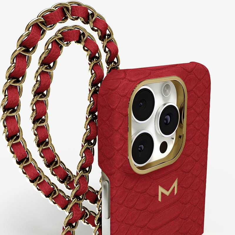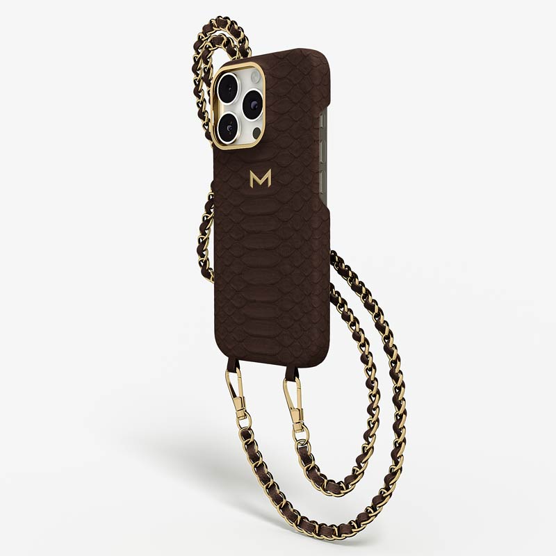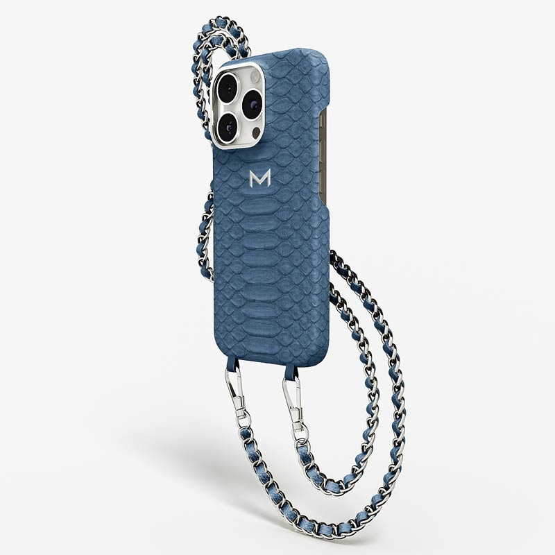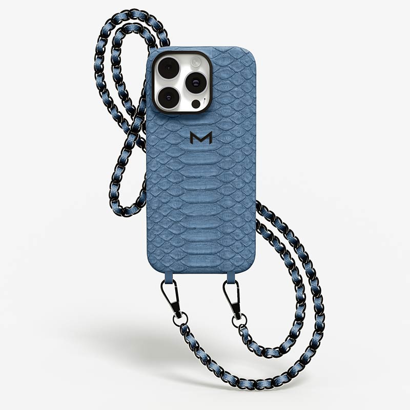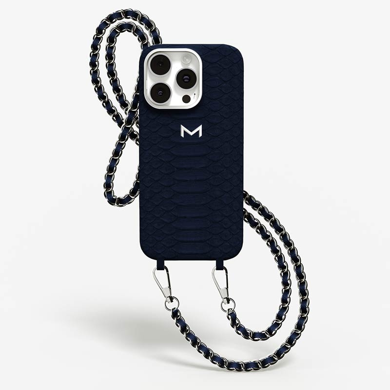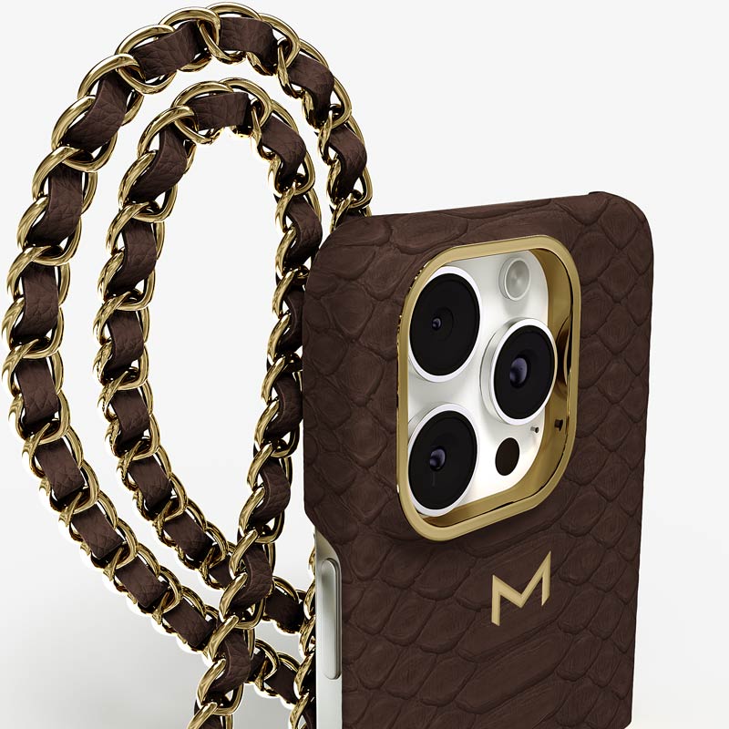 Exclusively made to order and entirely handcrafted, this iPhone 15 Pro Max case is sheathed in hand-selected python leather — chosen for its exotic texture, unique scale pattern, and bold presence. Inside, a soft Alcantara lining cradles your device, preserving its flawless condition. The hand-polished 316L stainless steel logo and leather-interlaced metal chain reflect a commitment to detail and craftsmanship rarely seen.