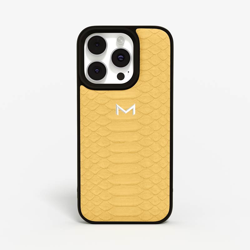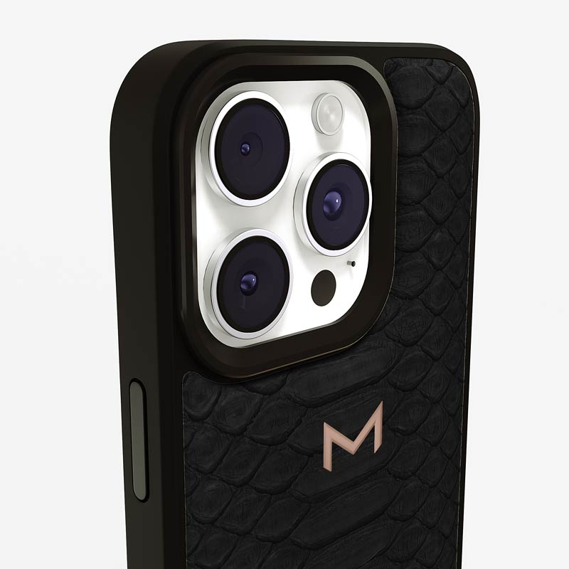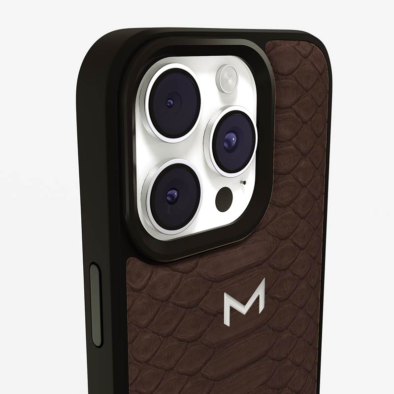Exclusively made to order and entirely handcrafted, this iPhone 16 Pro case is sheathed in hand-selected python leather — chosen for its exotic texture, unique scale pattern, and bold presence. Inside, a soft Alcantara lining cradles your device, preserving its flawless condition. The hand-polished 316L stainless steel logo and camera ring reflect a commitment to detail and craftsmanship rarely seen.