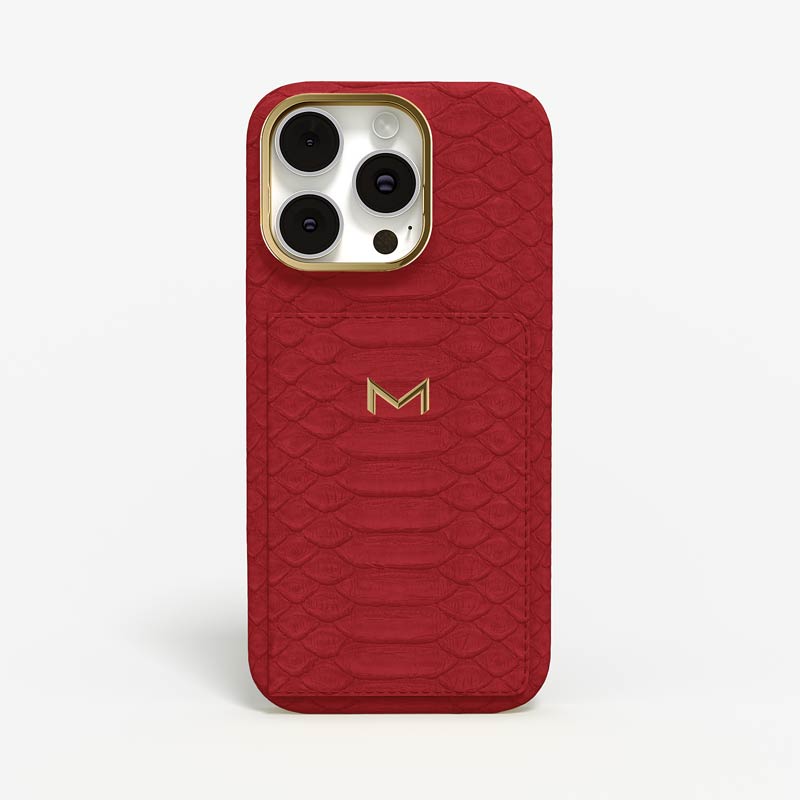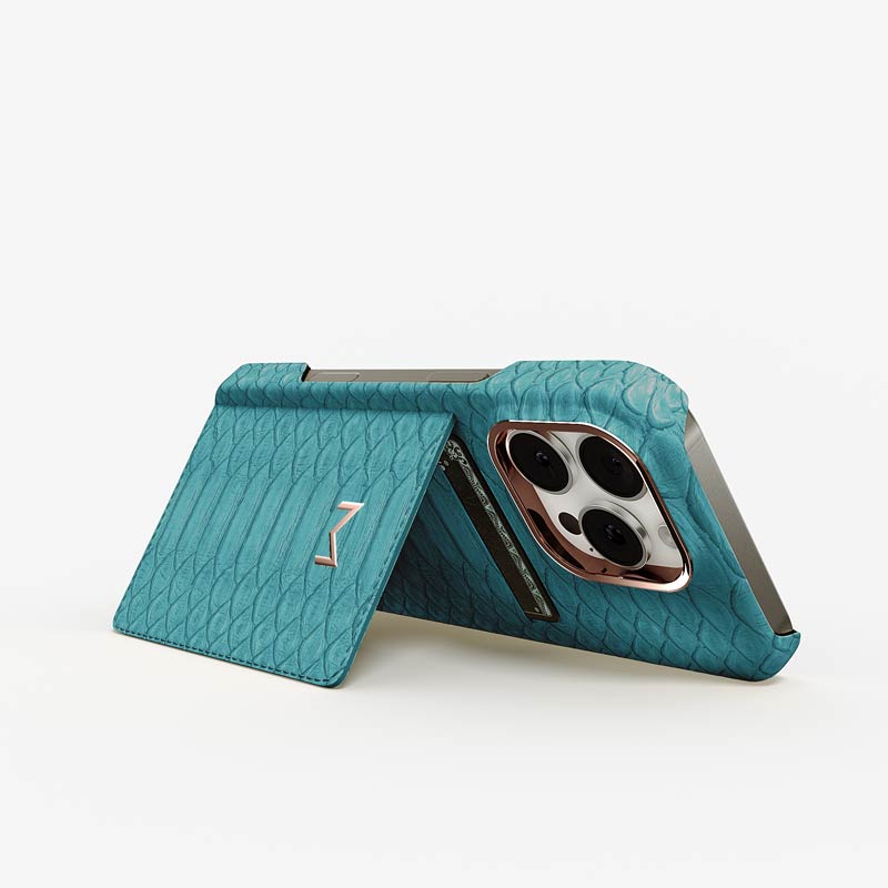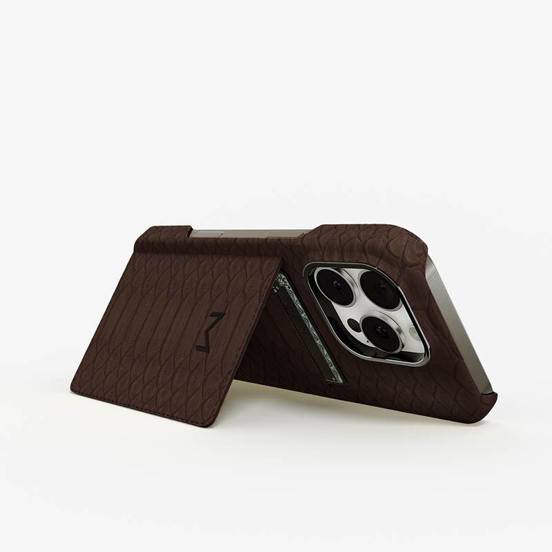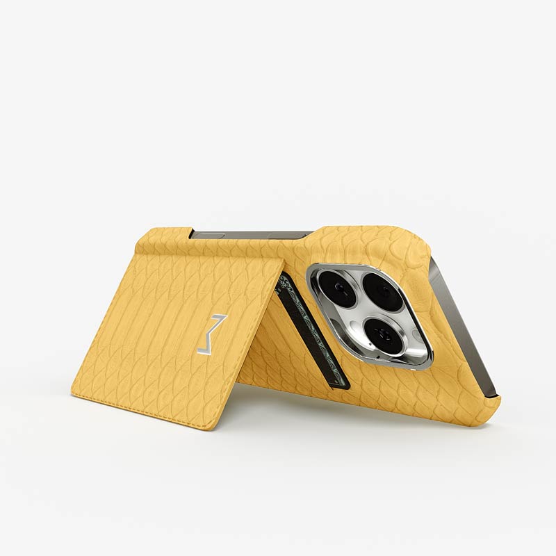 Exclusively made to order and entirely handcrafted, this iPhone 16 Pro case is sheathed in hand-selected python leather — chosen for its exotic texture, unique scale pattern, and bold presence. Inside, a soft Alcantara lining cradles your device, preserving its flawless condition. The hand-polished 316L stainless steel logo and camera ring reflect a commitment to detail and craftsmanship rarely seen.
