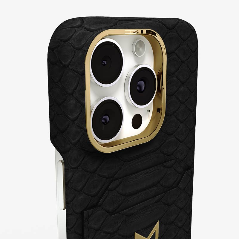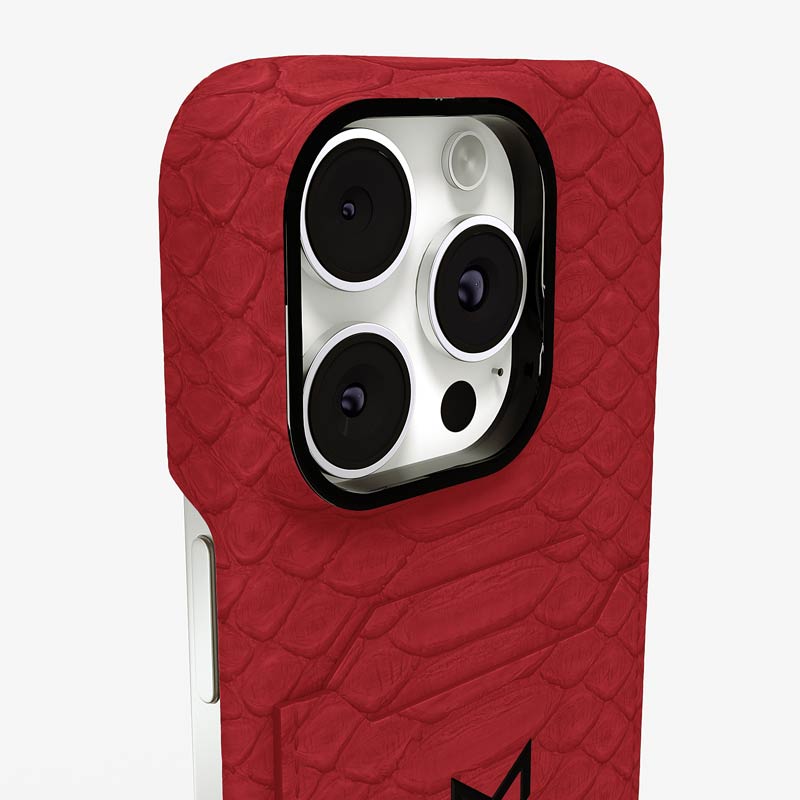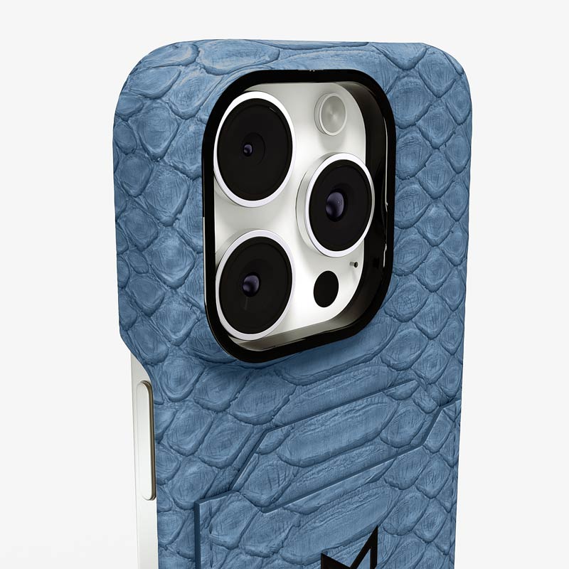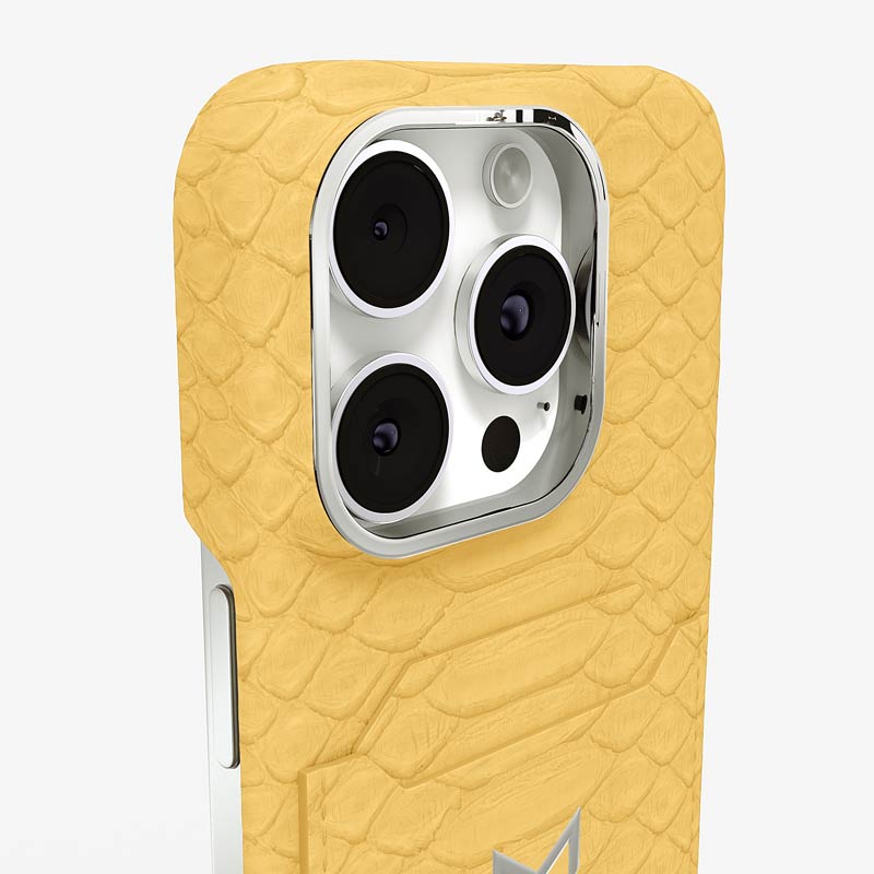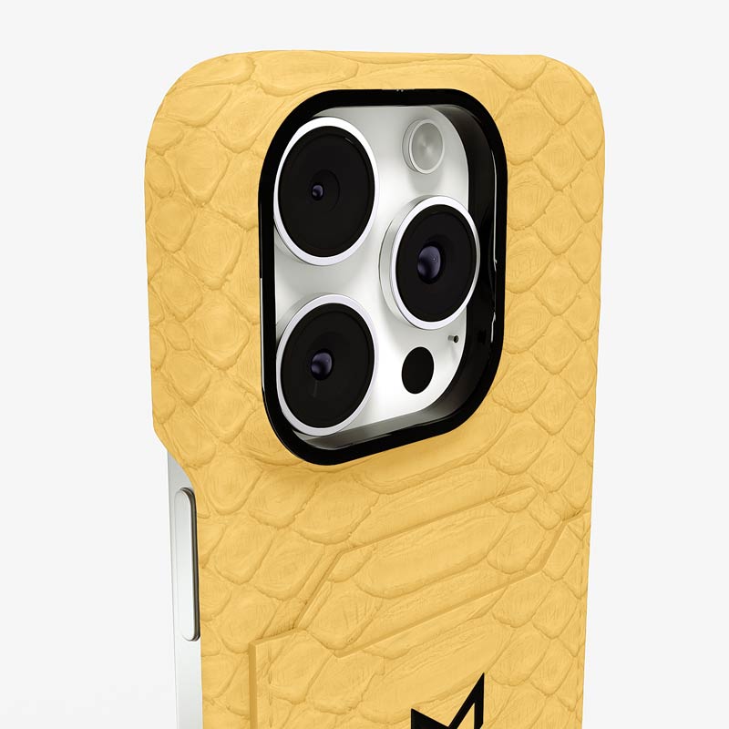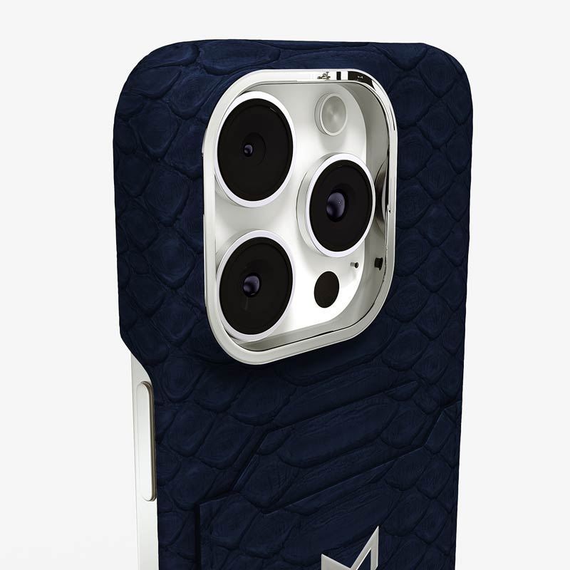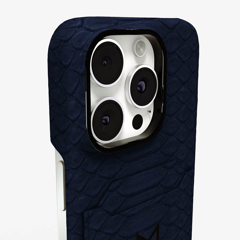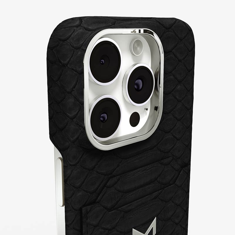 Exclusively made to order and entirely handcrafted, this iPhone 16 Pro Max case is sheathed in hand-selected python leather — chosen for its exotic texture, unique scale pattern, and bold presence. Inside, a soft Alcantara lining cradles your device, preserving its flawless condition. The hand-polished 316L stainless steel logo and camera ring reflect a commitment to detail and craftsmanship rarely seen.