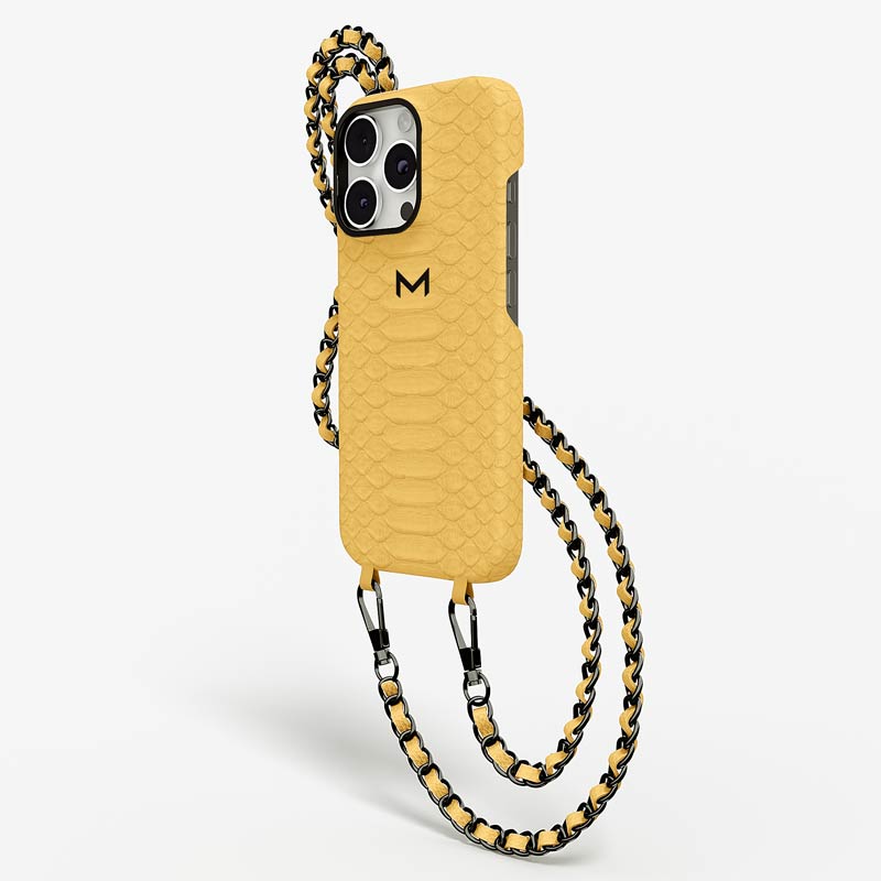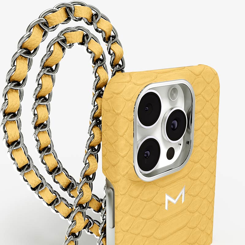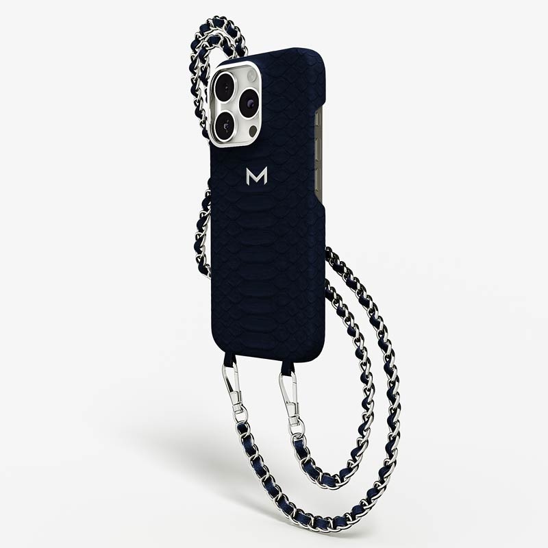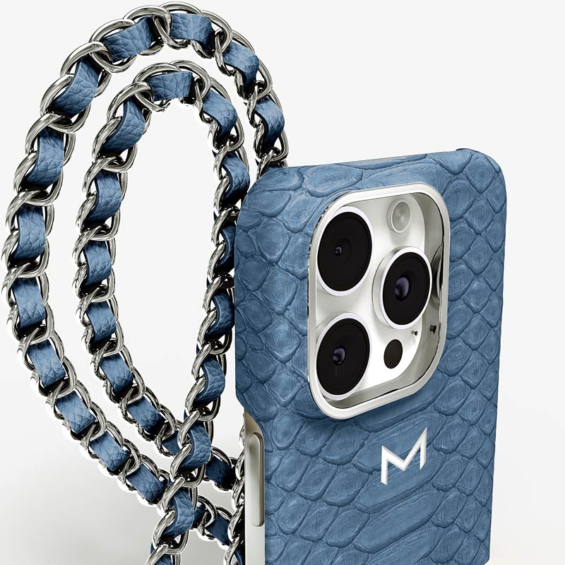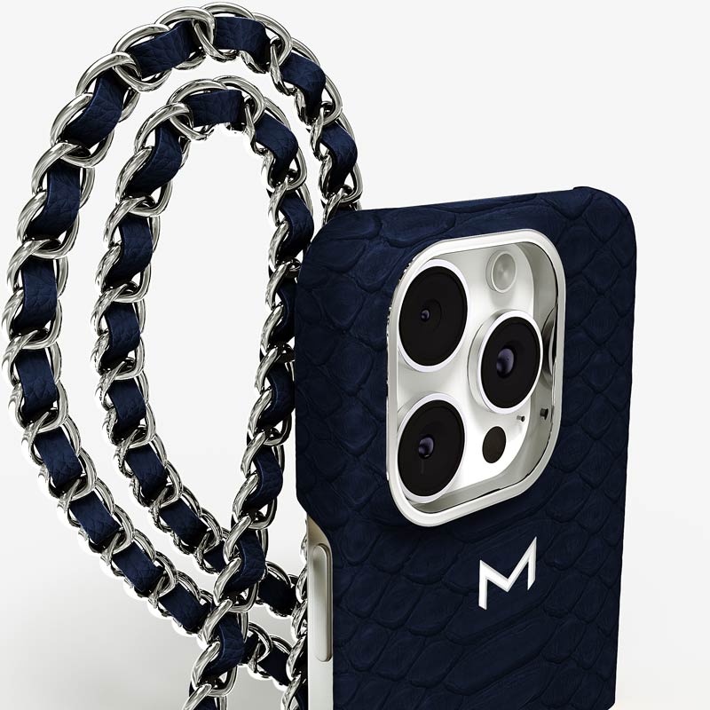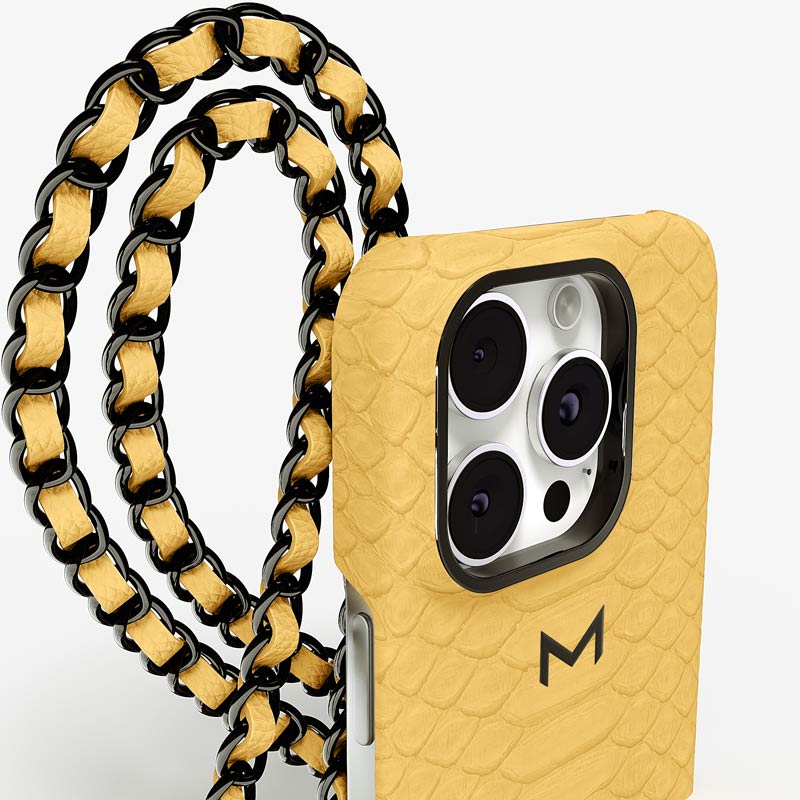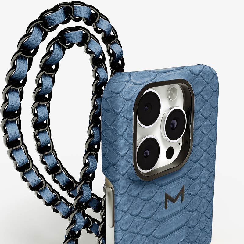 Exclusively made to order and entirely handcrafted, this iPhone 16 Pro Max case is sheathed in hand-selected python leather — chosen for its exotic texture, unique scale pattern, and bold presence. Inside, a soft Alcantara lining cradles your device, preserving its flawless condition. The hand-polished 316L stainless steel logo and leather-interlaced metal chain reflect a commitment to detail and craftsmanship rarely seen.