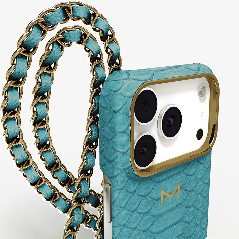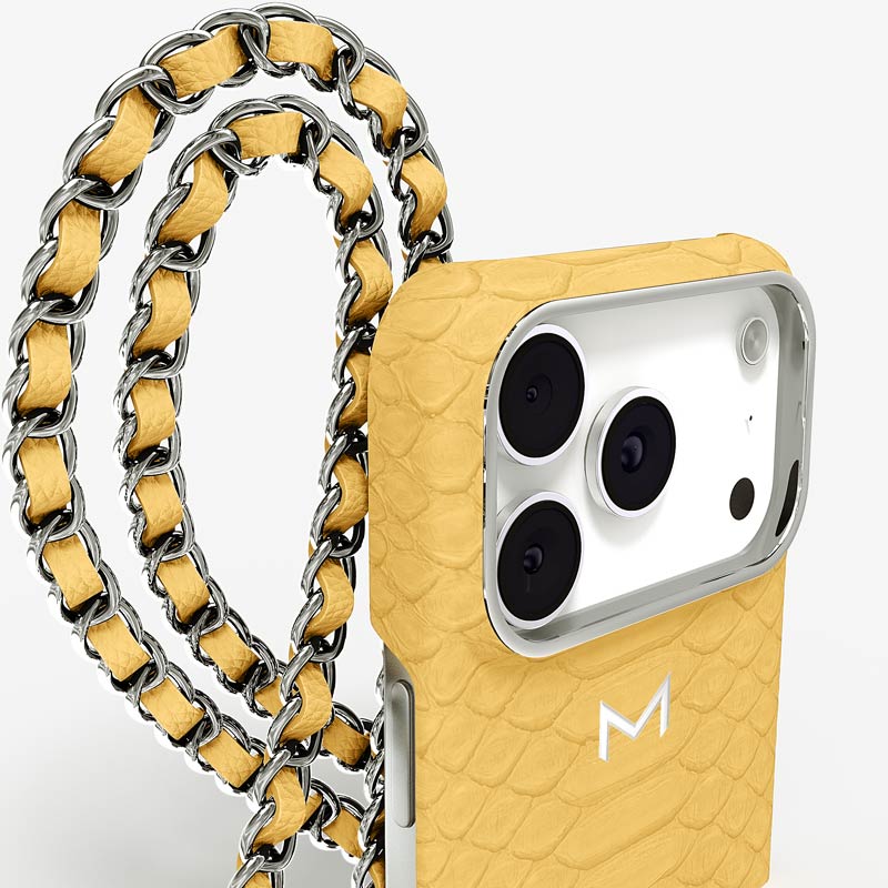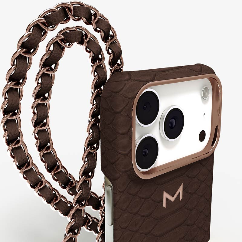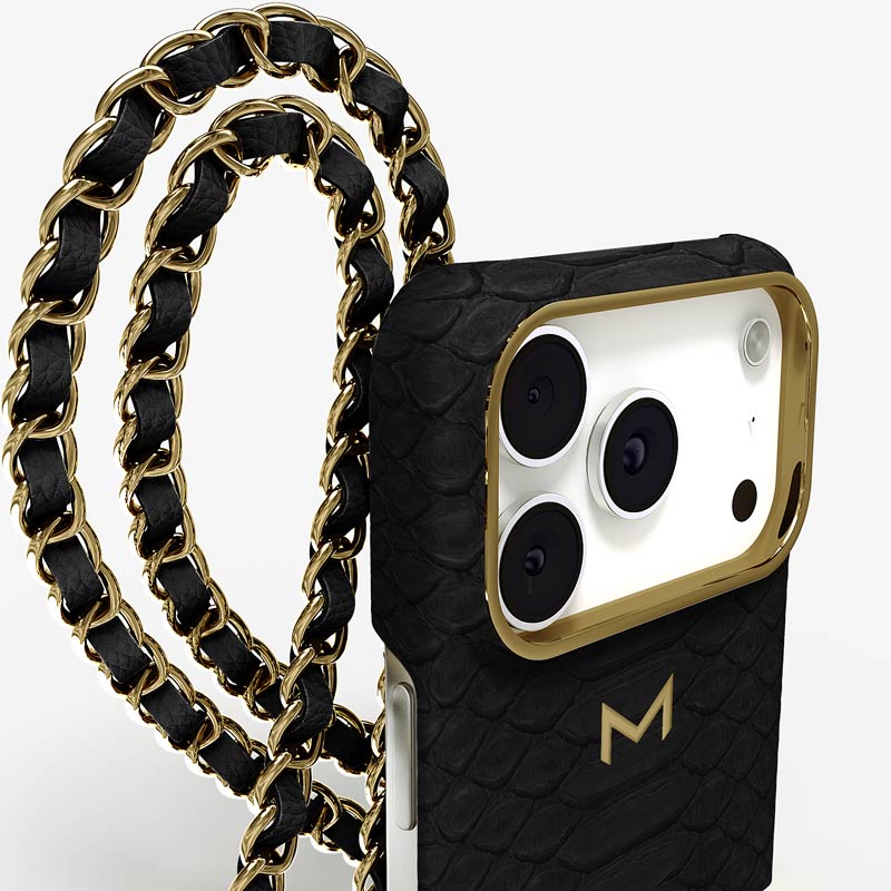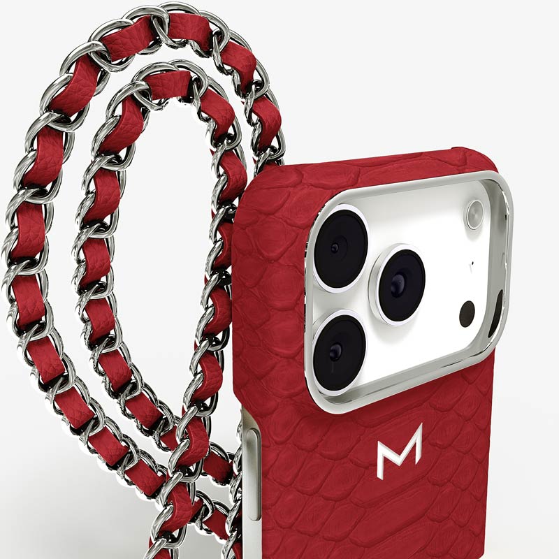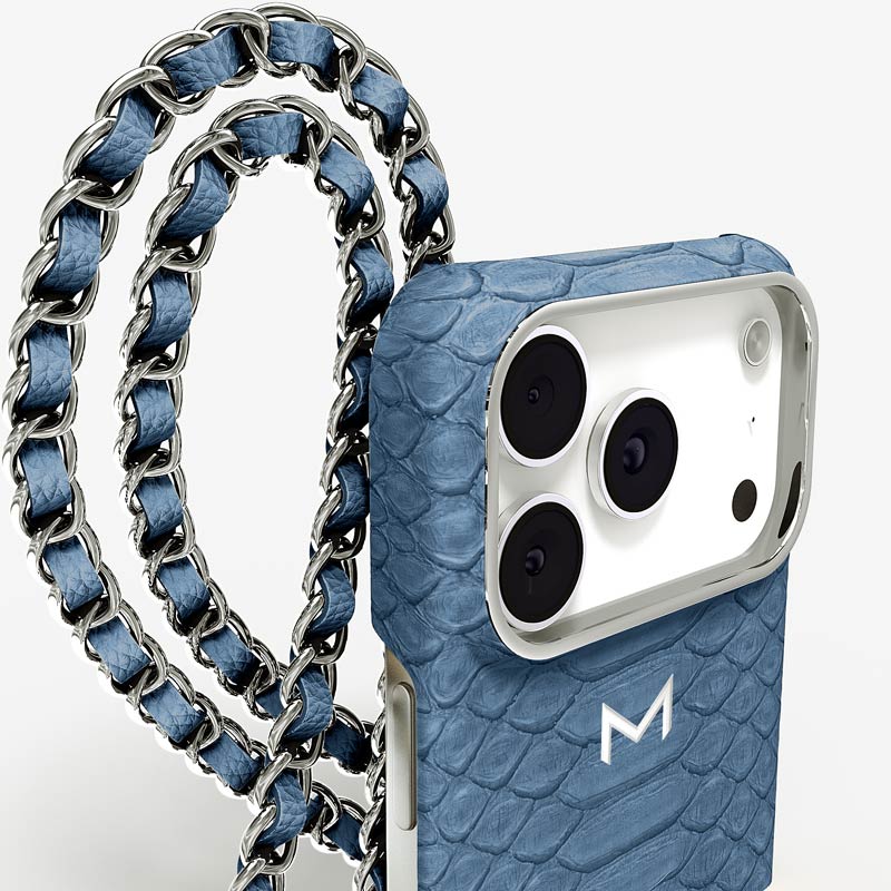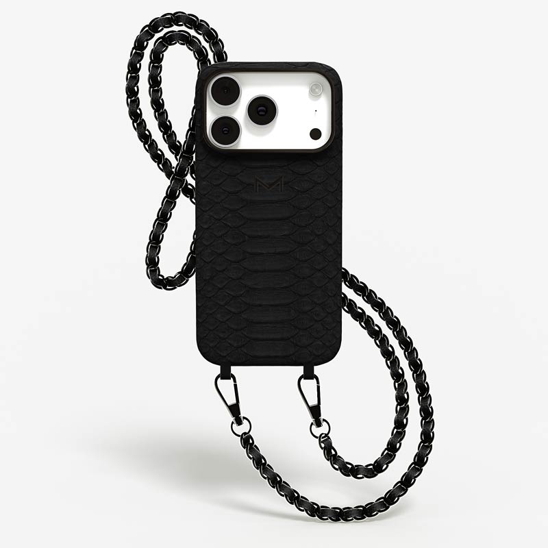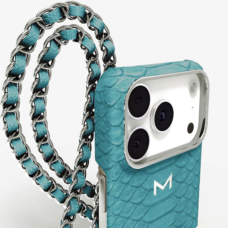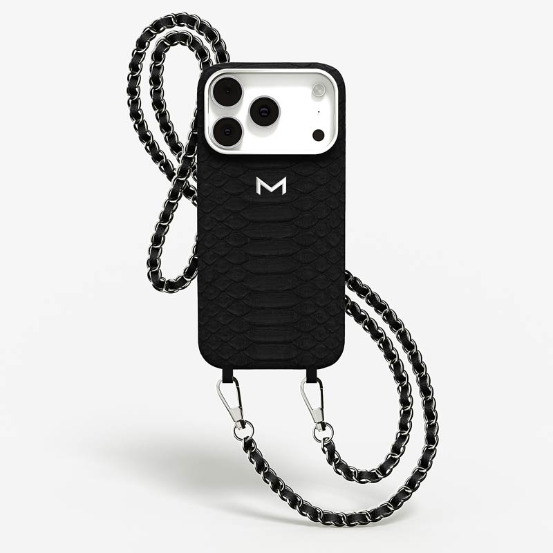 Exclusively made to order and entirely handcrafted, this iPhone 17 Pro case is sheathed in hand-selected python leather — chosen for its exotic texture, unique scale pattern, and bold presence. Inside, a soft Alcantara lining cradles your device, preserving its flawless condition. The hand-polished 316L stainless steel logo and leather-interlaced metal chain reflect a commitment to detail and craftsmanship rarely seen.